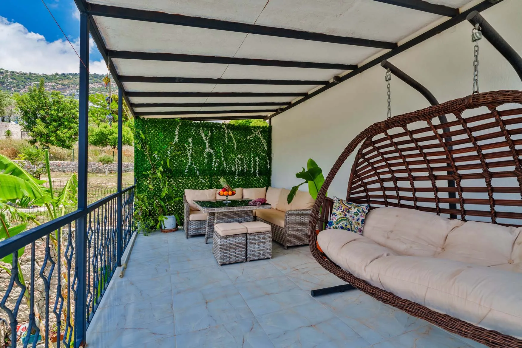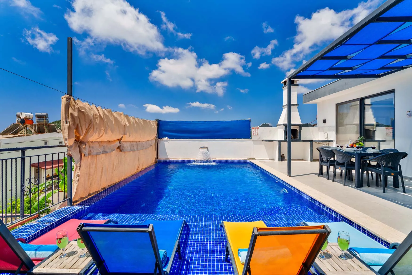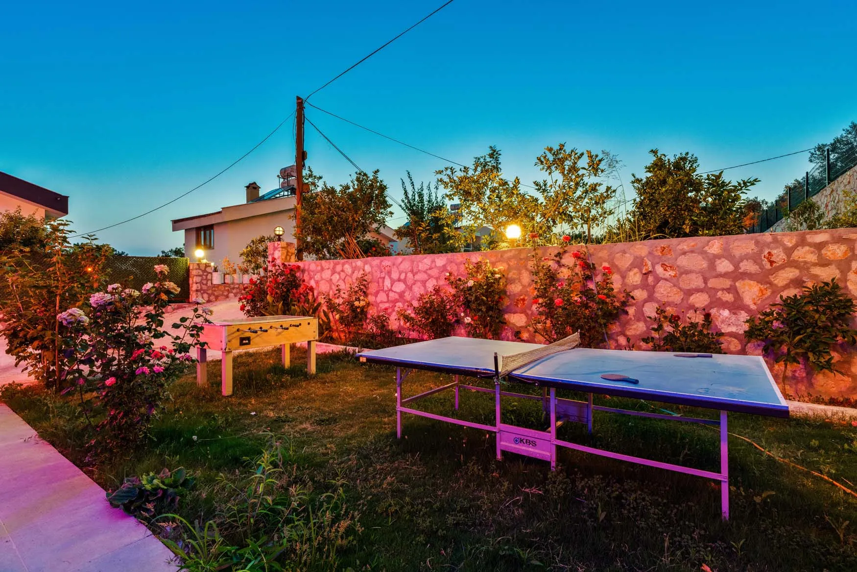 Detayları : Şezlong, güneşlenme  şemsiyesi, salıncak, masa tenisi, barbekü, yemek masası ve sandalyeleri bulunmaktadır.