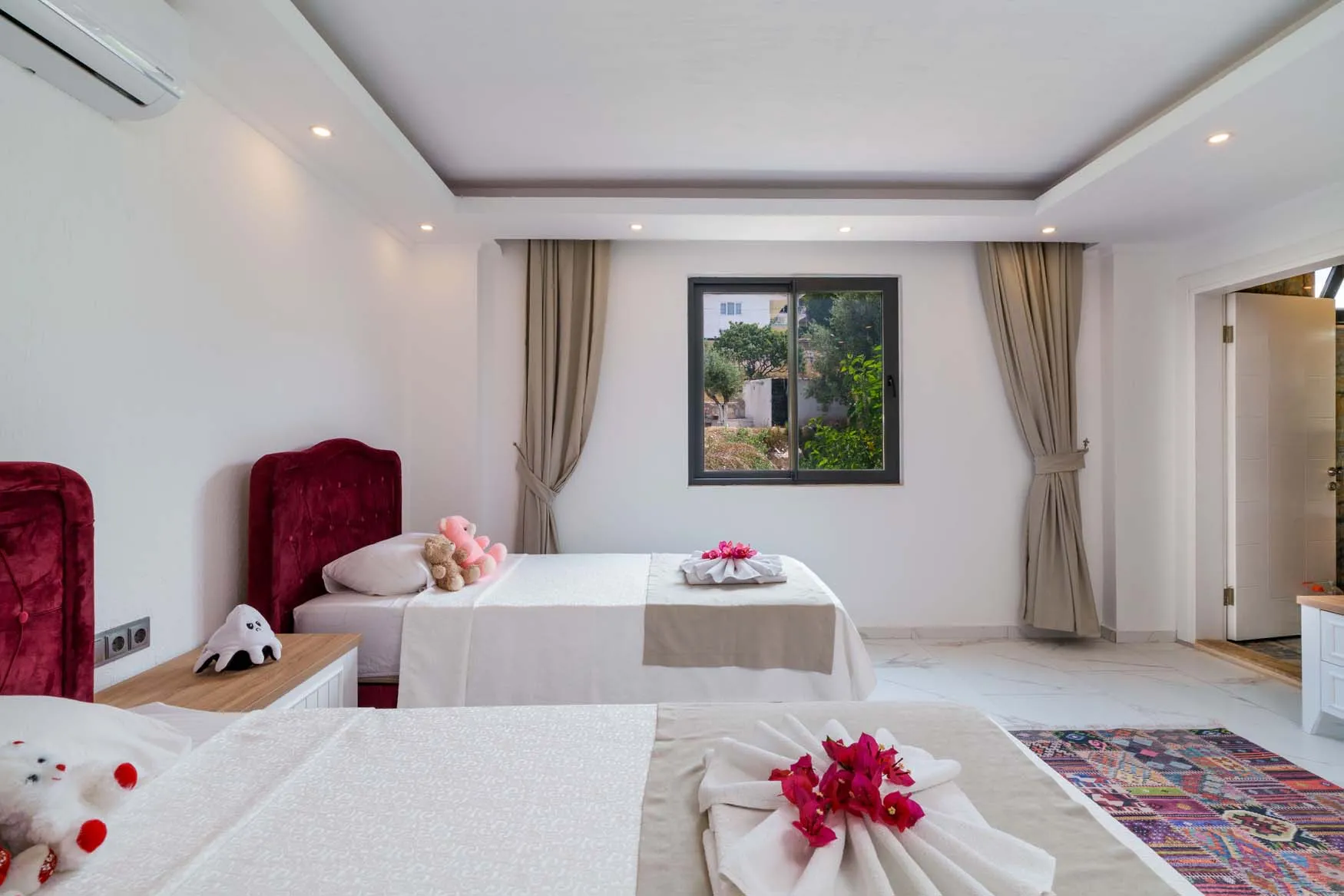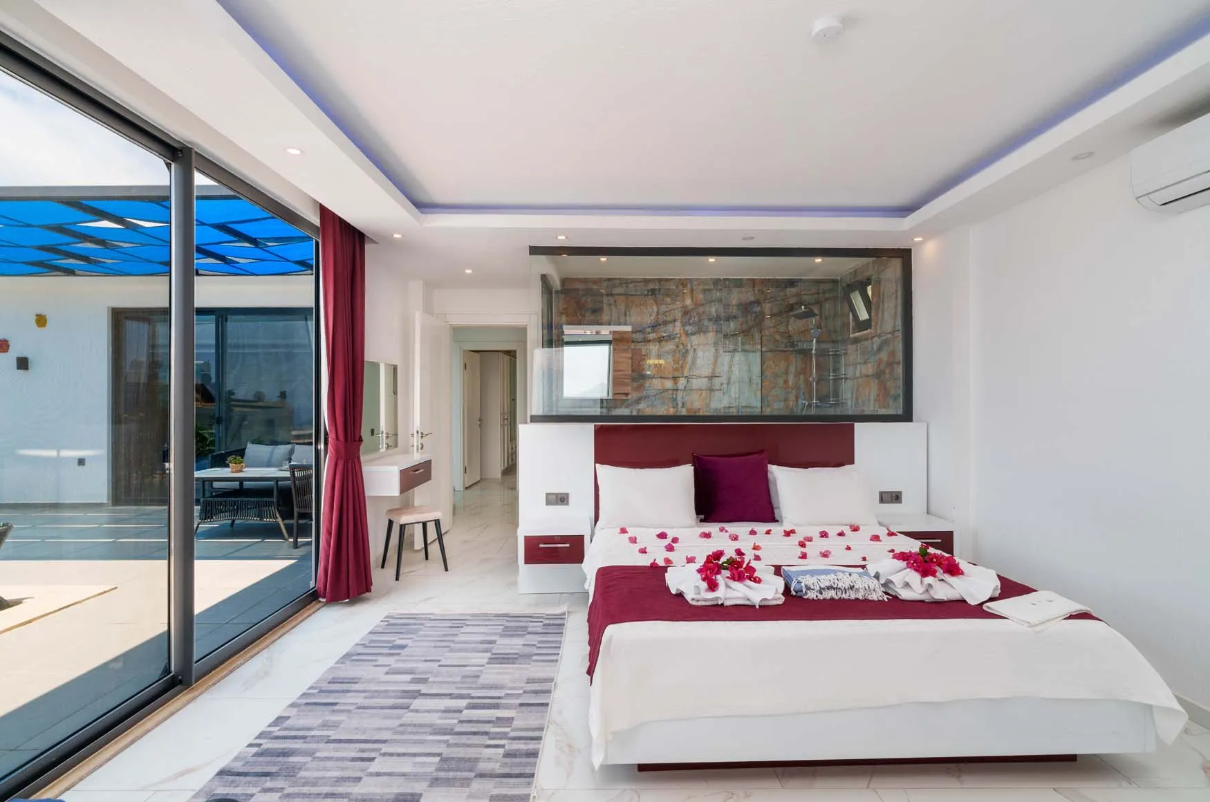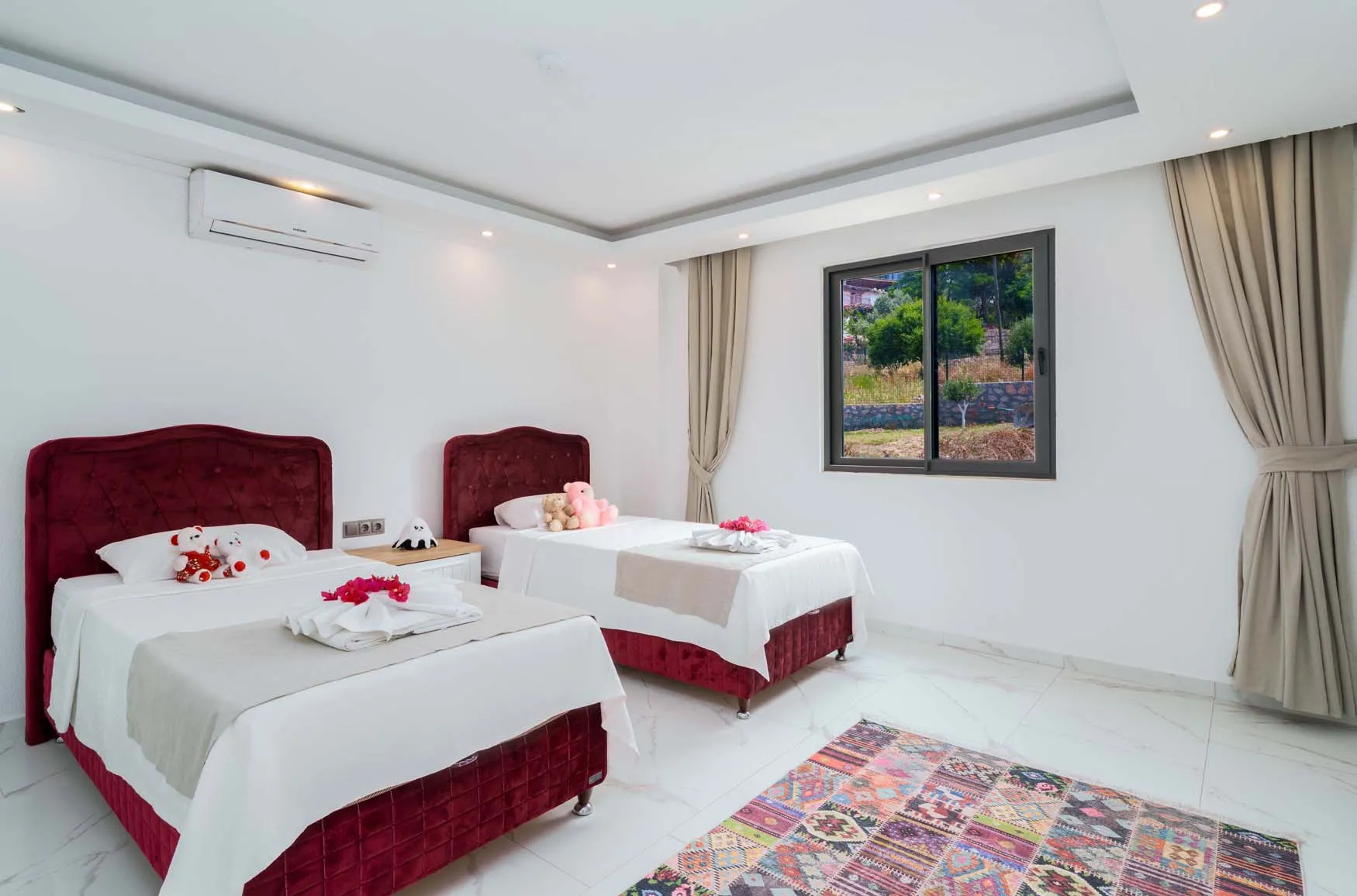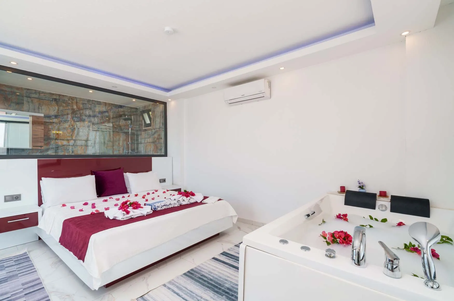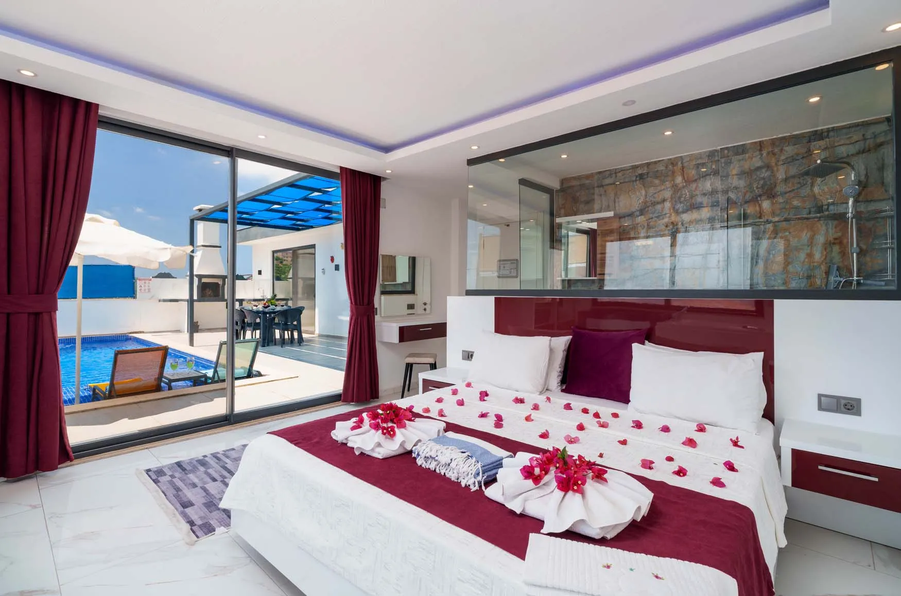 1.Yatak Odası Detayları : Çift kişilik yatak, klima, jakuzi, komodin, elbise dolabı, makyaj masası, banyo ve lavabo bulunmaktadır.