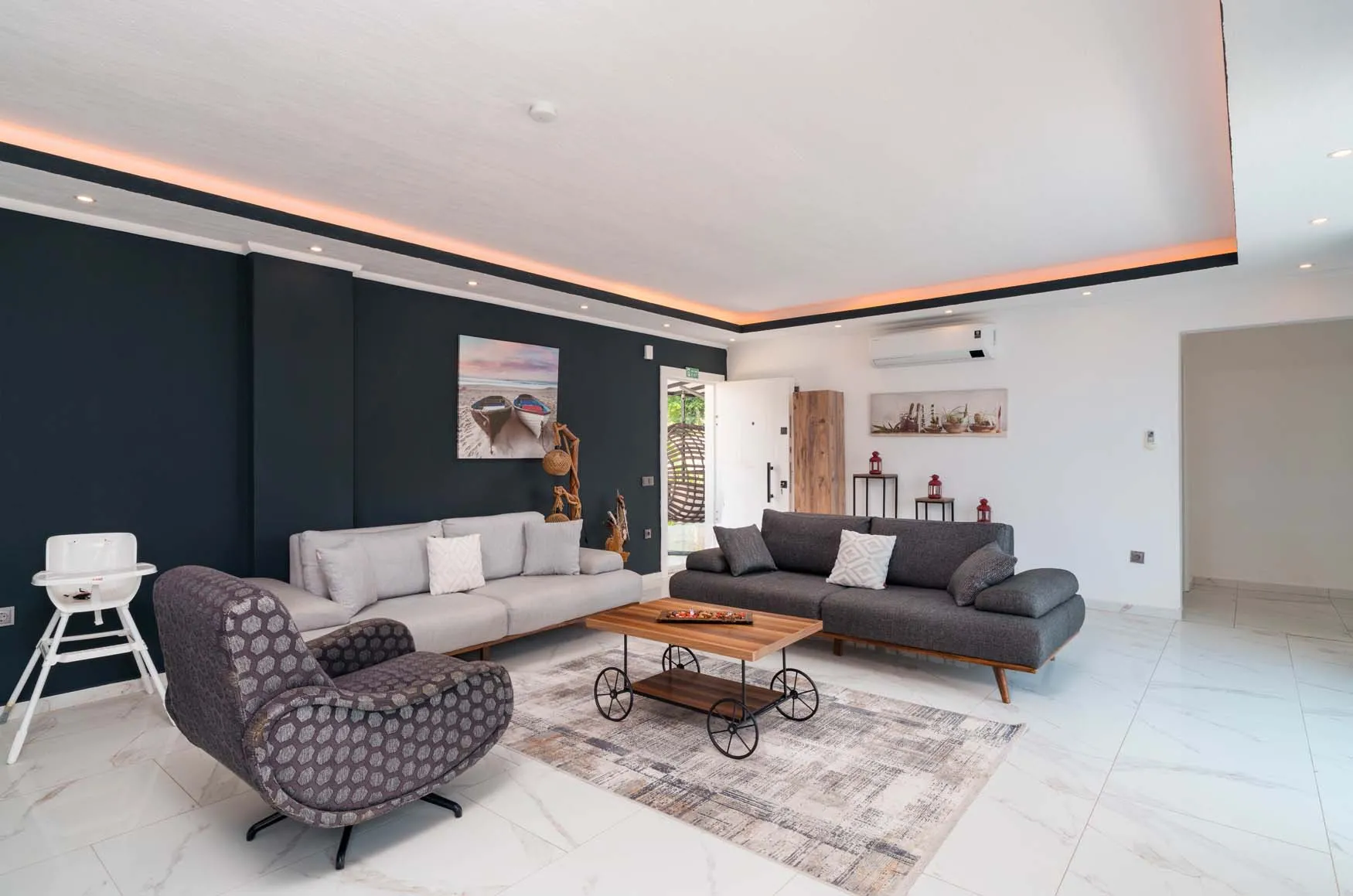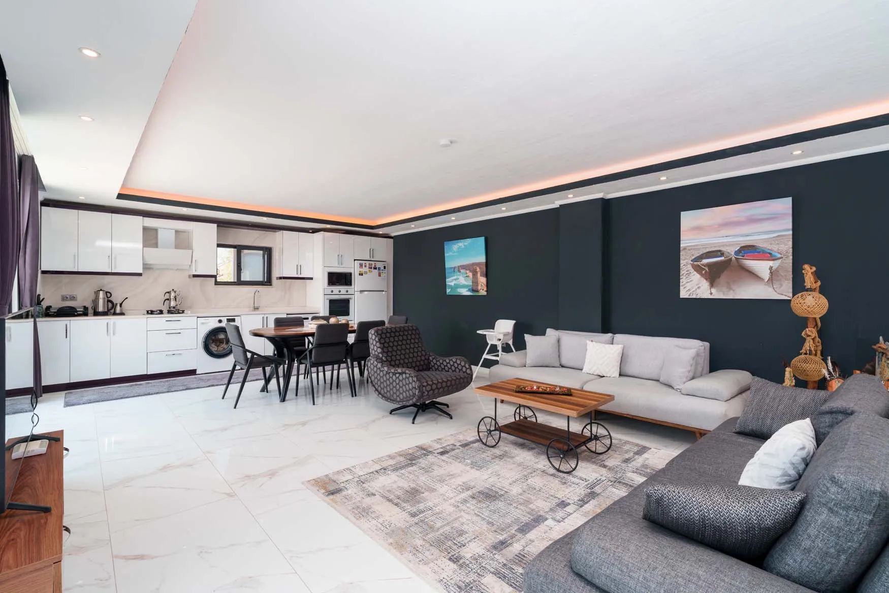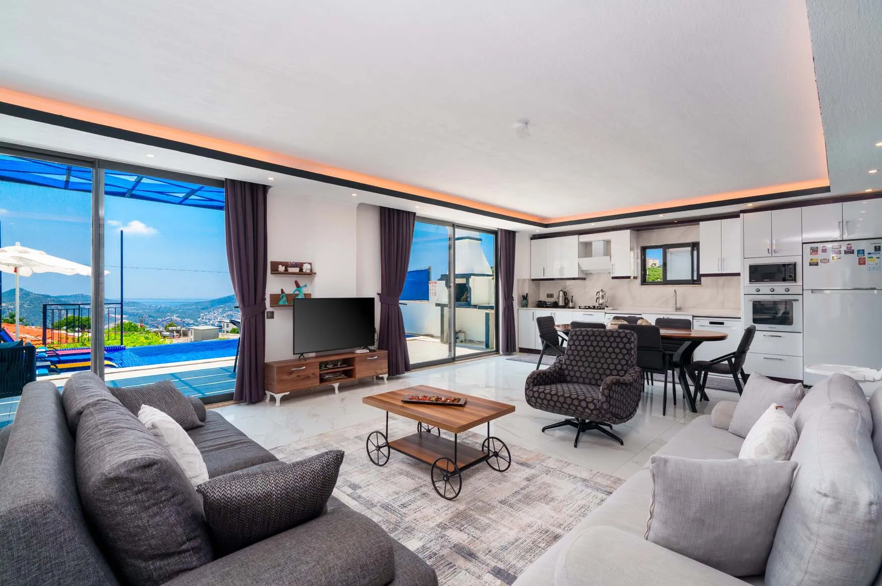 LCD TV, klima, modern oturma grubu, yemek masası ve sandalyeler, kablosuz modem bulunmaktadır.