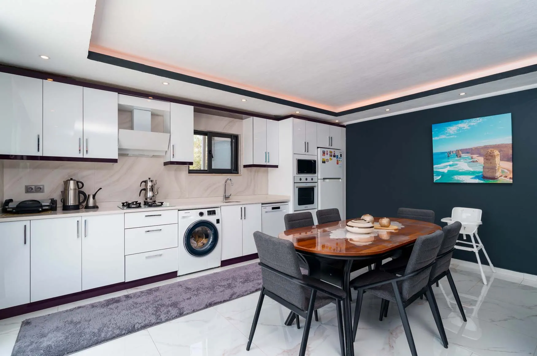 Buzdolabı, bulaşık makinesi, çamaşır makinesi, kahve makinası, çaycı, tost makinası, mikro dalga, 4 kişilik yemek takımı, tava-tencere, çatal-bıçak seti bulunmaktadır.