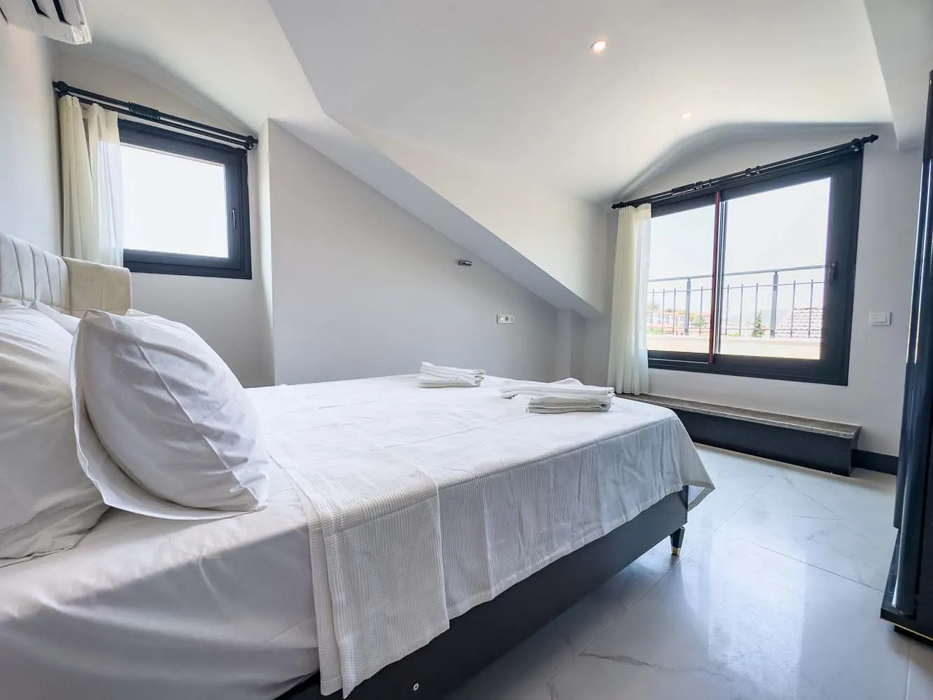 3.Yatak Odası (Teras Kat): Aile süiti — çift kişilik yatak, komodin, klima, elbise dolabı, banyo ve balkon.