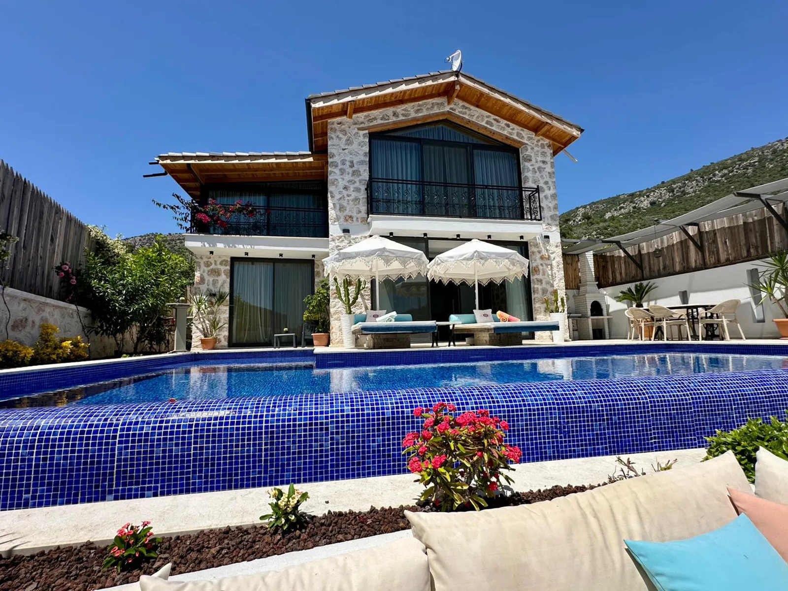 Kalkan Çayköy bölgesinde yer alan Villa Casa Perla, 6 kişi kapasiteli ve 3 yatak odalı bir villadır. Lüks dizaynı ve muhteşem dekoruyla, misafirlerimizin konforu düşünülerek tasarlanmıştır. Muhafazakar yapısıyla aileler ve balayı çiftleri için idealdir. Geniş bahçe alanı, terası, barbekü alanı ve eğlenceli vakitler geçirebileceğiniz bilardo masası bulunmaktadır. Doğa ile iç içe olan villamızda kuş sesleri eşliğinde kahvenizi yudumlayabilir, yatak odasındaki jakuzide yılın yorgunluğunu atabilirsiniz.
