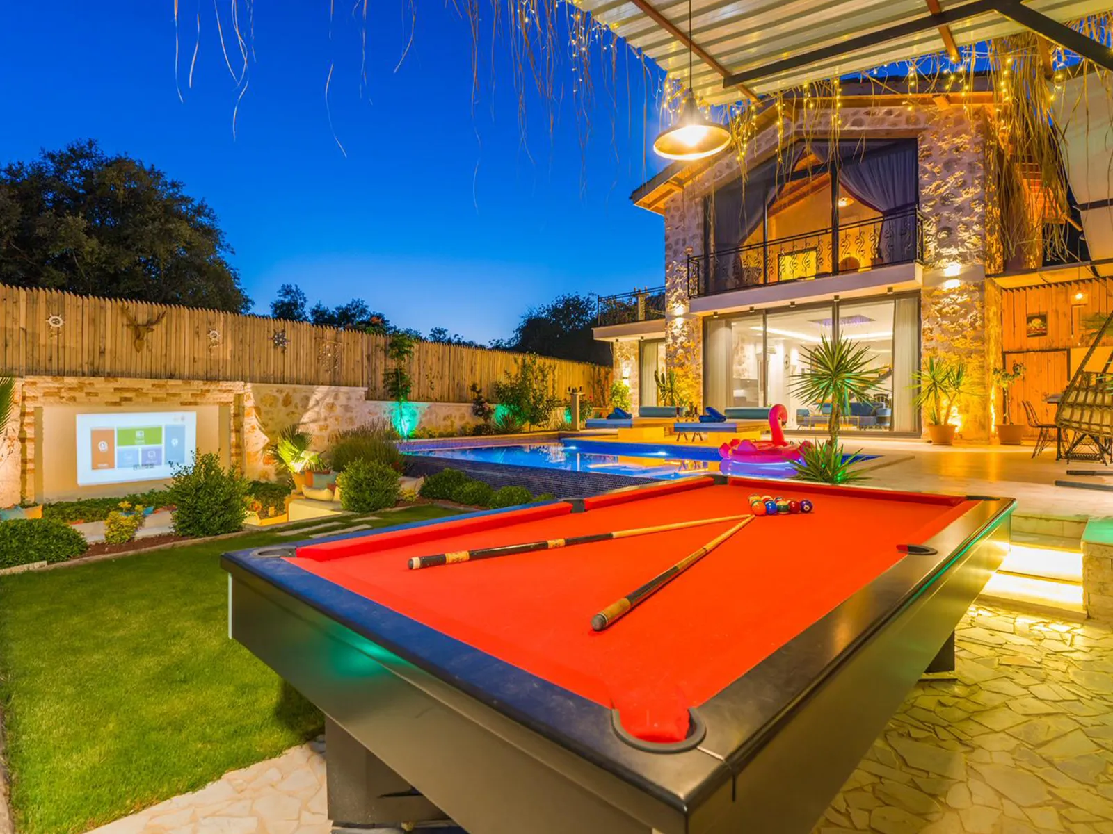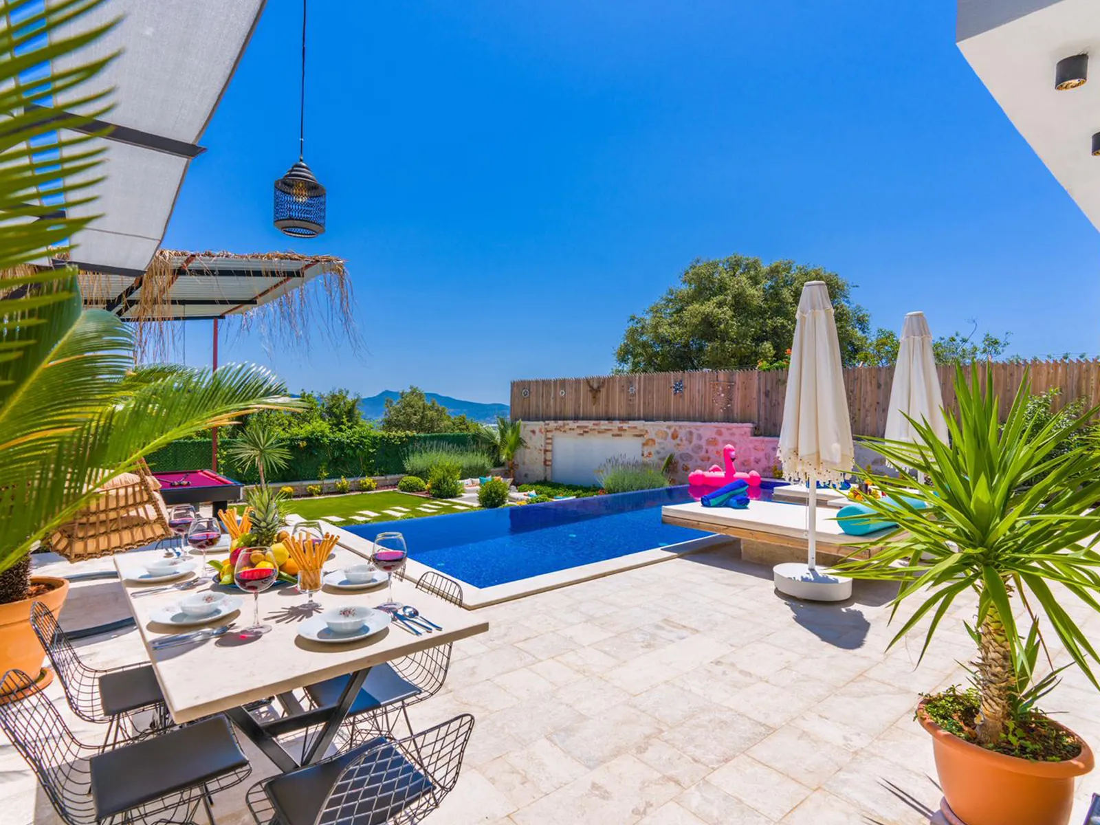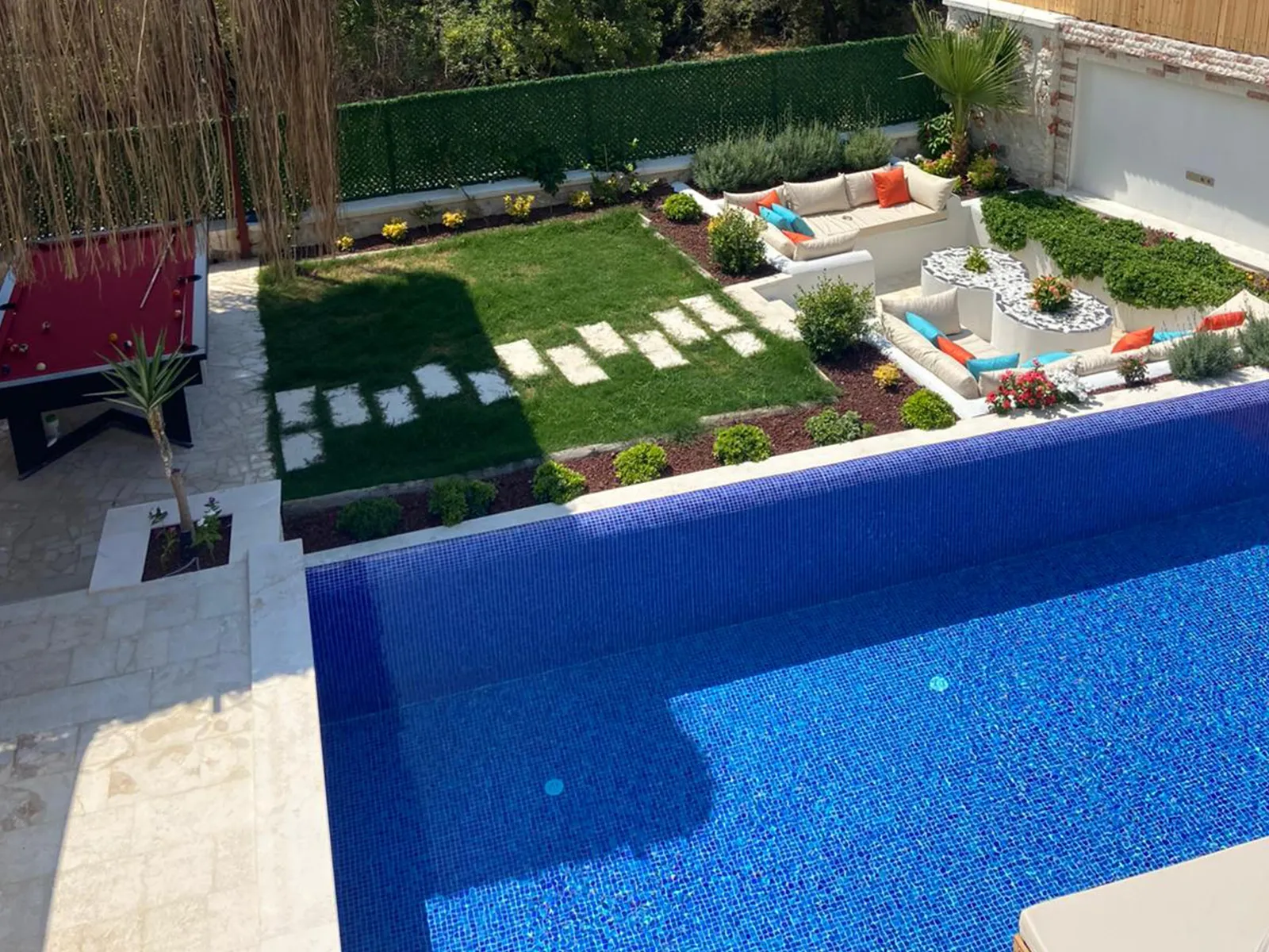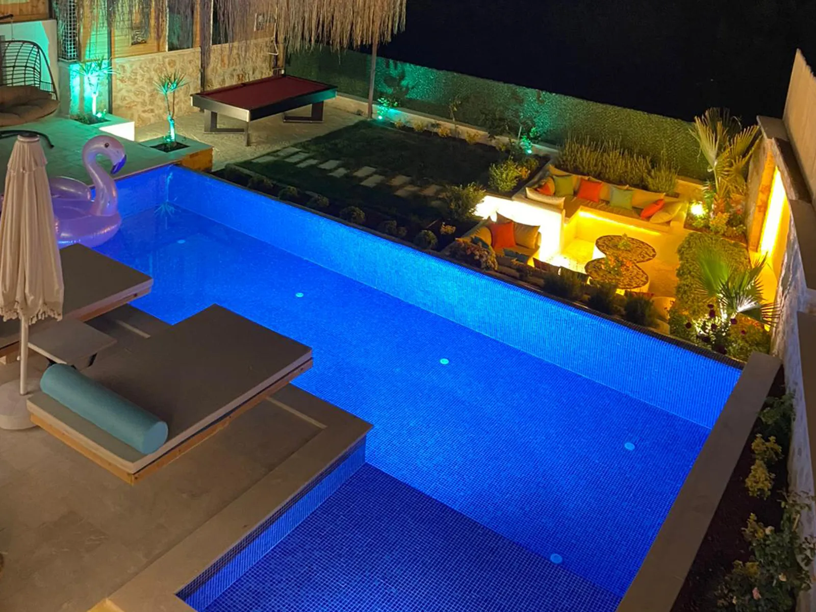 Havuz terasında şezlong, şemsiye, barbekü, salıncak, yemek masası, bilardo ve modern oturma alanı yer almaktadır.
