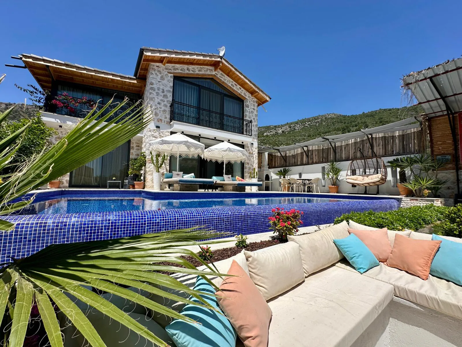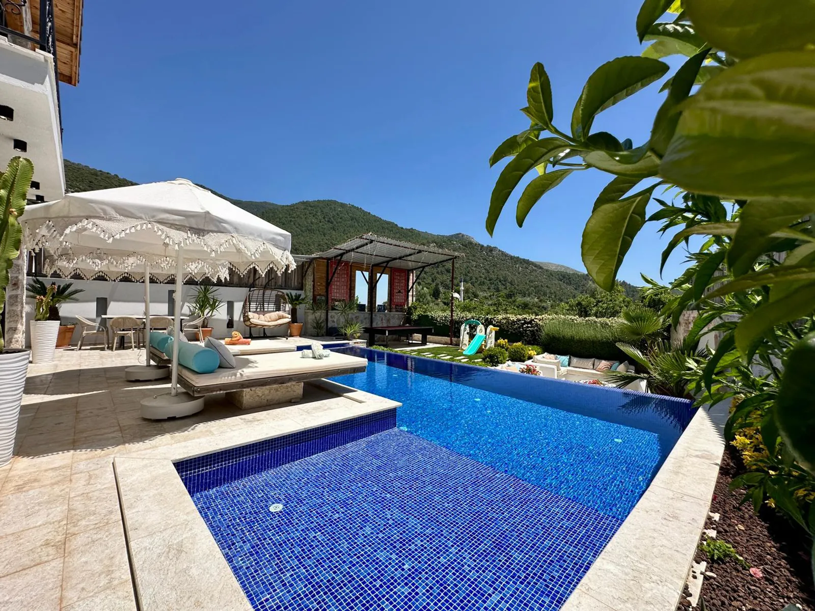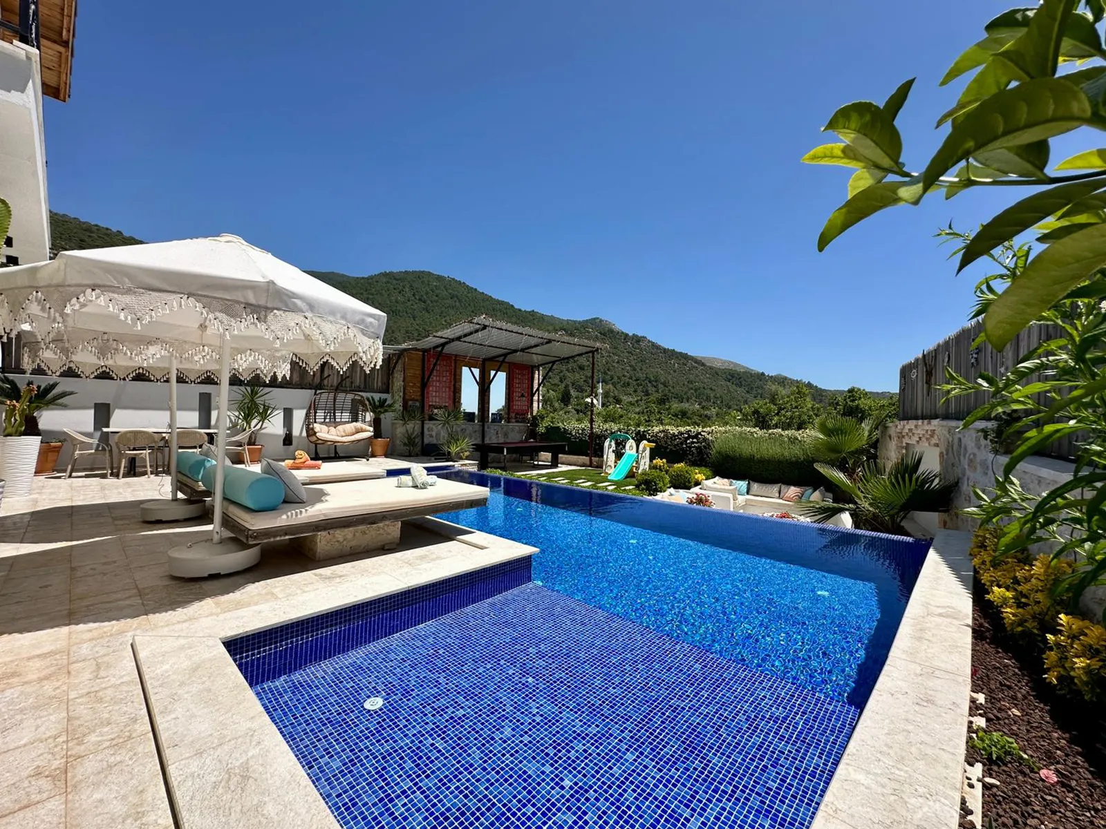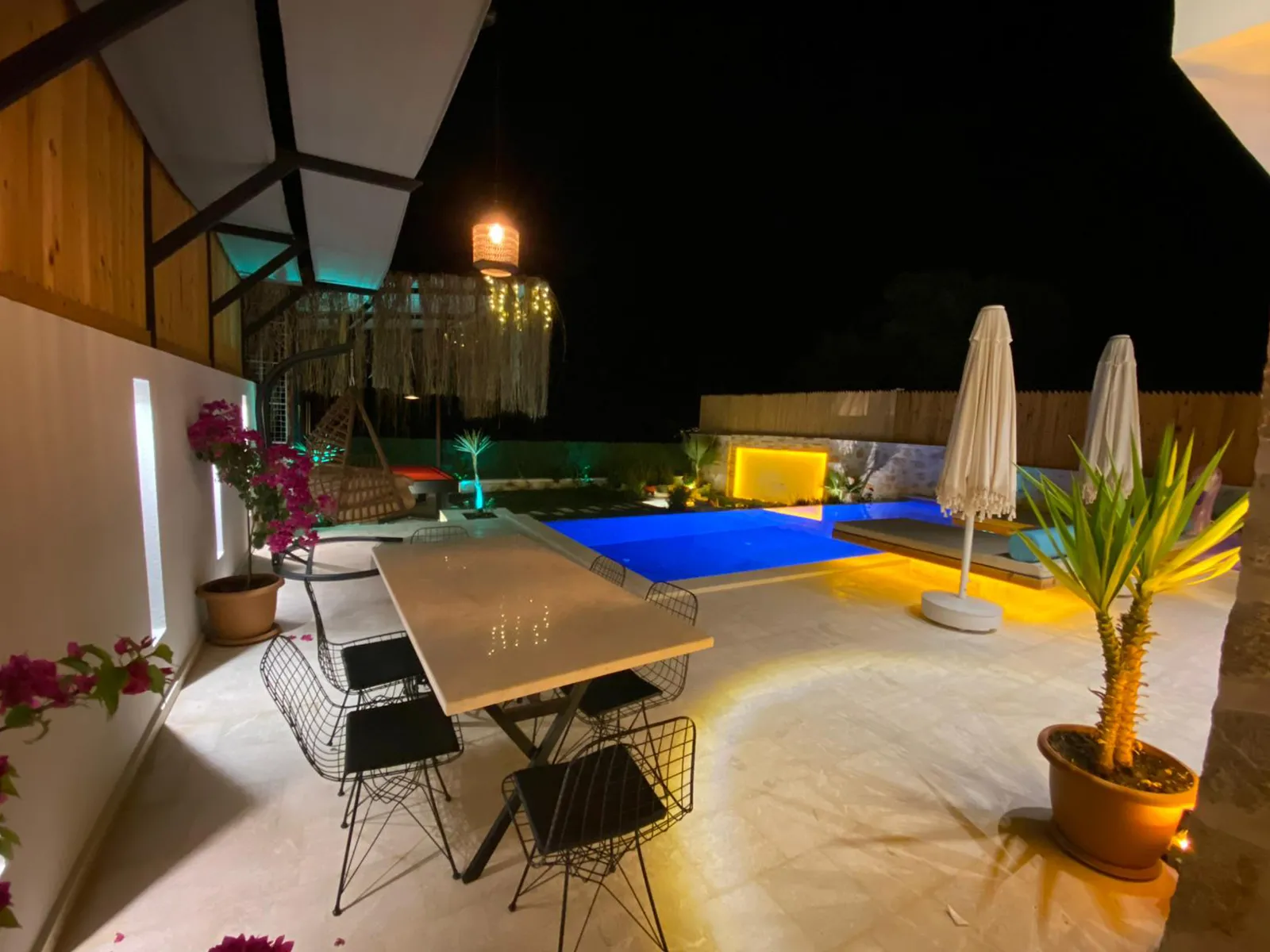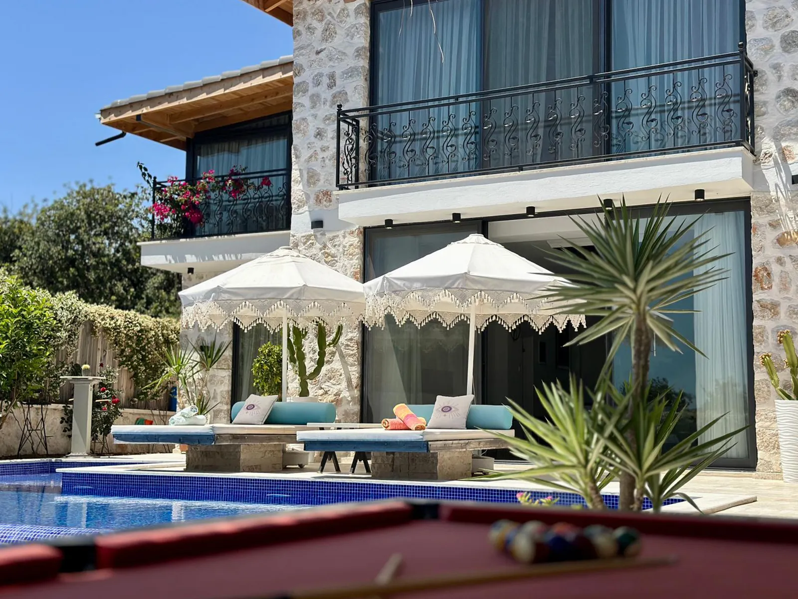 Havuz terasında şezlong, şemsiye, barbekü, salıncak, yemek masası, bilardo ve modern oturma alanı yer almaktadır.