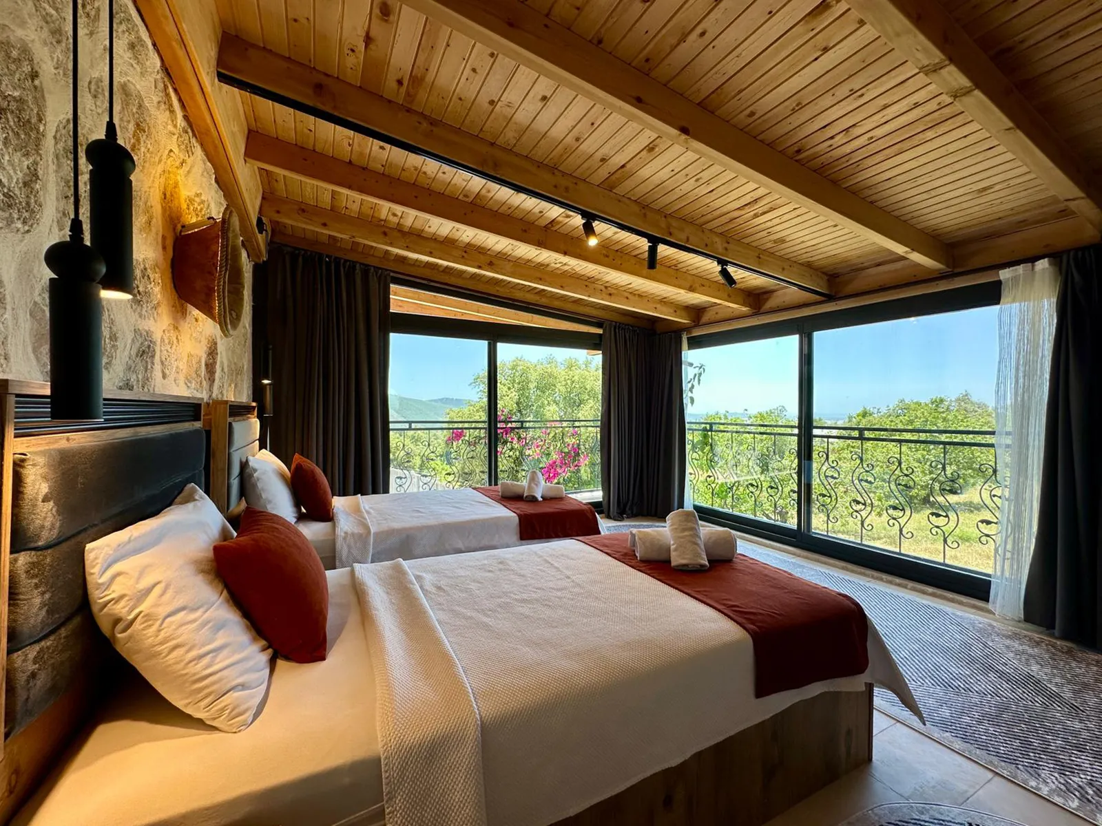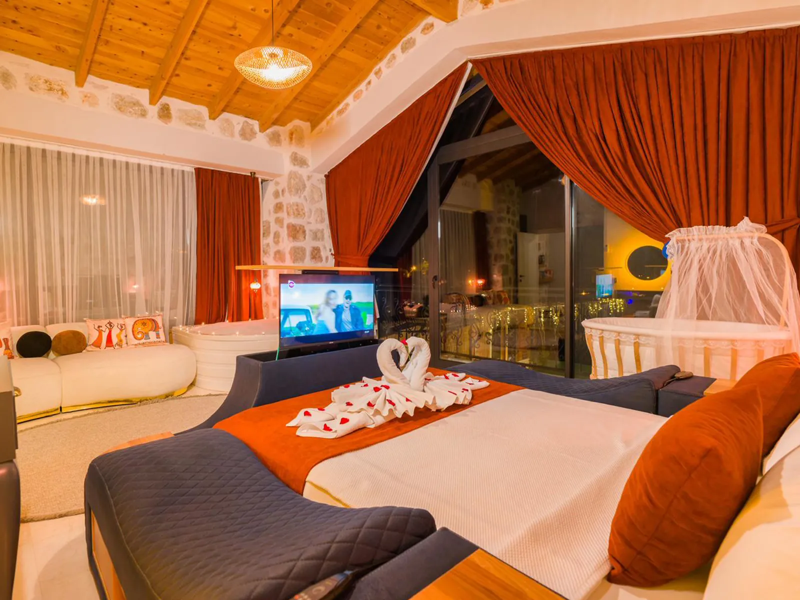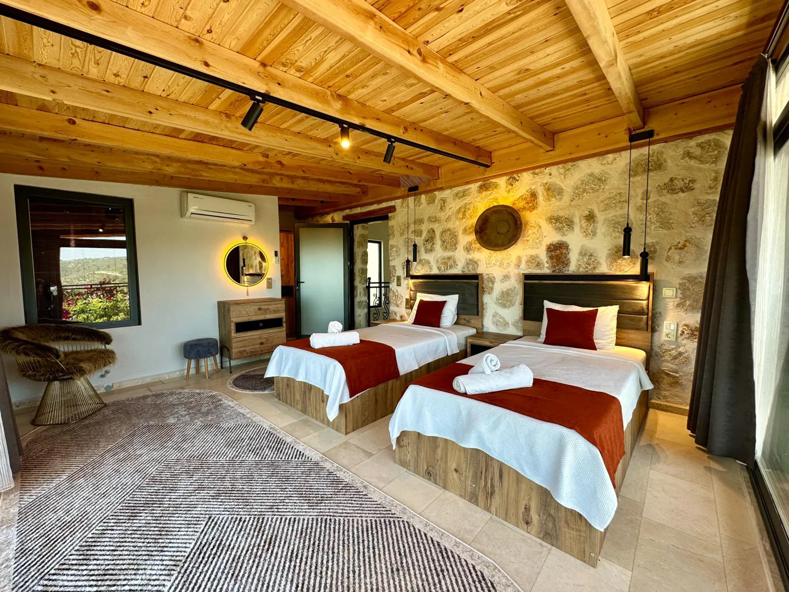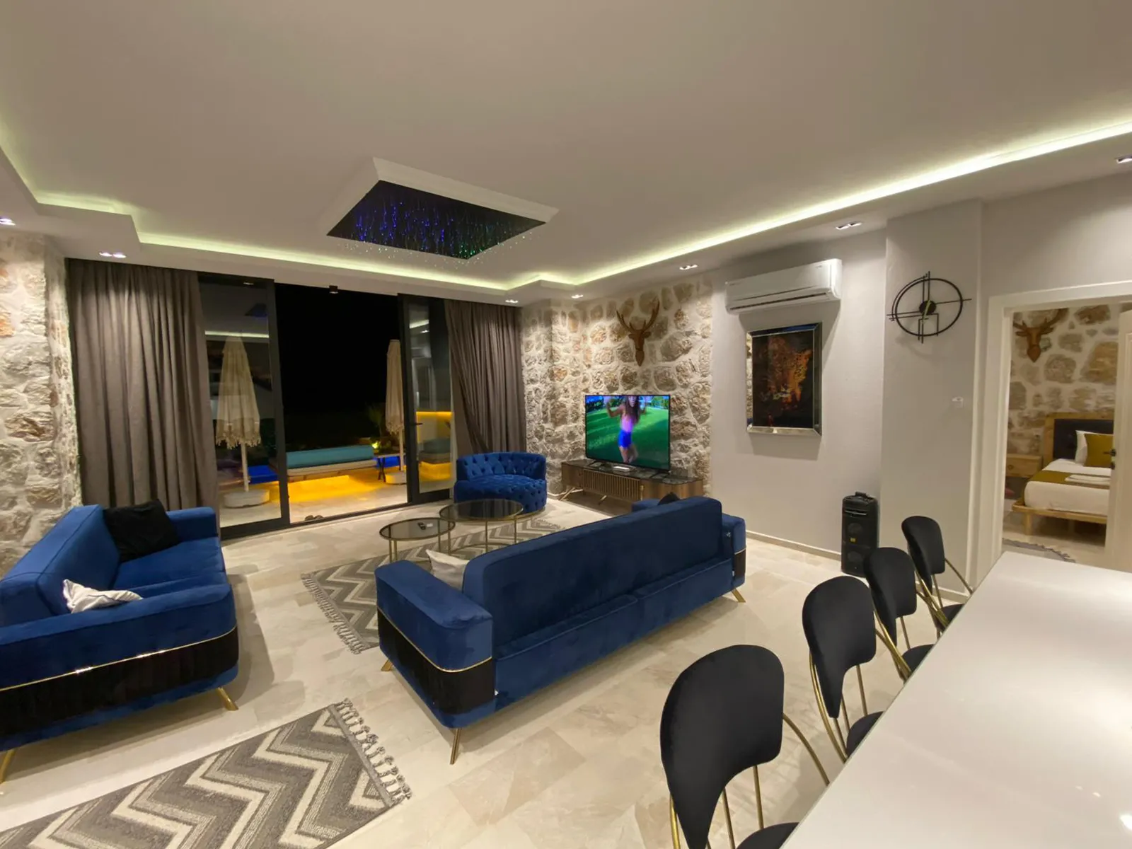 Modern oturma grubu, televizyon, kablosuz internet, klima, sehpa ve havuz terasına çıkış imkanı bulunmaktadır.