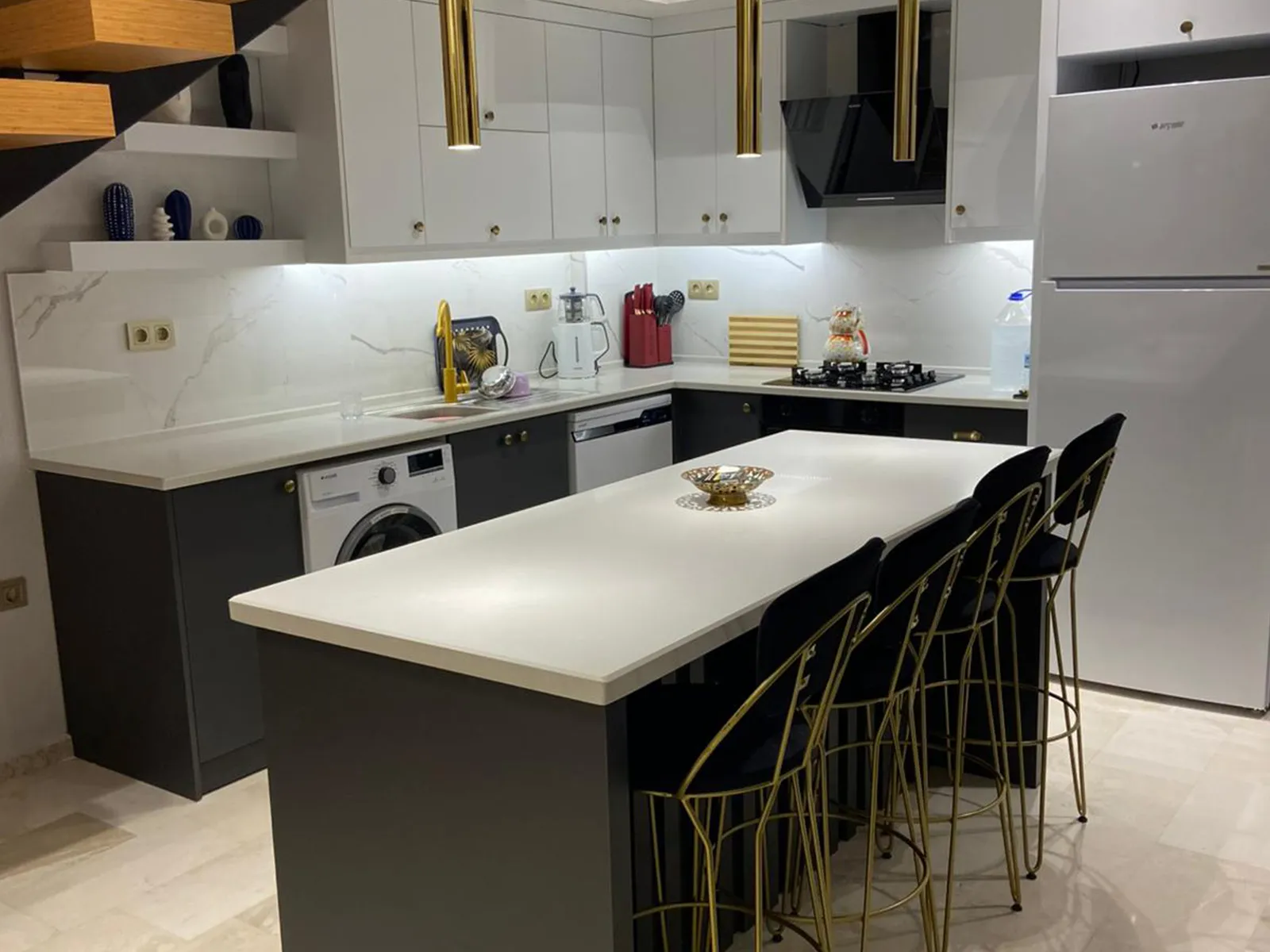 Buzdolabı, çamaşır makinesi, bulaşık makinesi, fırın, 4’lü ocak, kettle, yemek masası, tava ve tencere gibi mutfak ekipmanları mevcuttur.