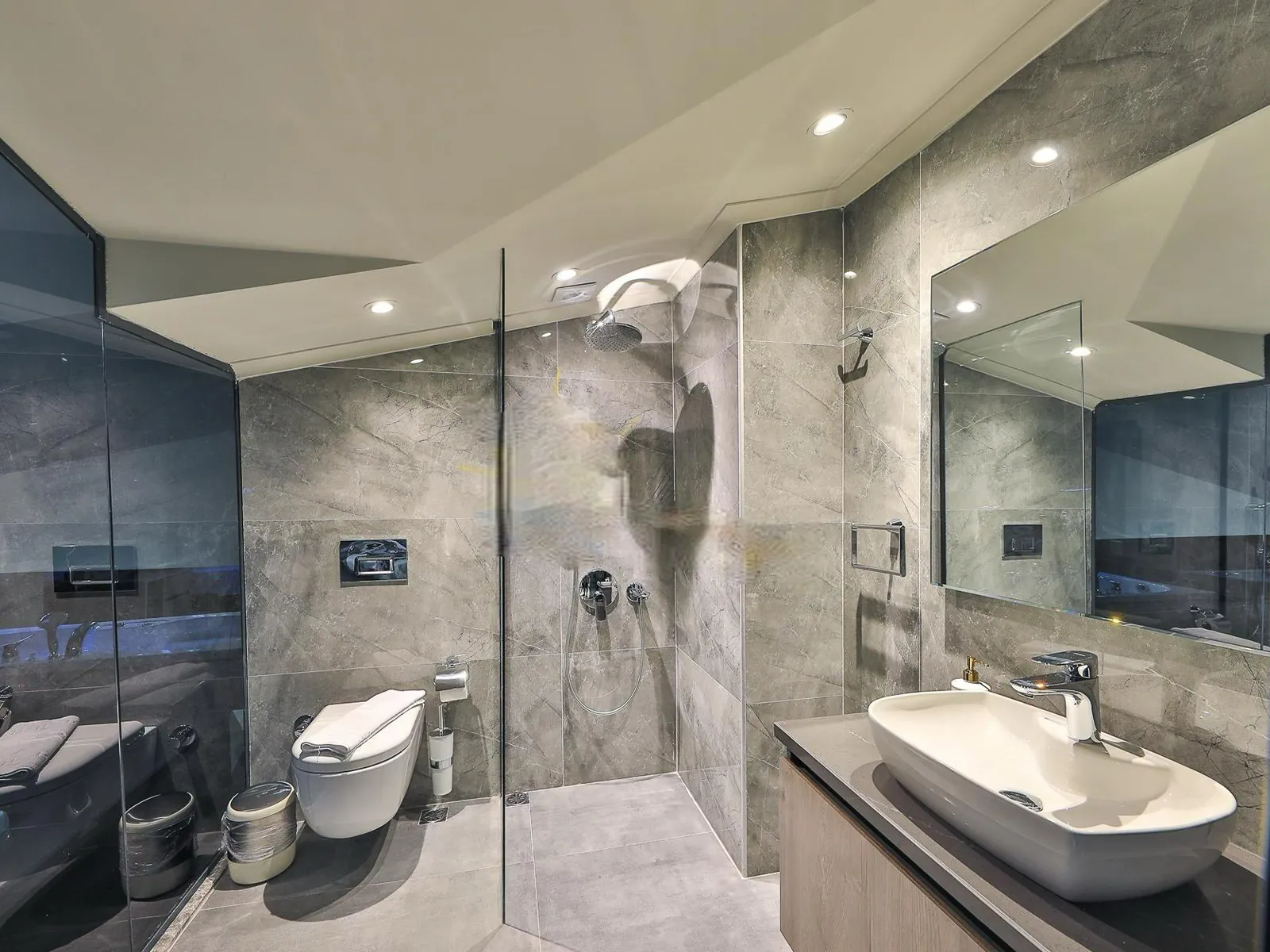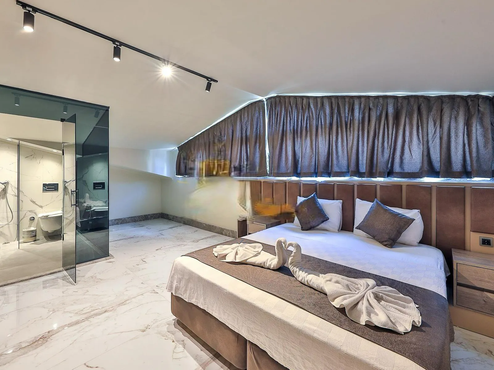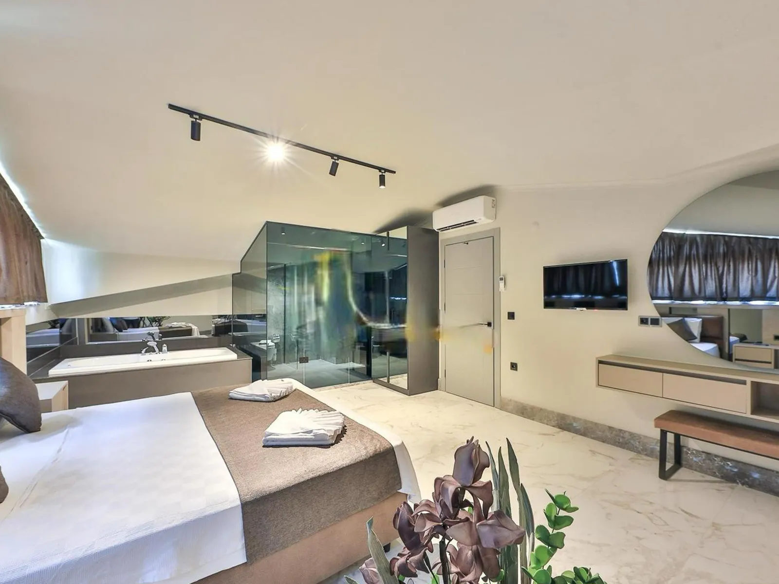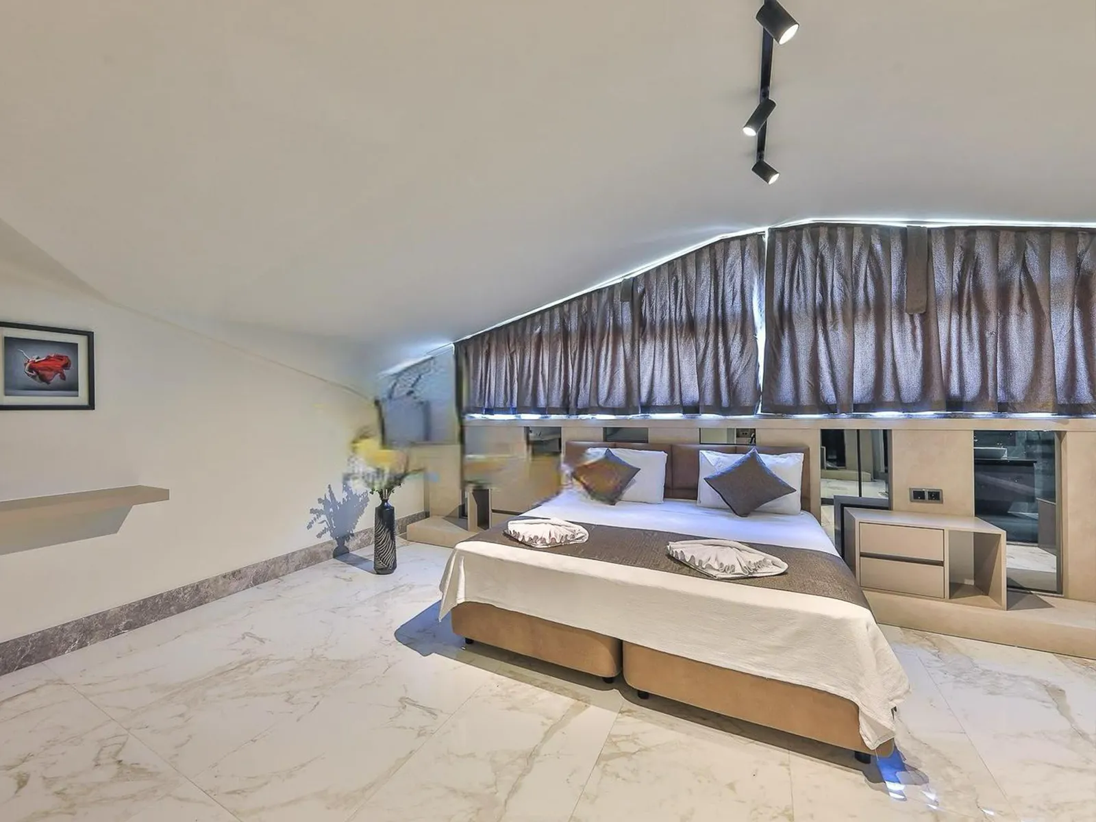 1.Yatak Odası: Çift kişilik yatak, elbise dolabı, komodin, makyaj masası, ebeveyn banyosu, klima, jakuzi, sauna