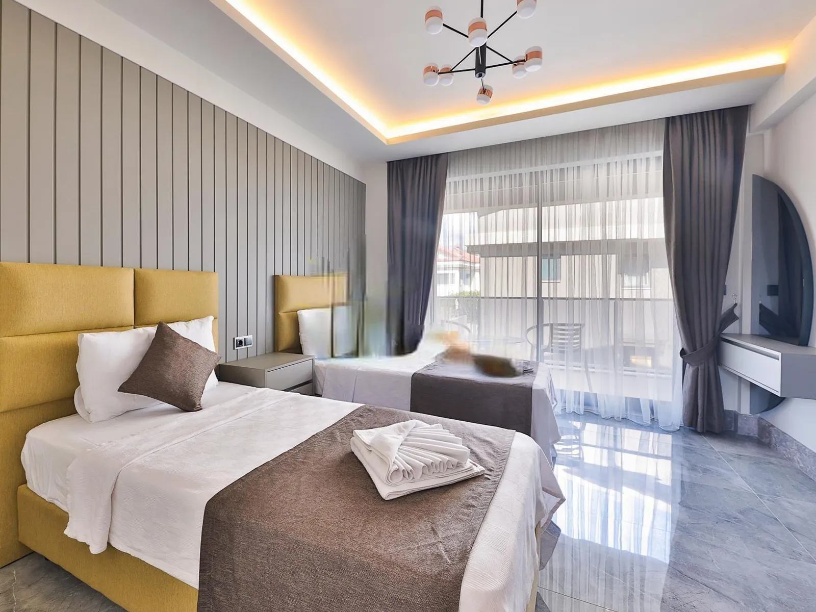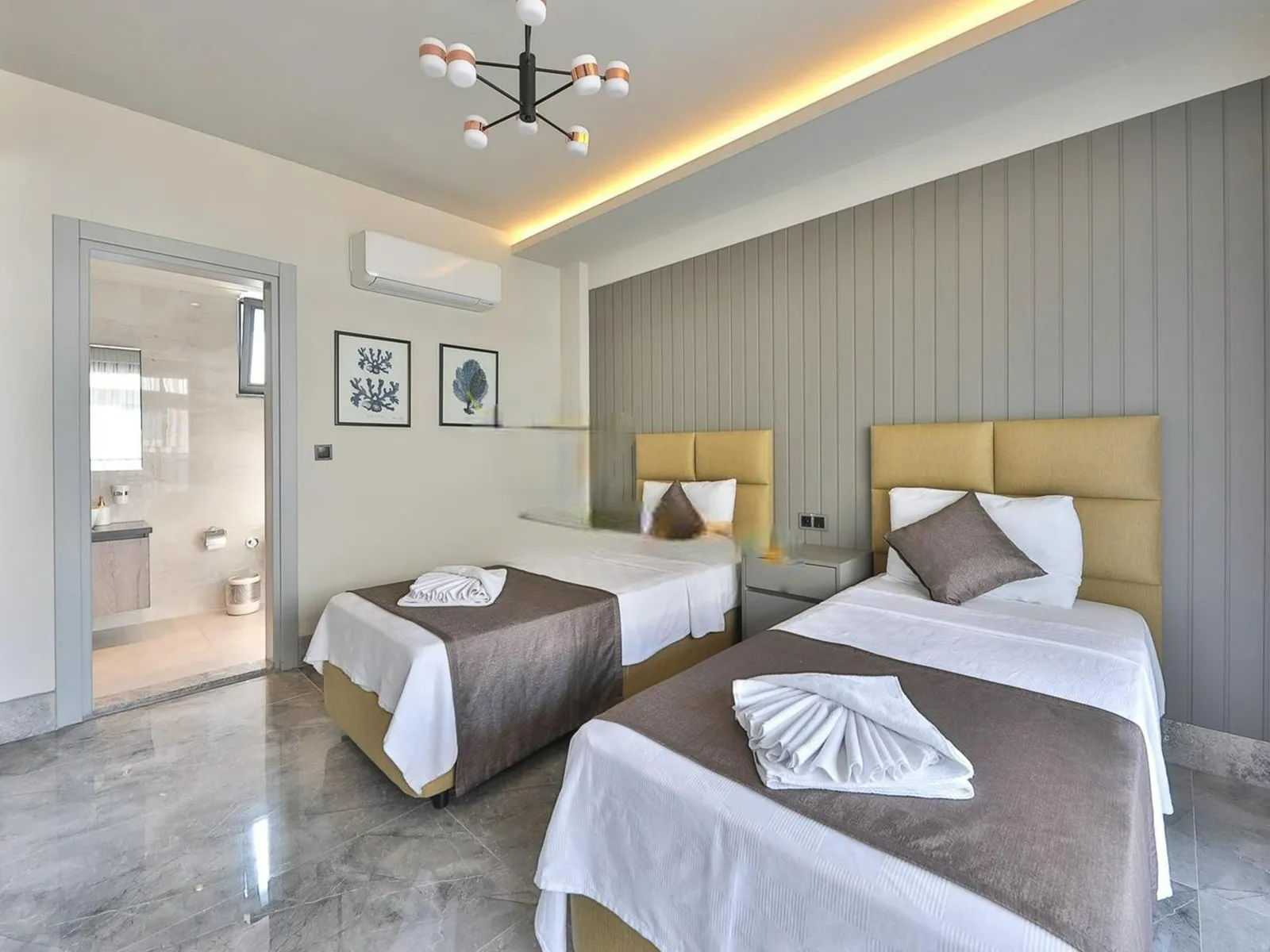 4.Yatak Odası: İki tek kişilik yatak, elbise dolabı, komodin, makyaj masası, ebeveyn banyosu, klima