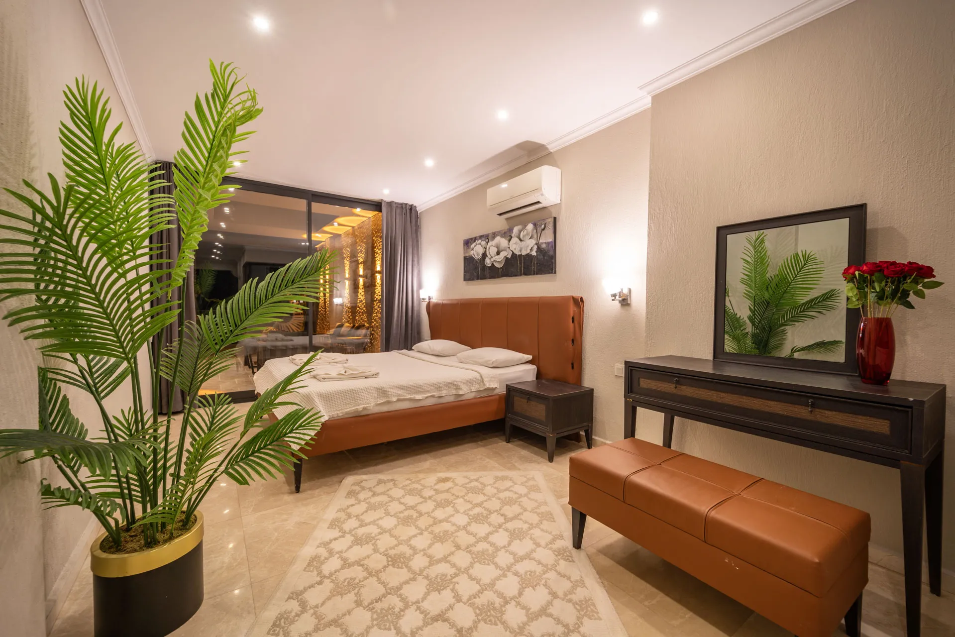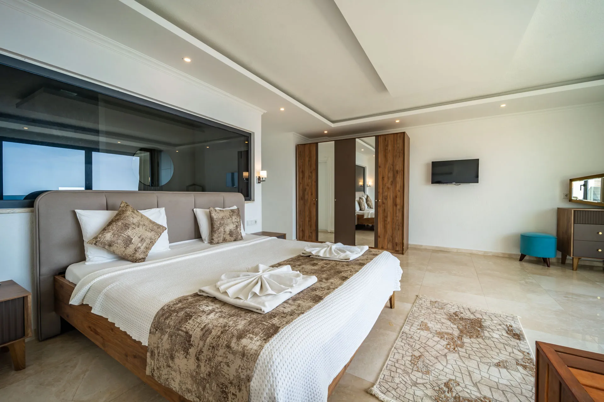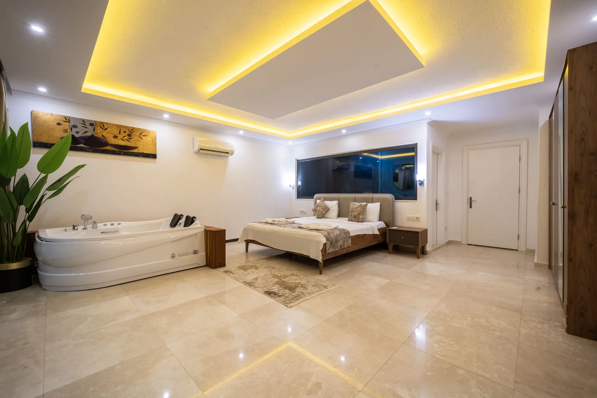 Yatak Odası: 1 adet çift kişilik yatak, komodin, makyaj masası, jakuzi, klima, banyo ve tuvalet.