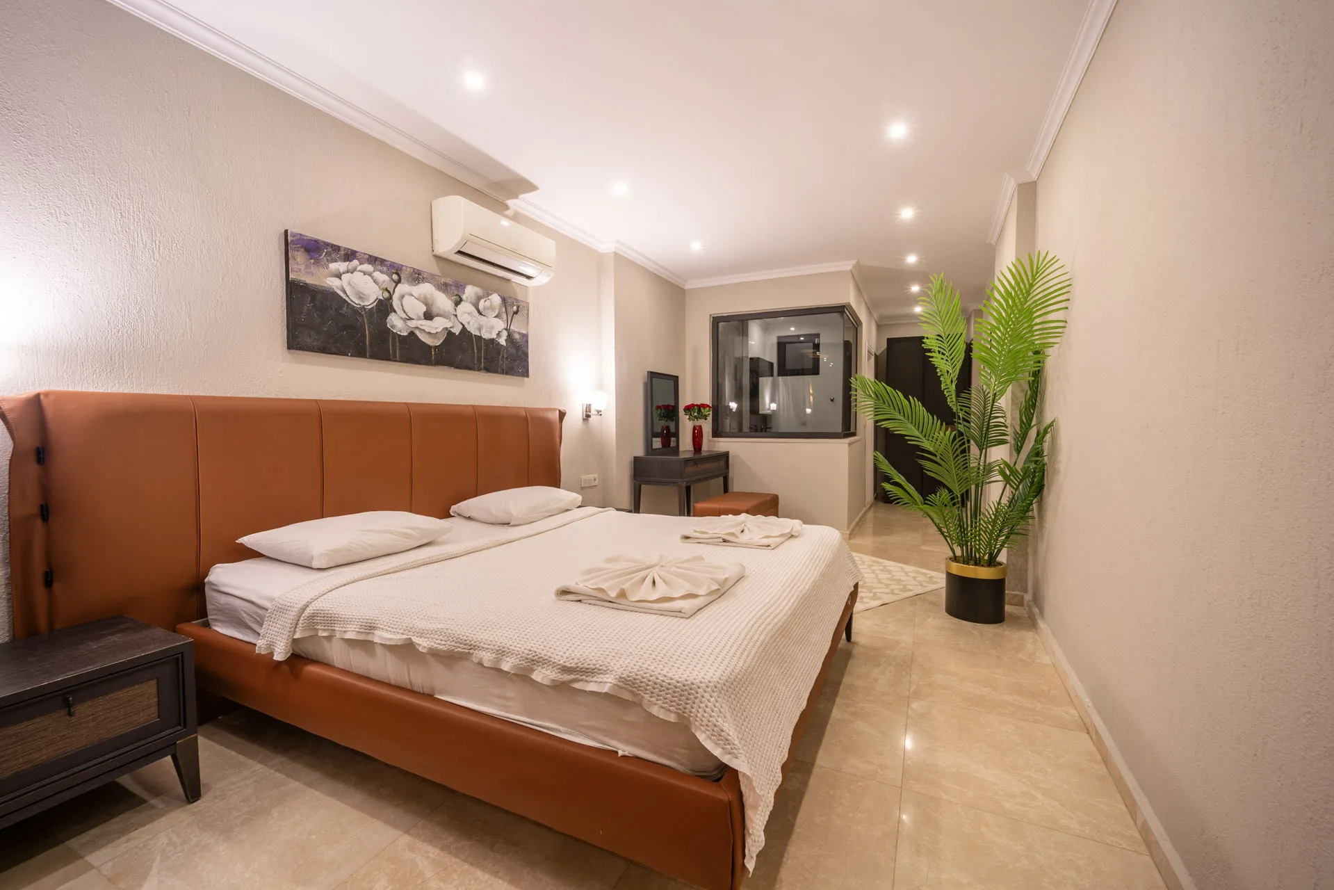 Yatak Odası: 1 adet çift kişilik yatak, komodin, makyaj masası, klima, banyo ve tuvalet.