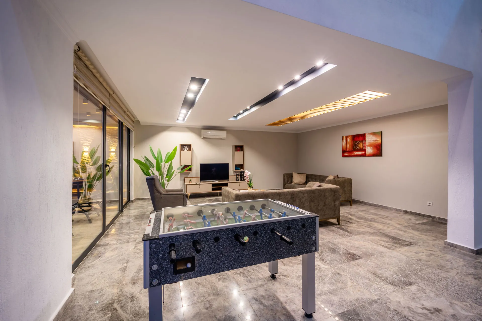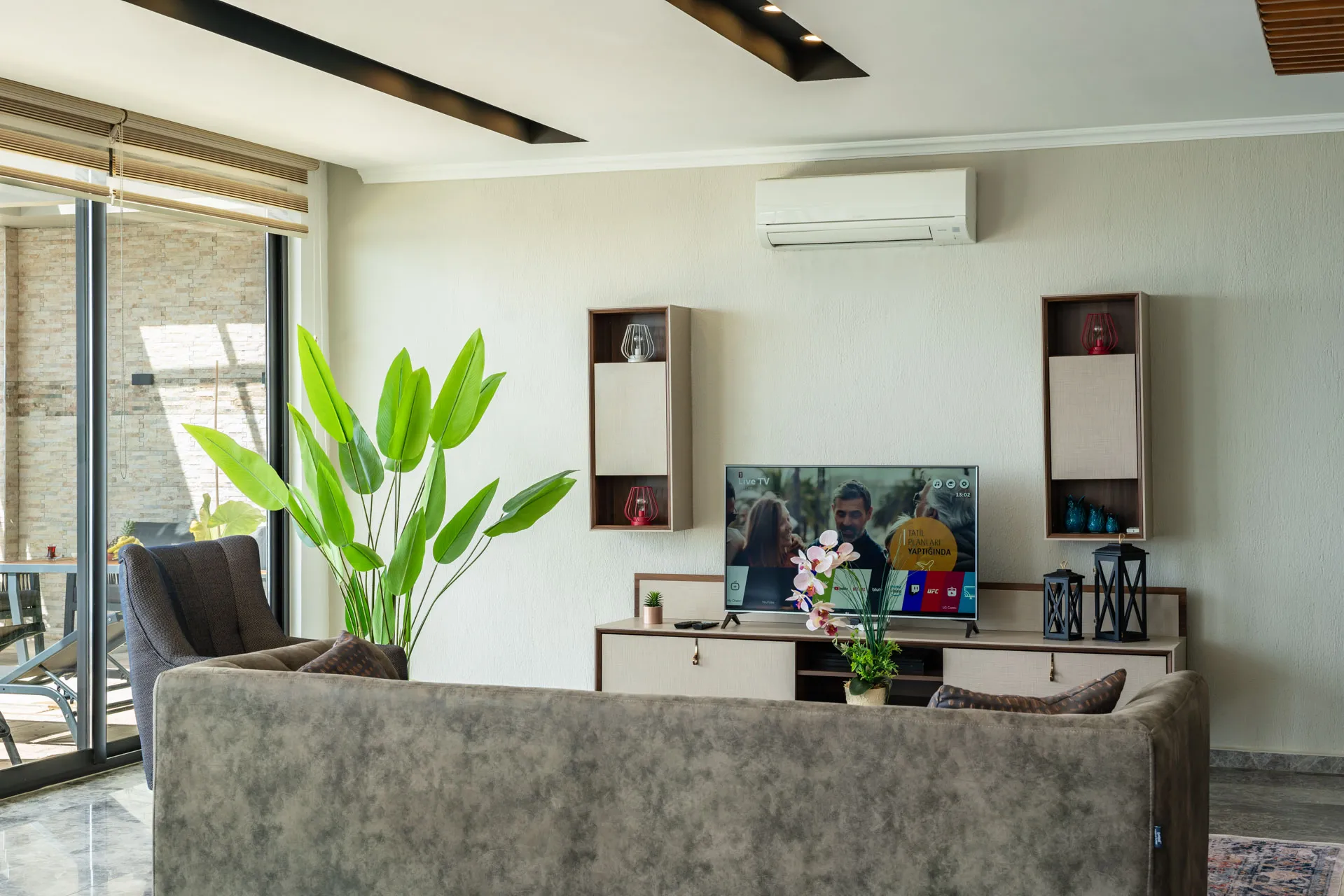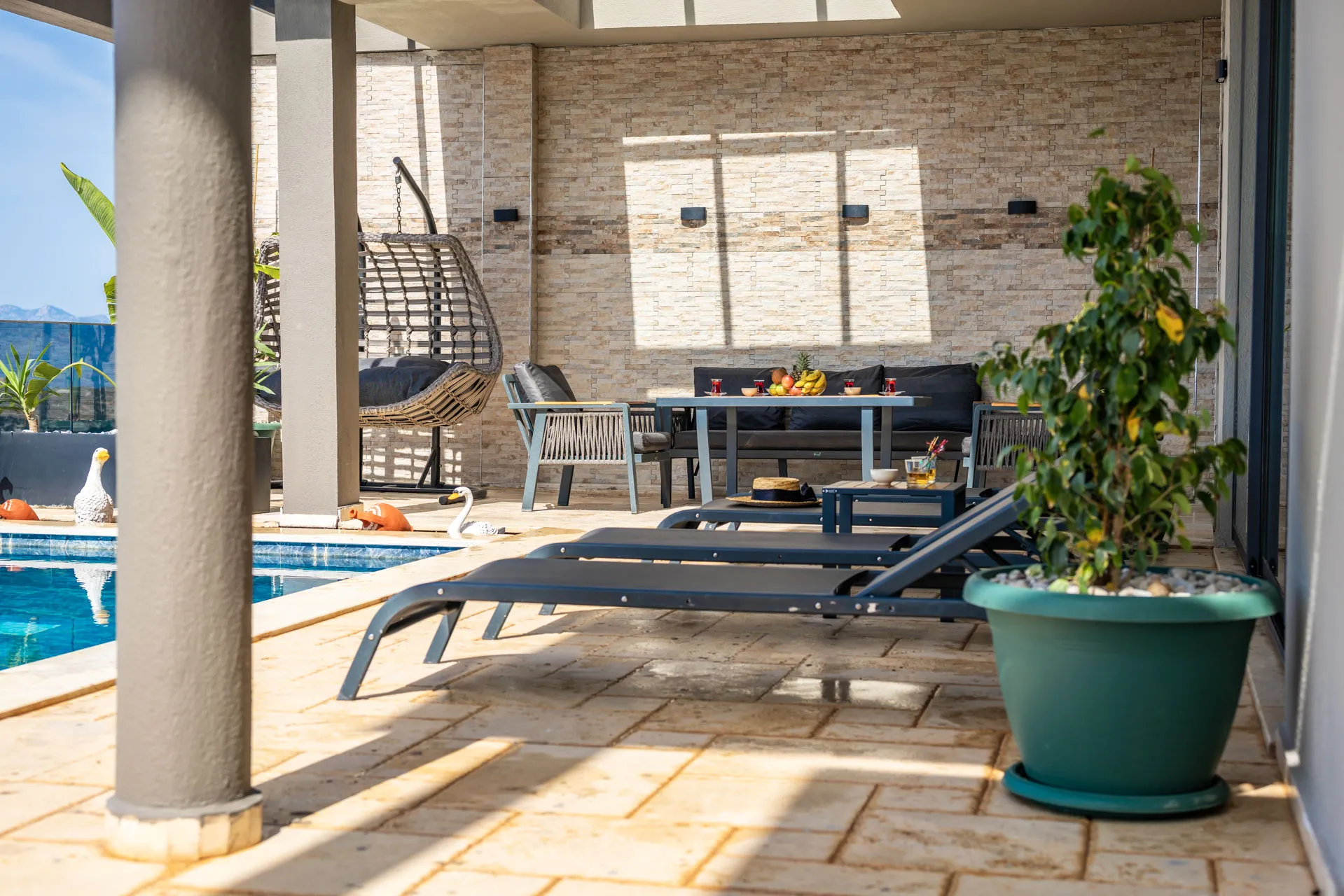 Kaliteli oturma grubu, uydu TV (LCD), klima, 6 kişilik yemek masası ve havuz terasına çıkış