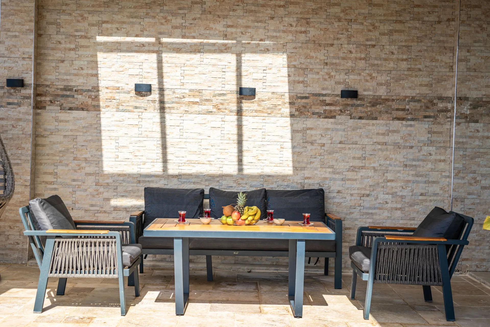 Şezlong, oturma grubu, salıncak, masa tenisi, langırt ve mangal