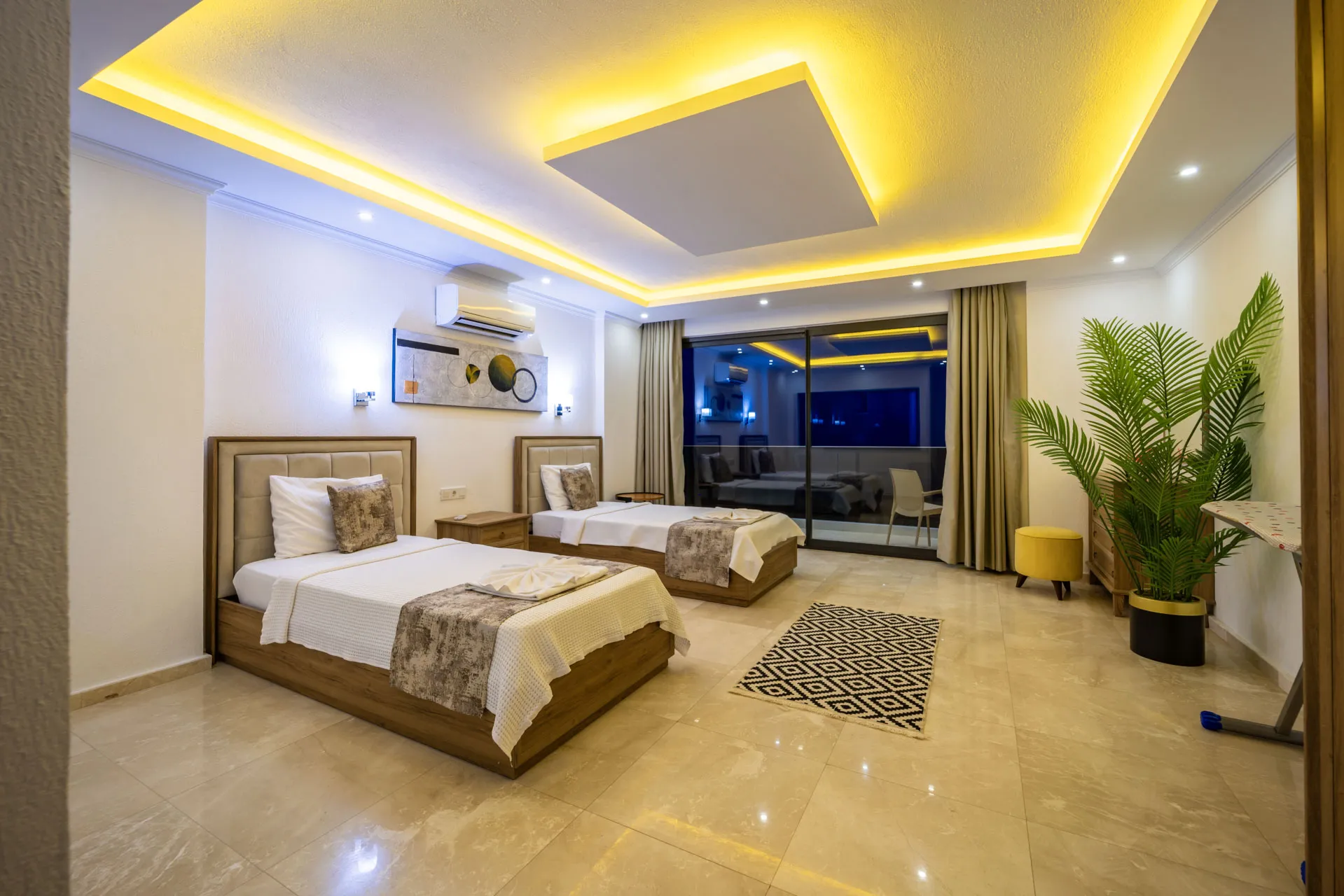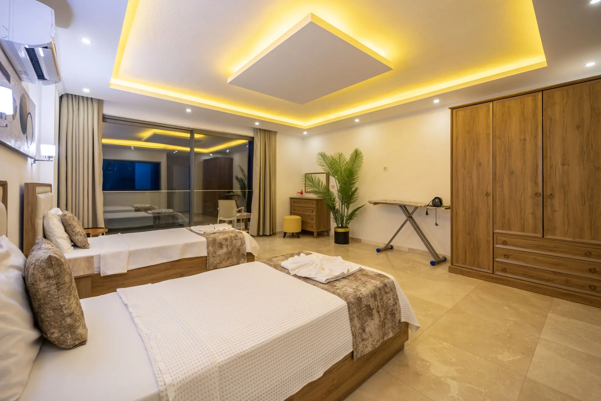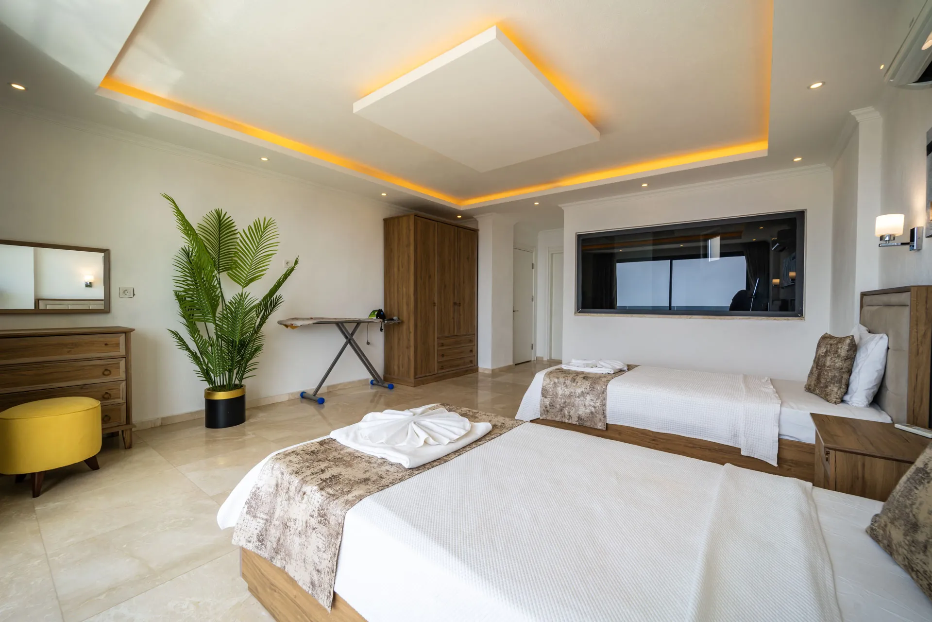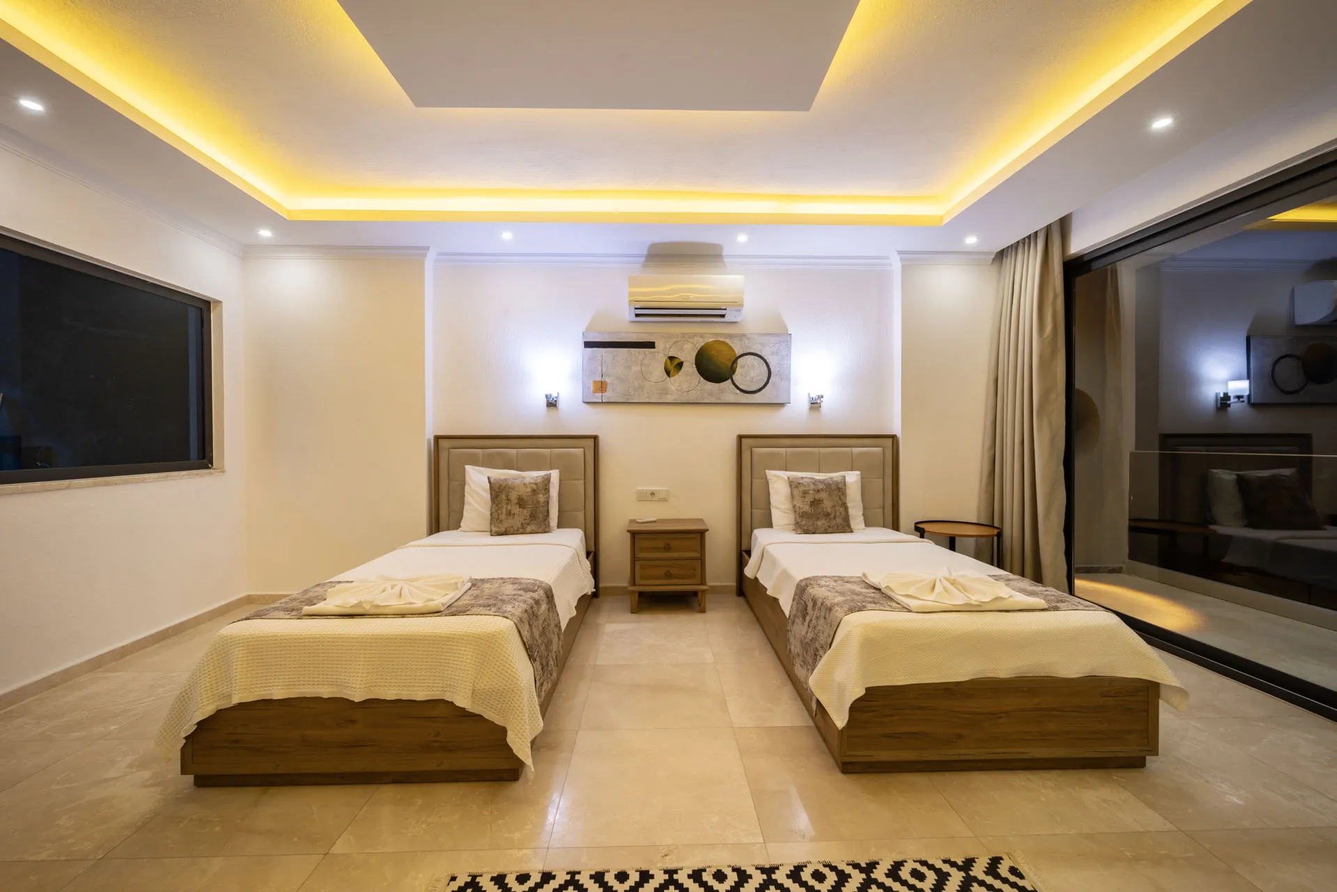 Yatak Odası: 2 adet tek kişilik yatak, komodin, makyaj masası, klima, banyo ve tuvalet.