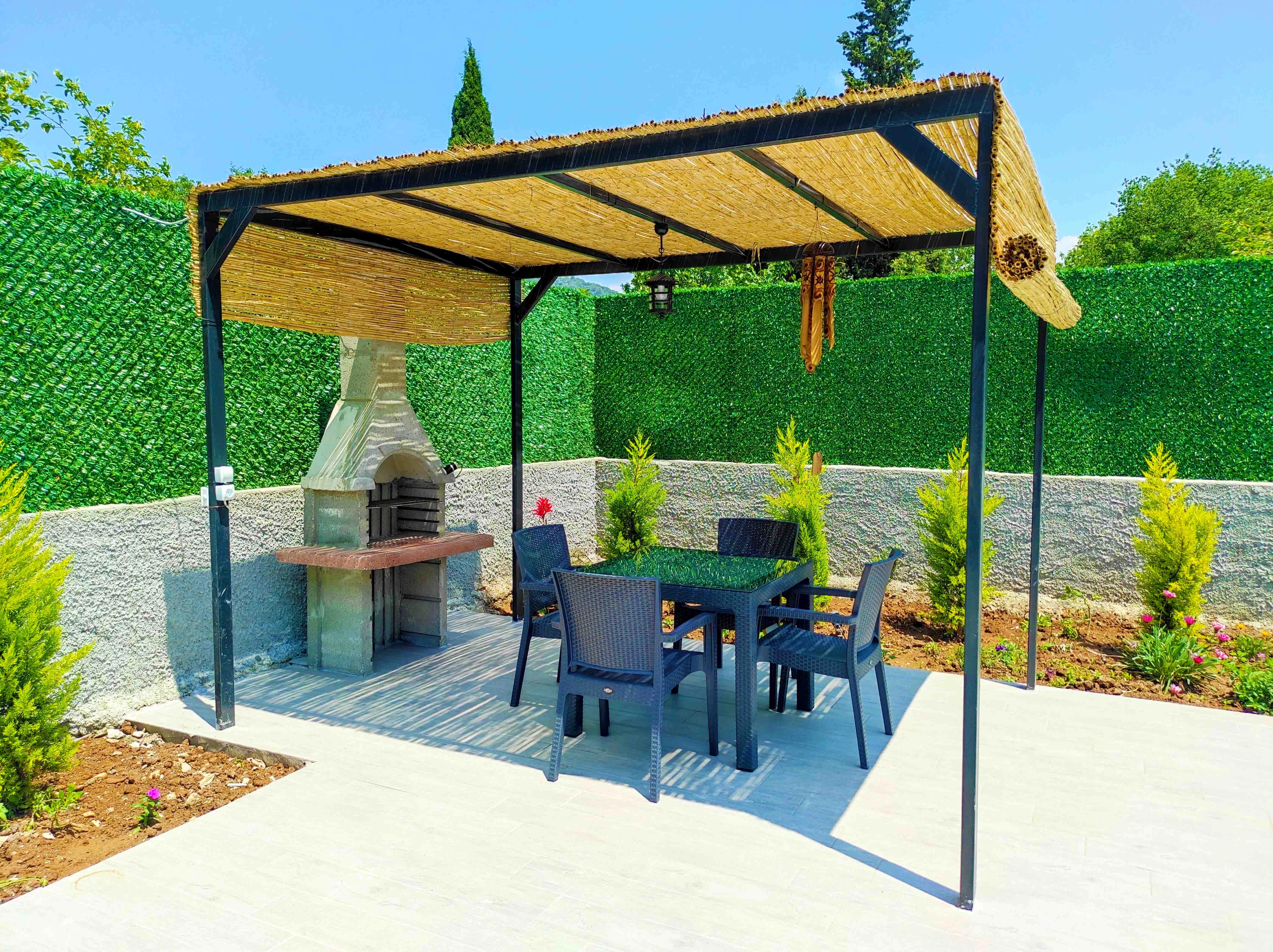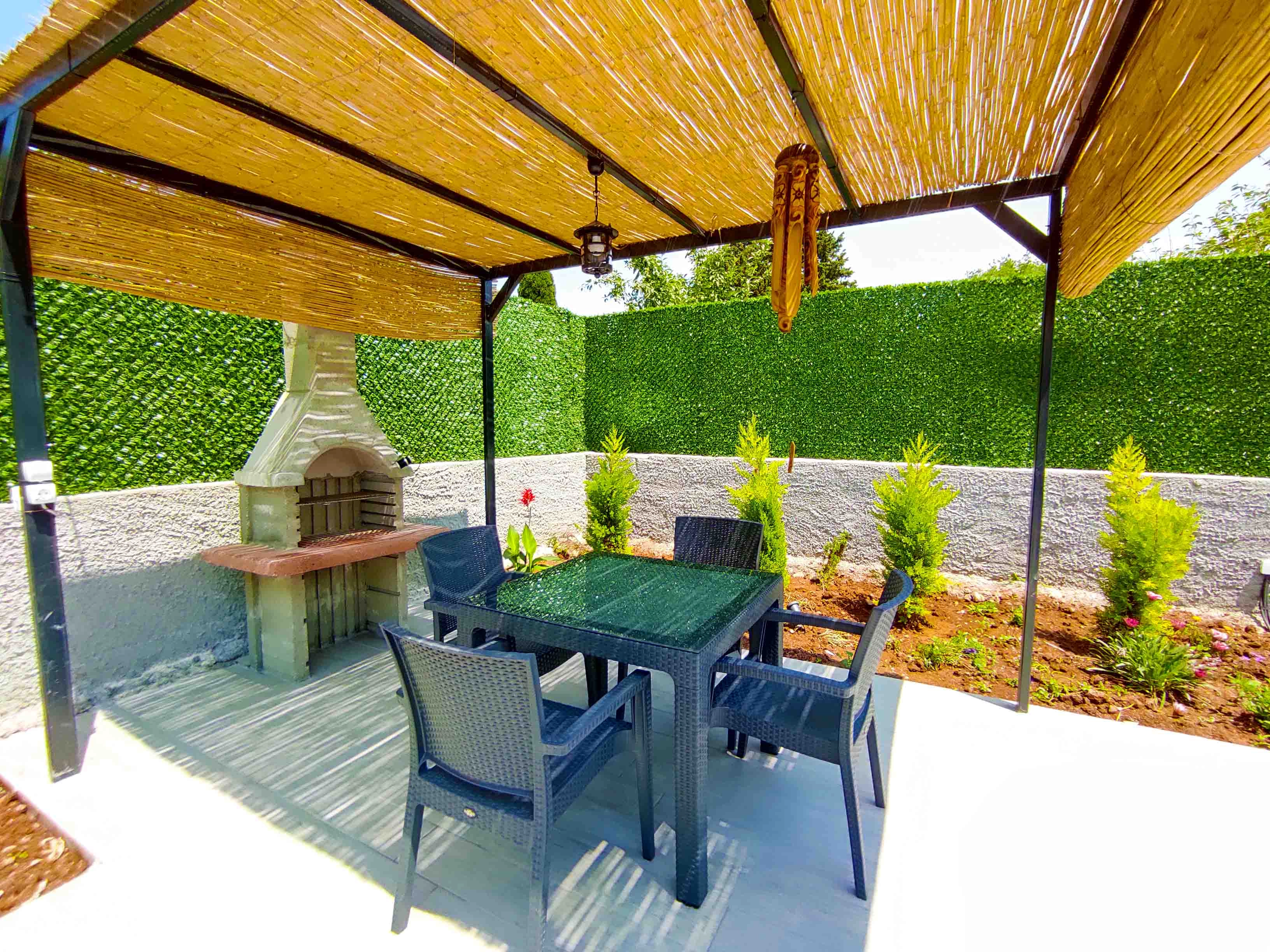 Özel yüzme havuzu, havuz terasında şemsiye, şezlong, barbekü, pergola
