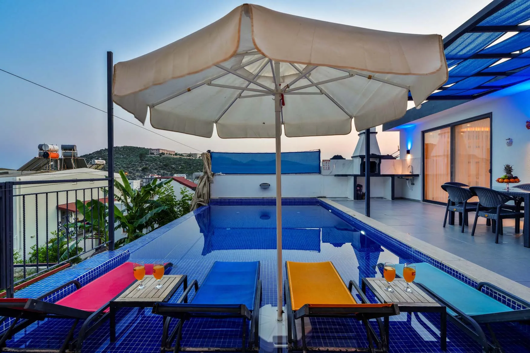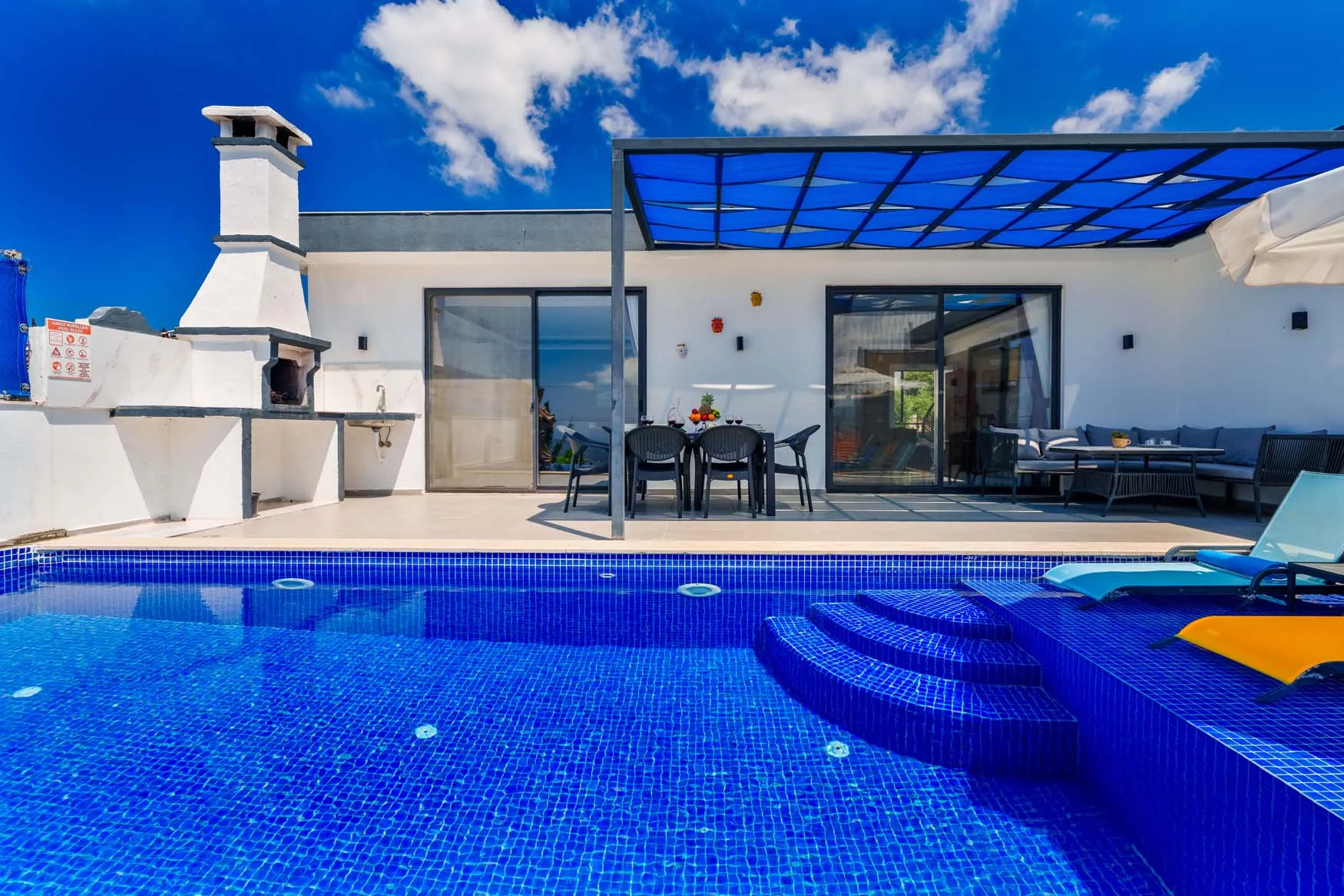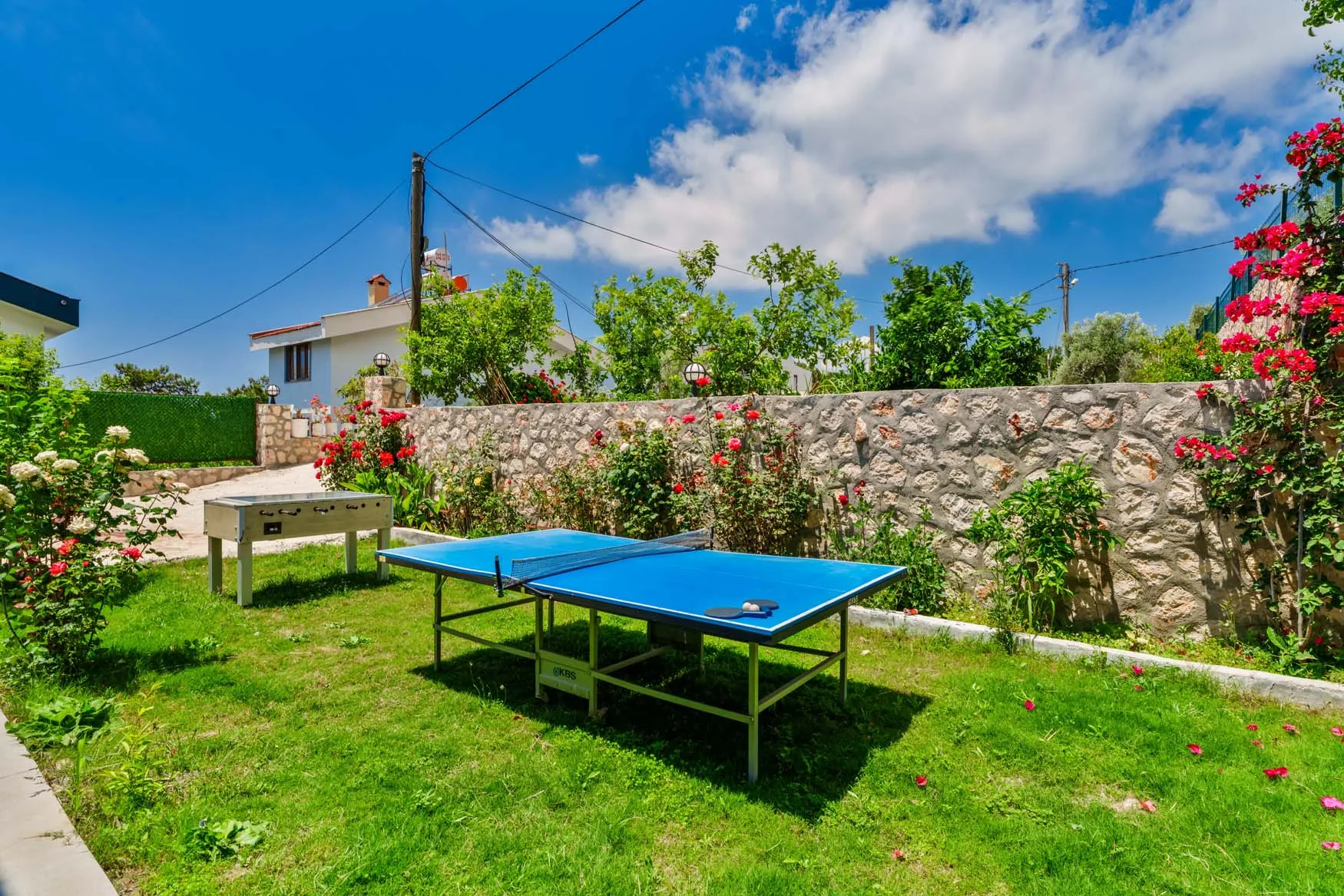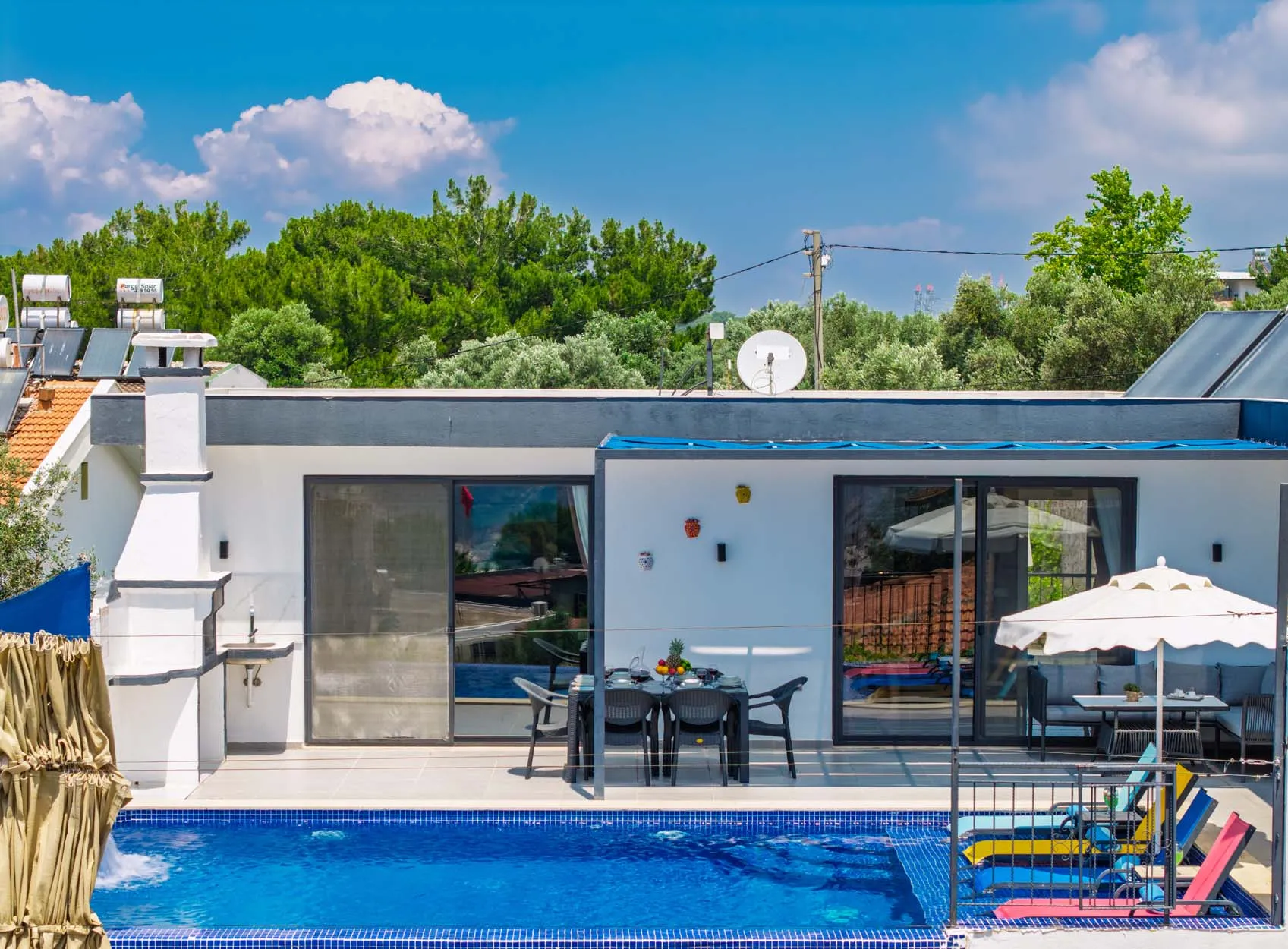 Detayları : Şezlong, güneşlenme  şemsiyesi, salıncak, masa tenisi, barbekü, yemek masası ve sandalyeleri bulunmaktadır.