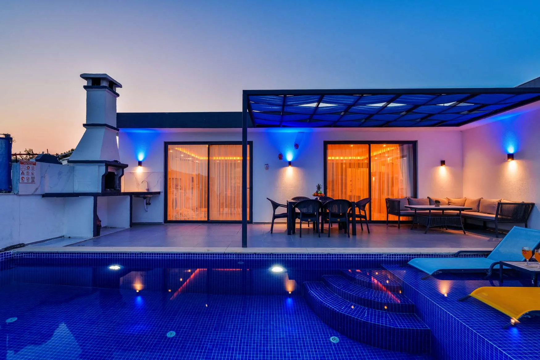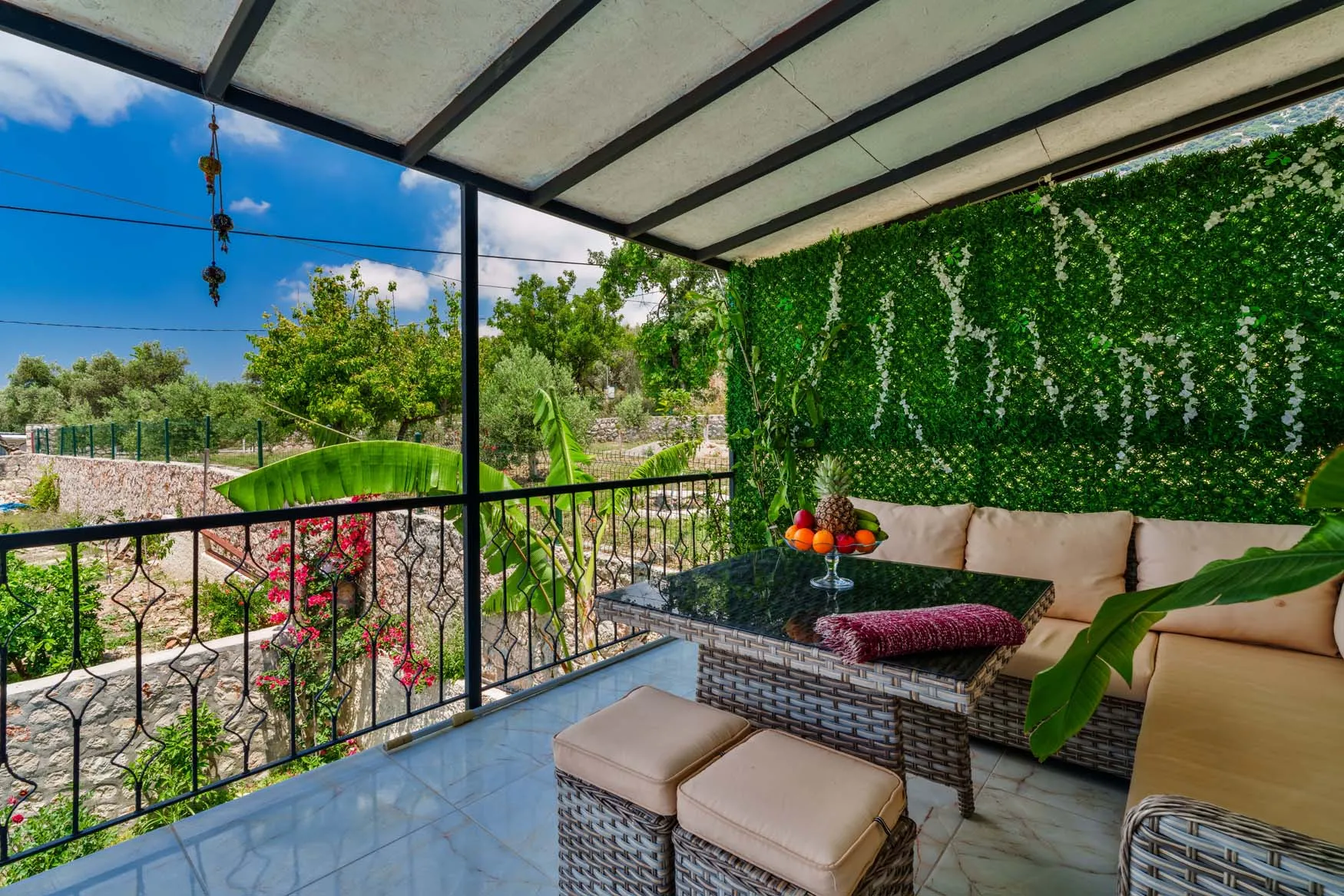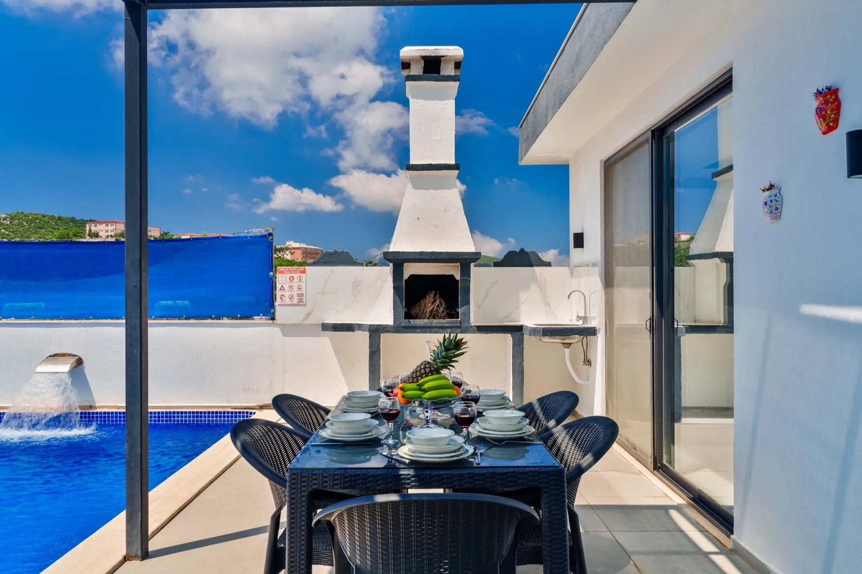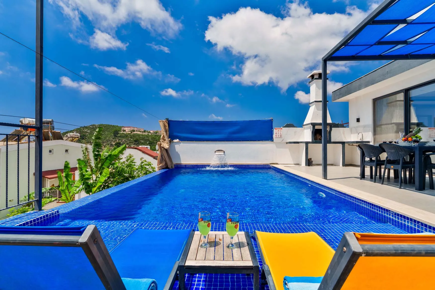 Detayları : Şezlong, güneşlenme  şemsiyesi, salıncak, masa tenisi, barbekü, yemek masası ve sandalyeleri bulunmaktadır.