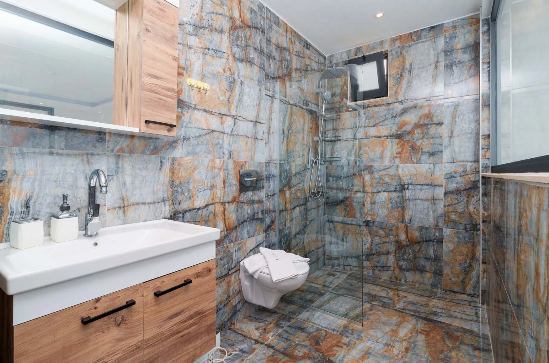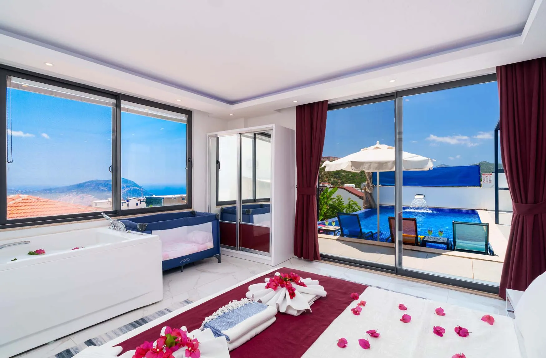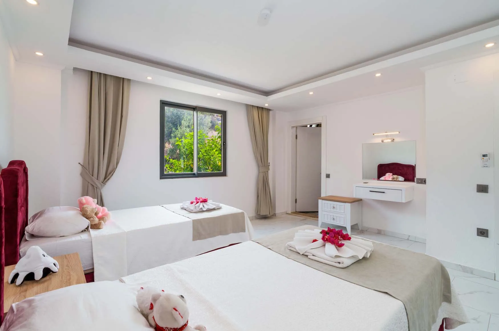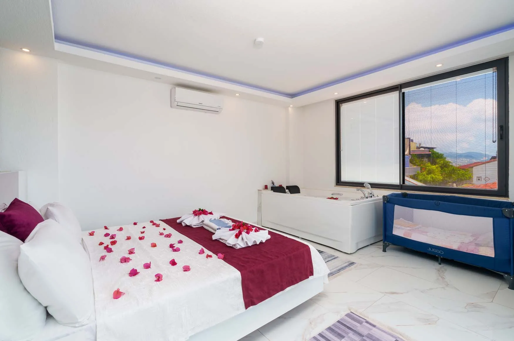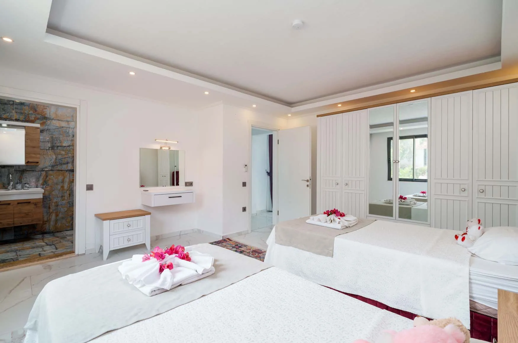 1.Yatak Odası Detayları : Çift kişilik yatak, klima, jakuzi, komodin, elbise dolabı, makyaj masası, banyo ve lavabo bulunmaktadır.