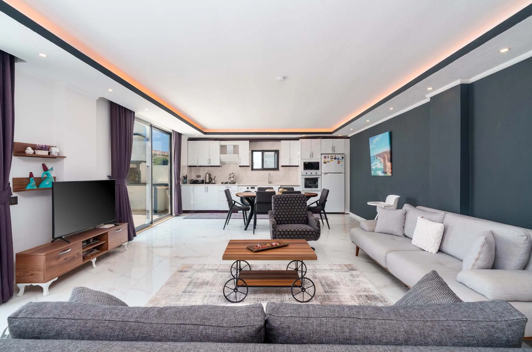 LCD TV, klima, modern oturma grubu, yemek masası ve sandalyeler, kablosuz modem bulunmaktadır.