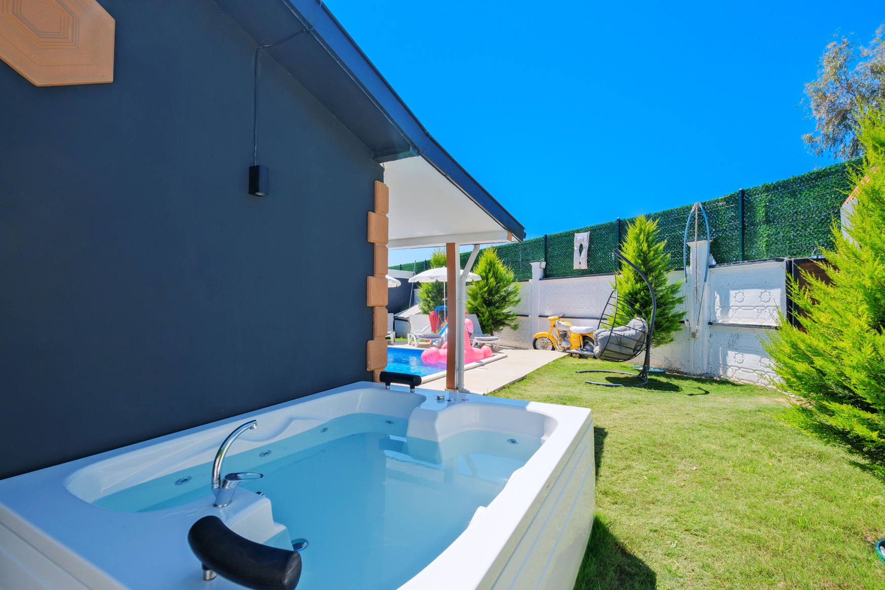 Özel yüzme havuzu, 4 ad. şezlong, 2 ad. güneş şemsiyesi, jakuzi, çocuk oyun alanı, veranda altı 4 kişilik yemek masası, damla salıncak ve barbekü yer almaktadır.