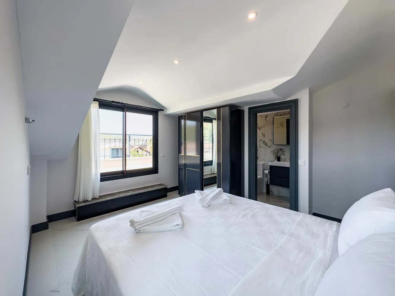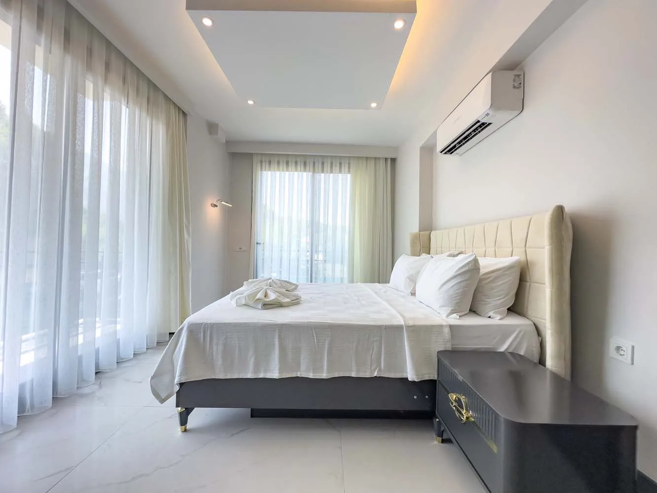 3.Yatak Odası (Teras Kat): Aile süiti — çift kişilik yatak, komodin, klima, elbise dolabı, banyo ve balkon.