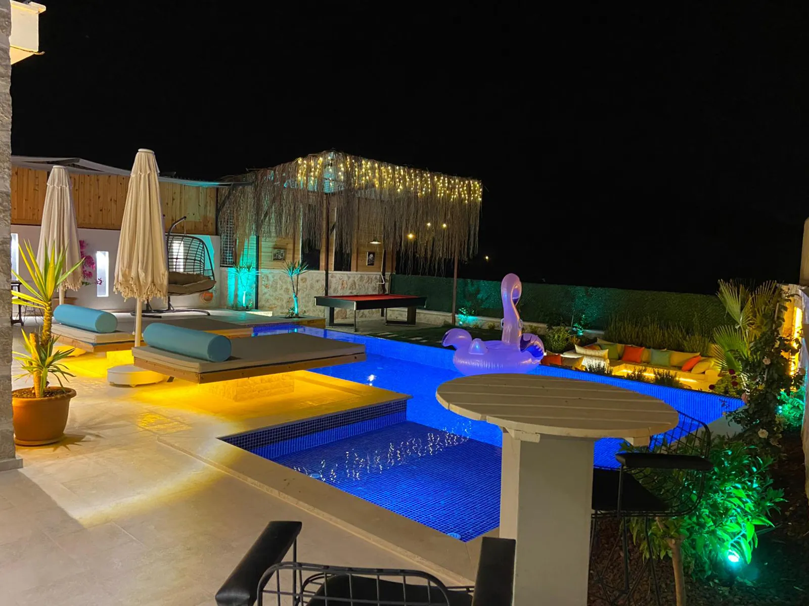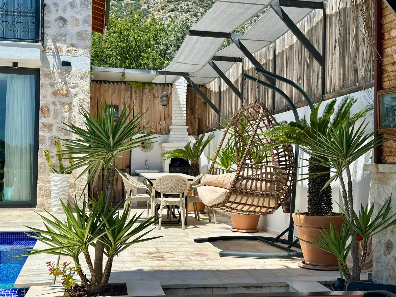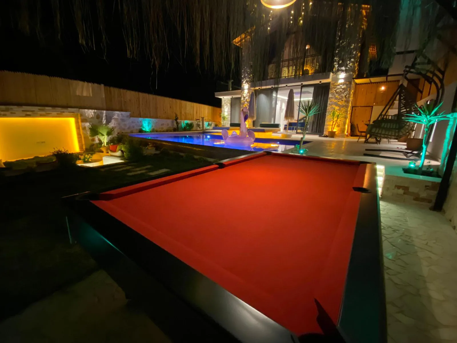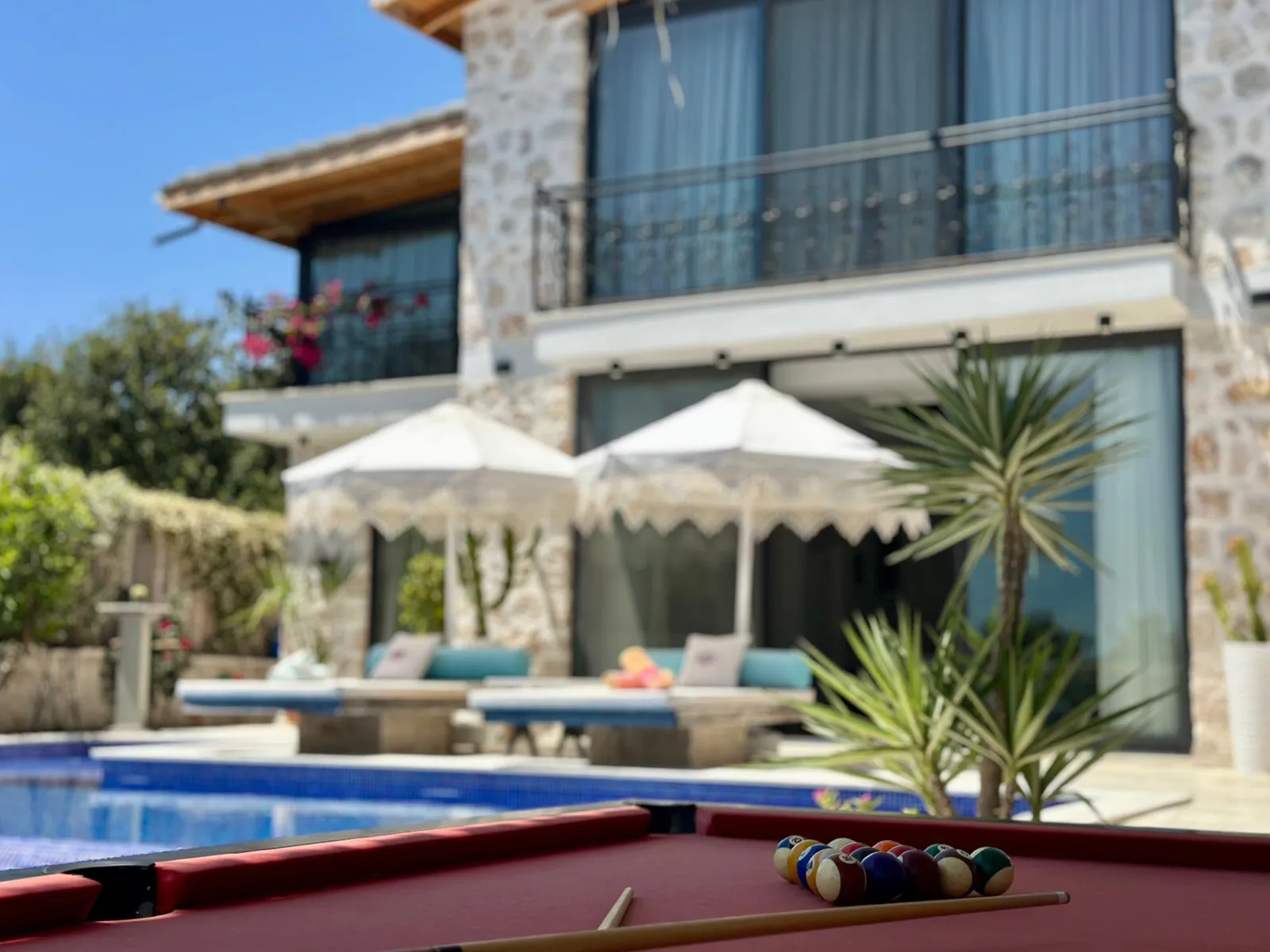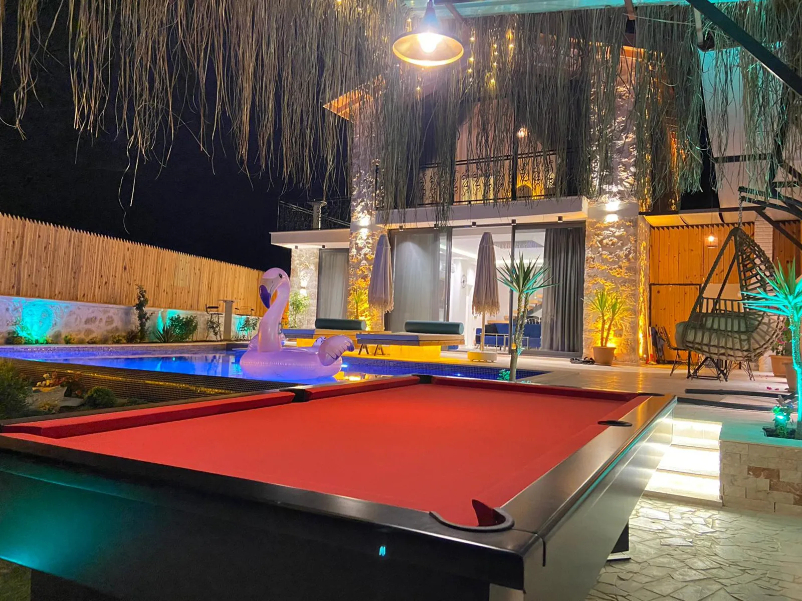 Havuz terasında şezlong, şemsiye, barbekü, salıncak, yemek masası, bilardo ve modern oturma alanı yer almaktadır.