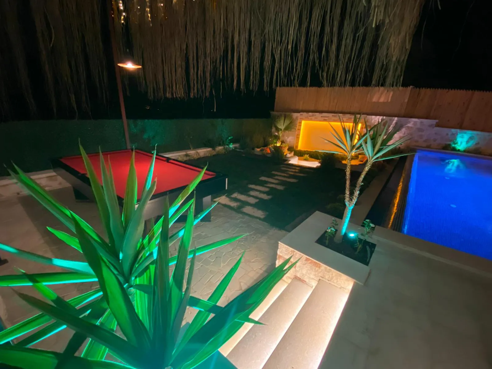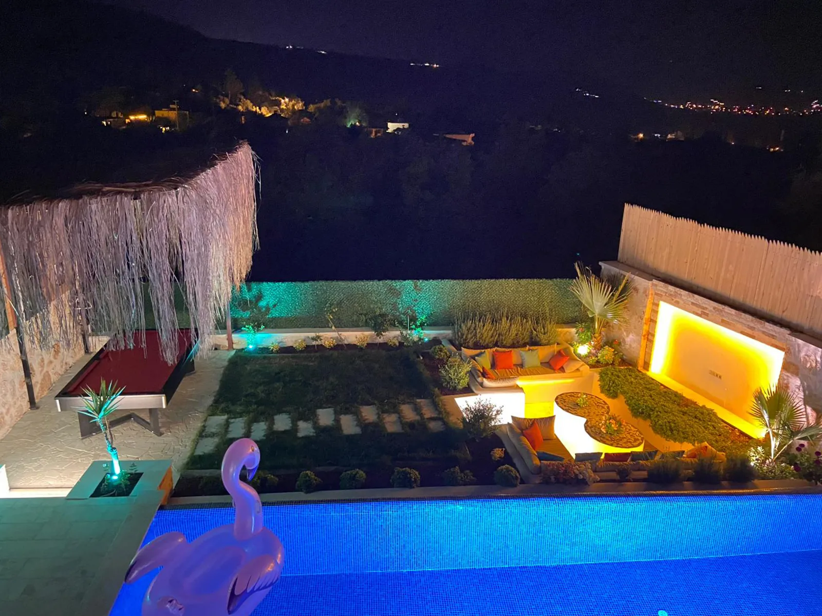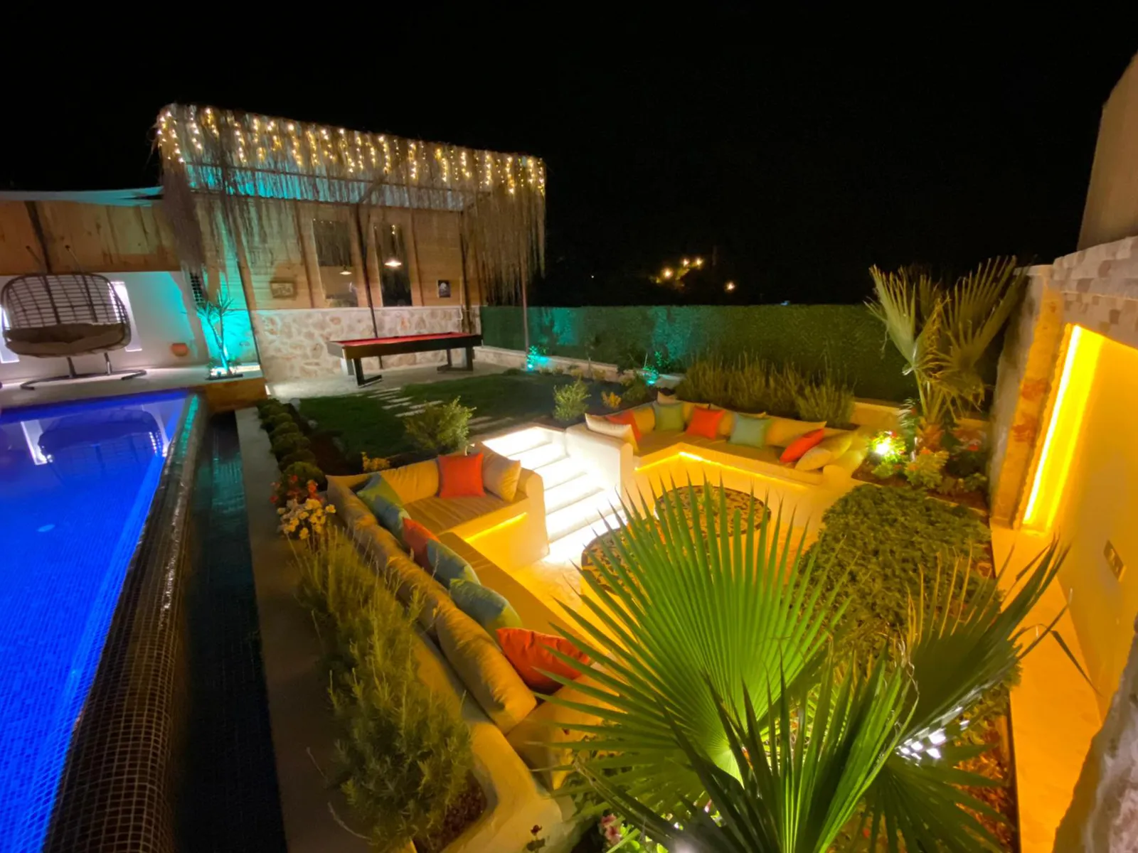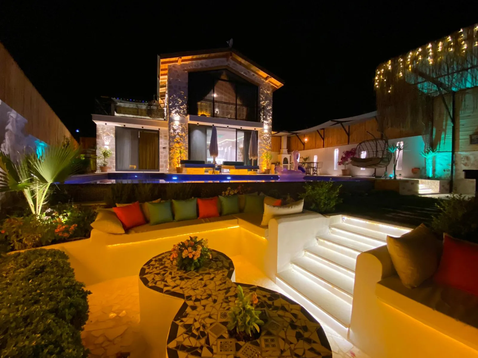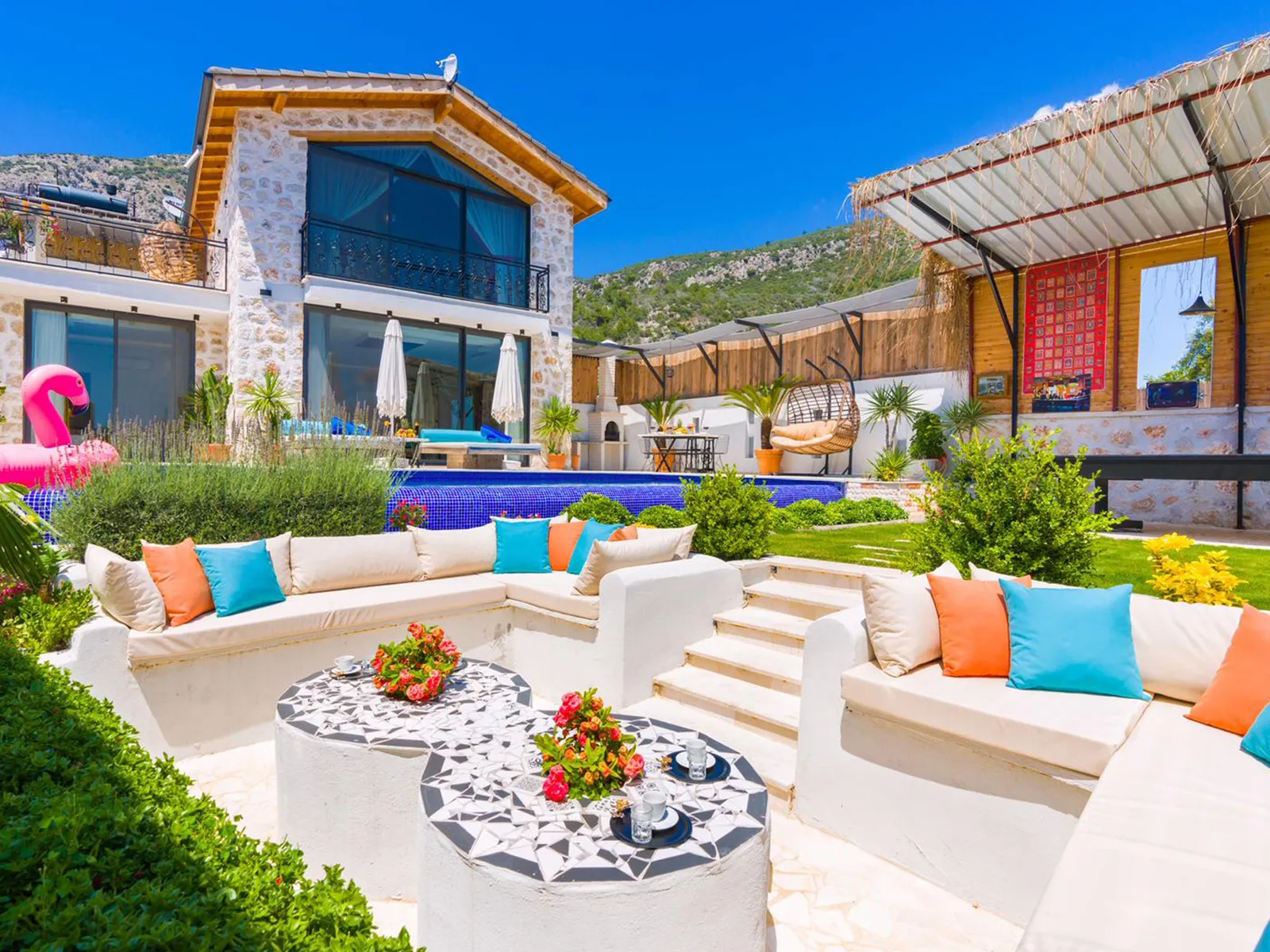 Havuz terasında şezlong, şemsiye, barbekü, salıncak, yemek masası, bilardo ve modern oturma alanı yer almaktadır.