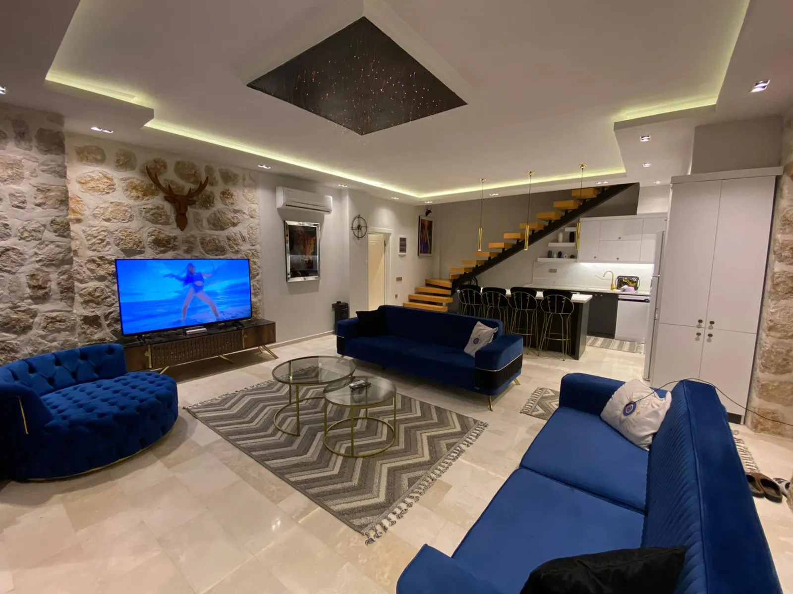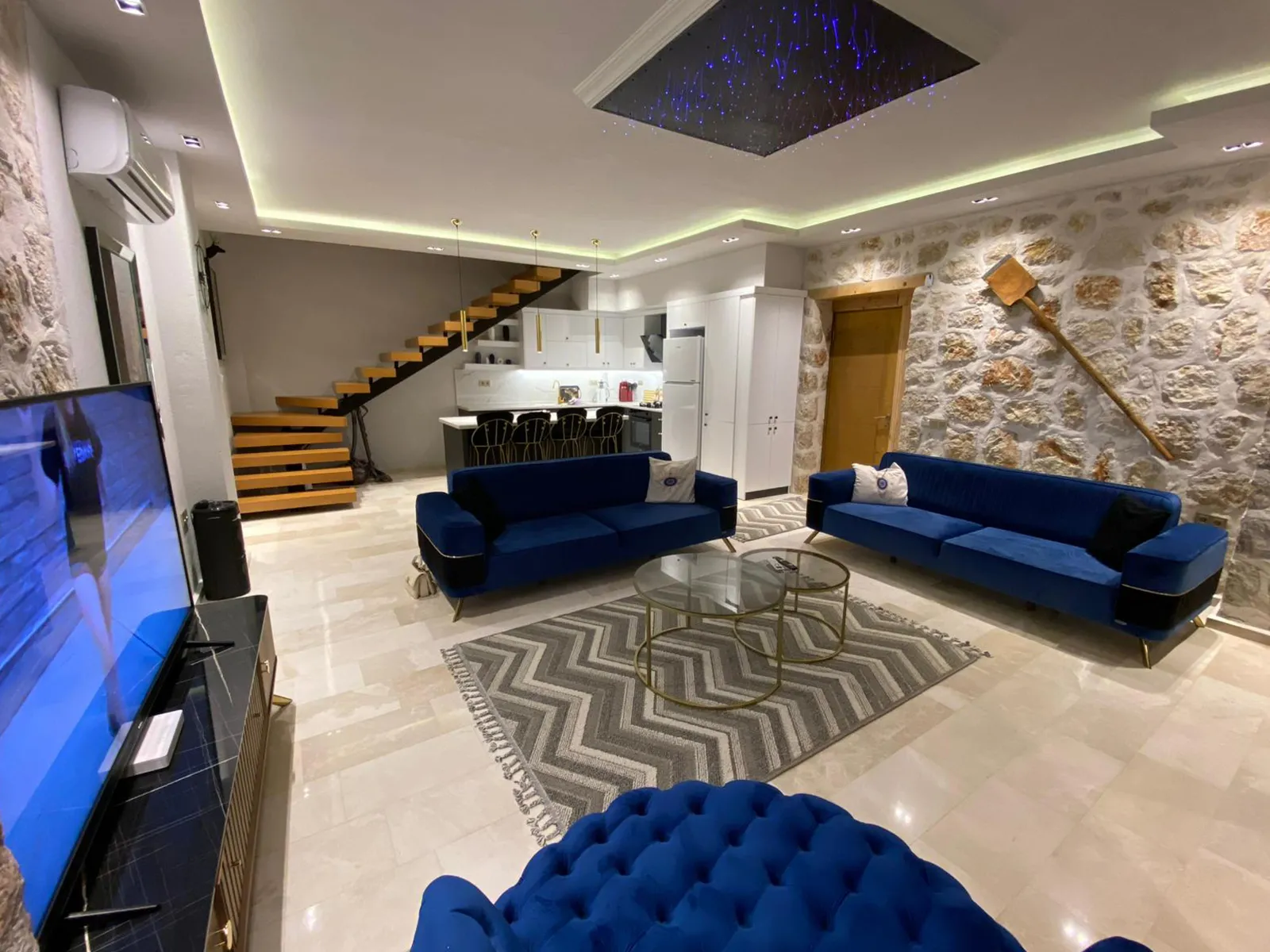 Modern oturma grubu, televizyon, kablosuz internet, klima, sehpa ve havuz terasına çıkış imkanı bulunmaktadır.