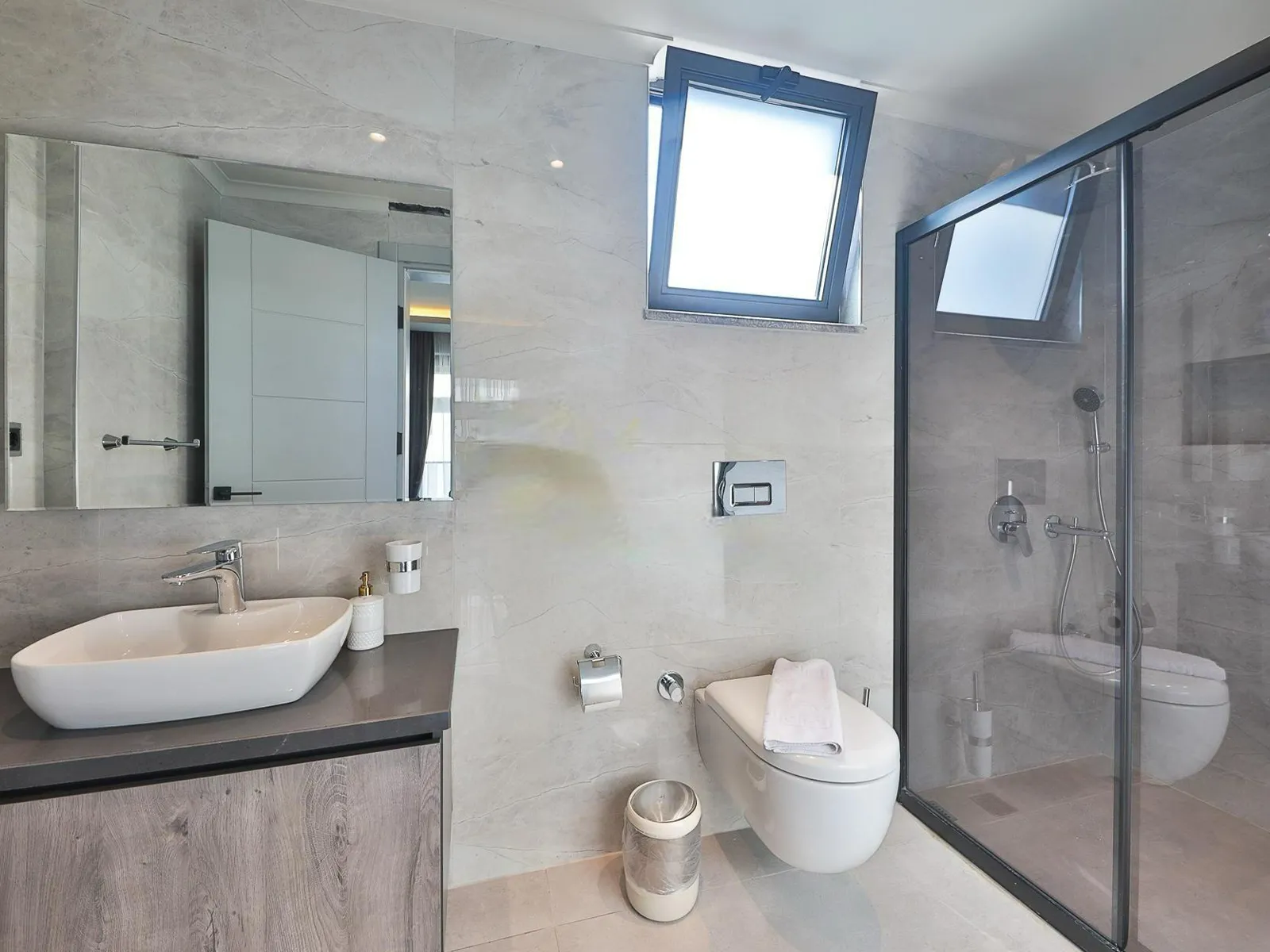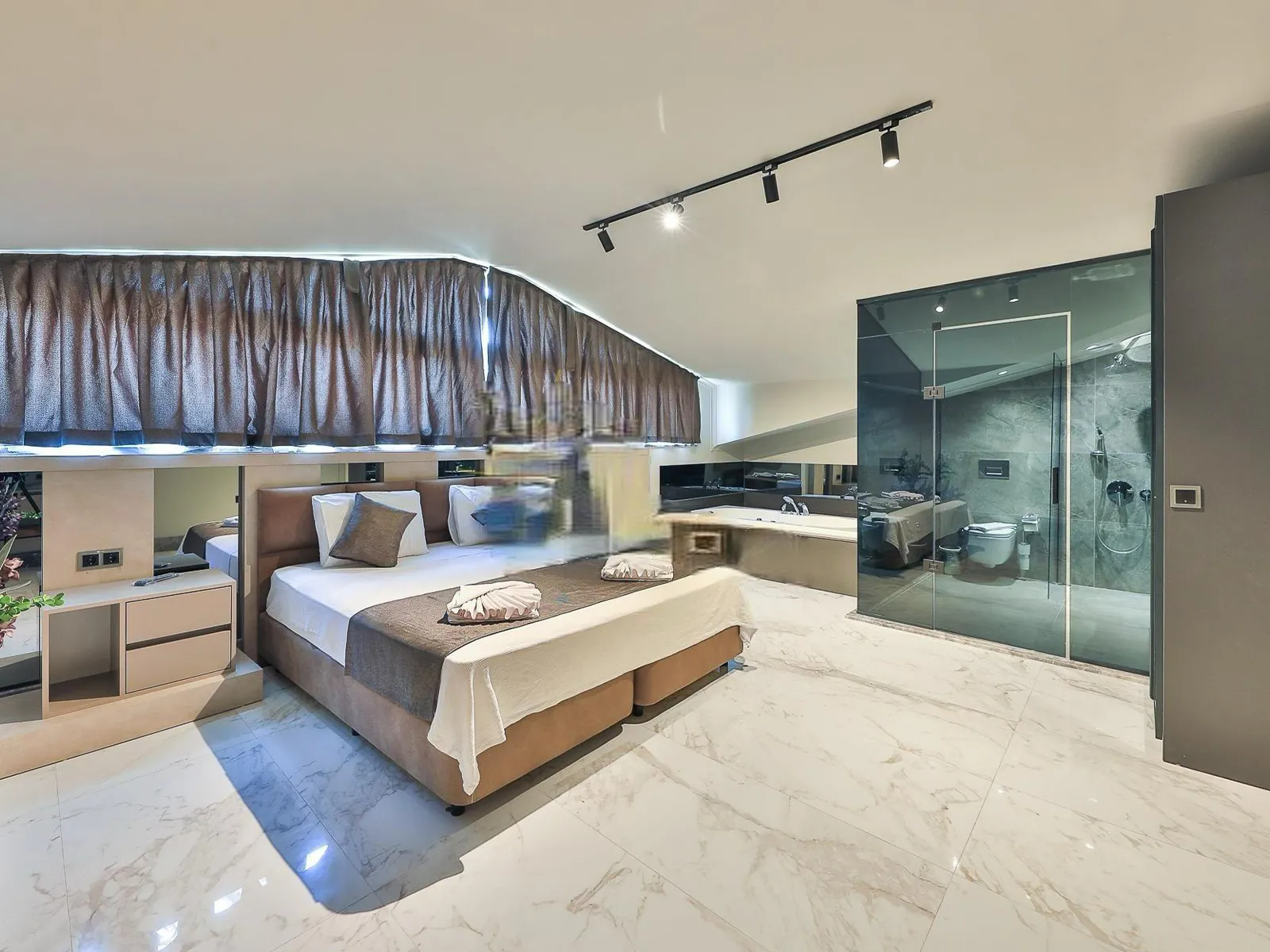 1.Yatak Odası: Çift kişilik yatak, elbise dolabı, komodin, makyaj masası, ebeveyn banyosu, klima, jakuzi, sauna