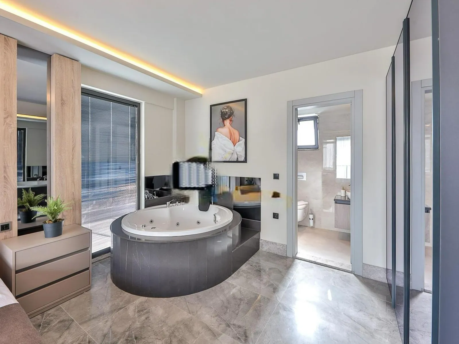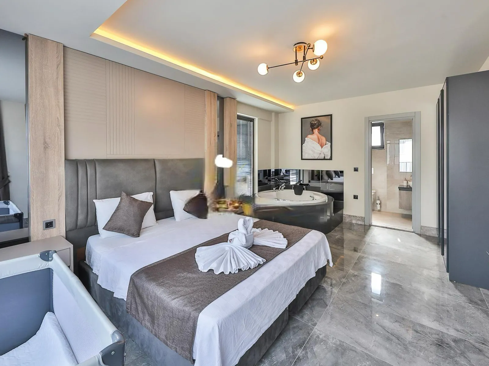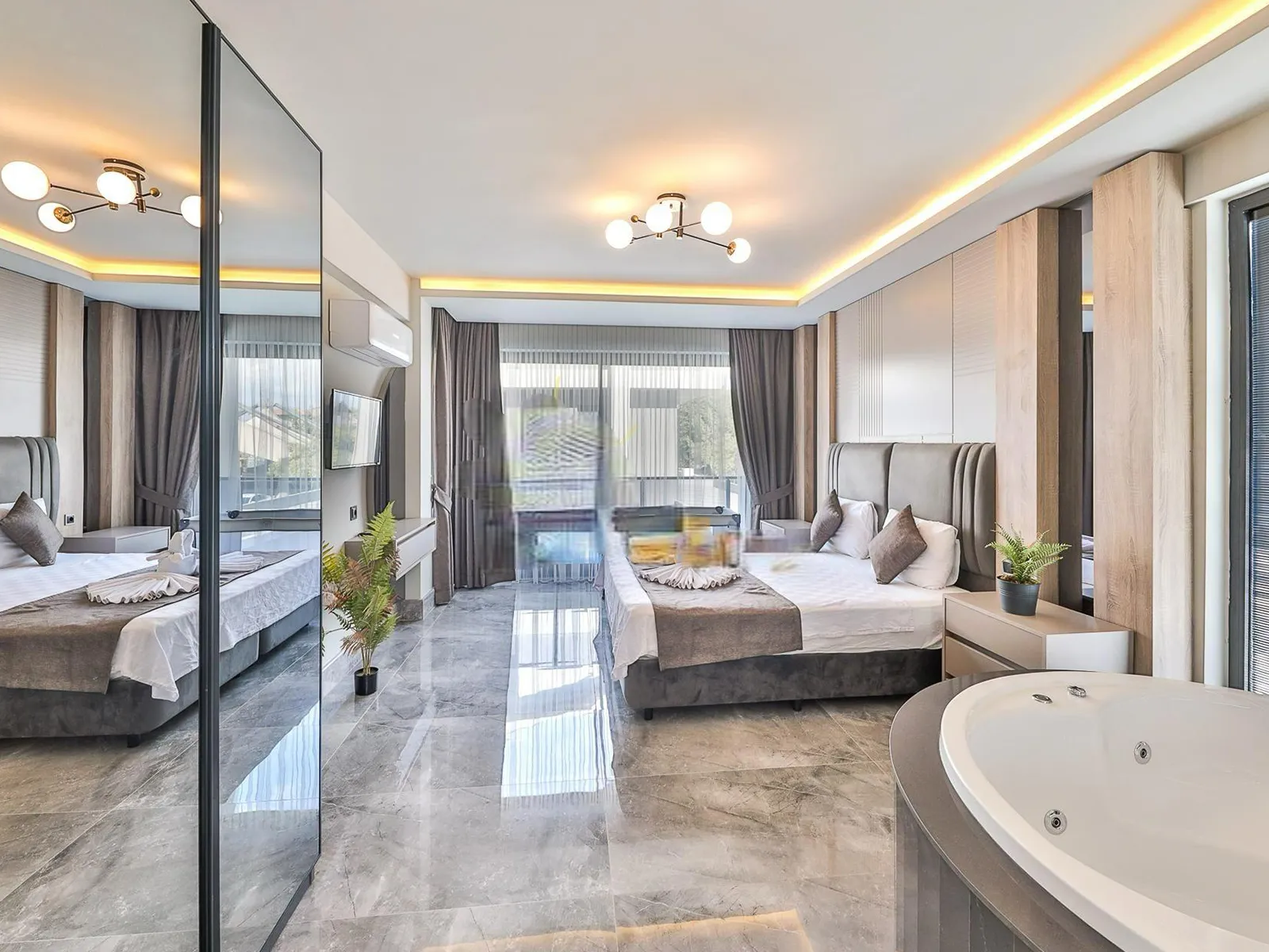 2.Yatak Odası: Çift kişilik yatak, elbise dolabı, komodin, makyaj masası, ebeveyn banyosu, klima, jakuzi