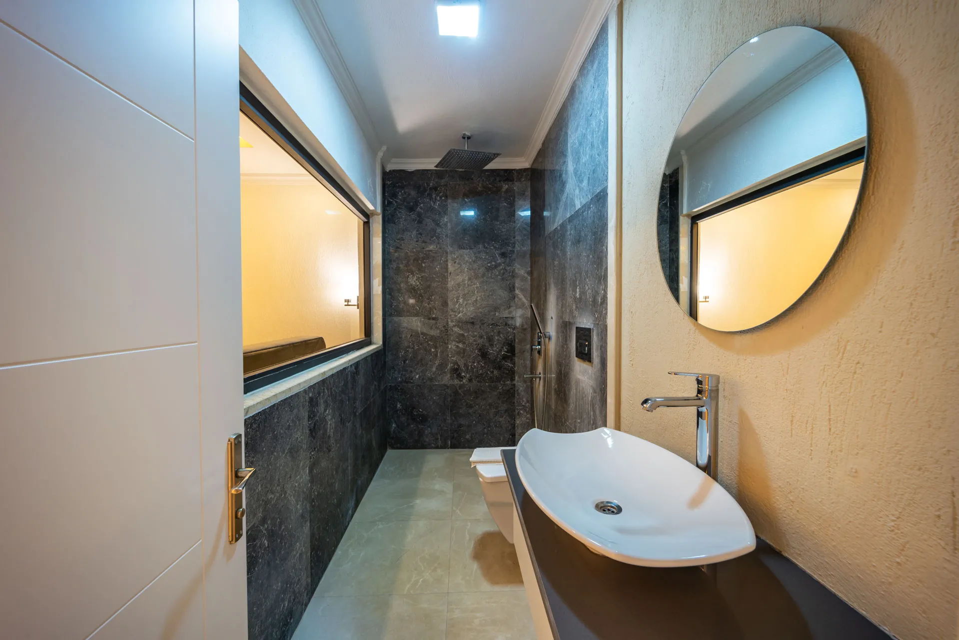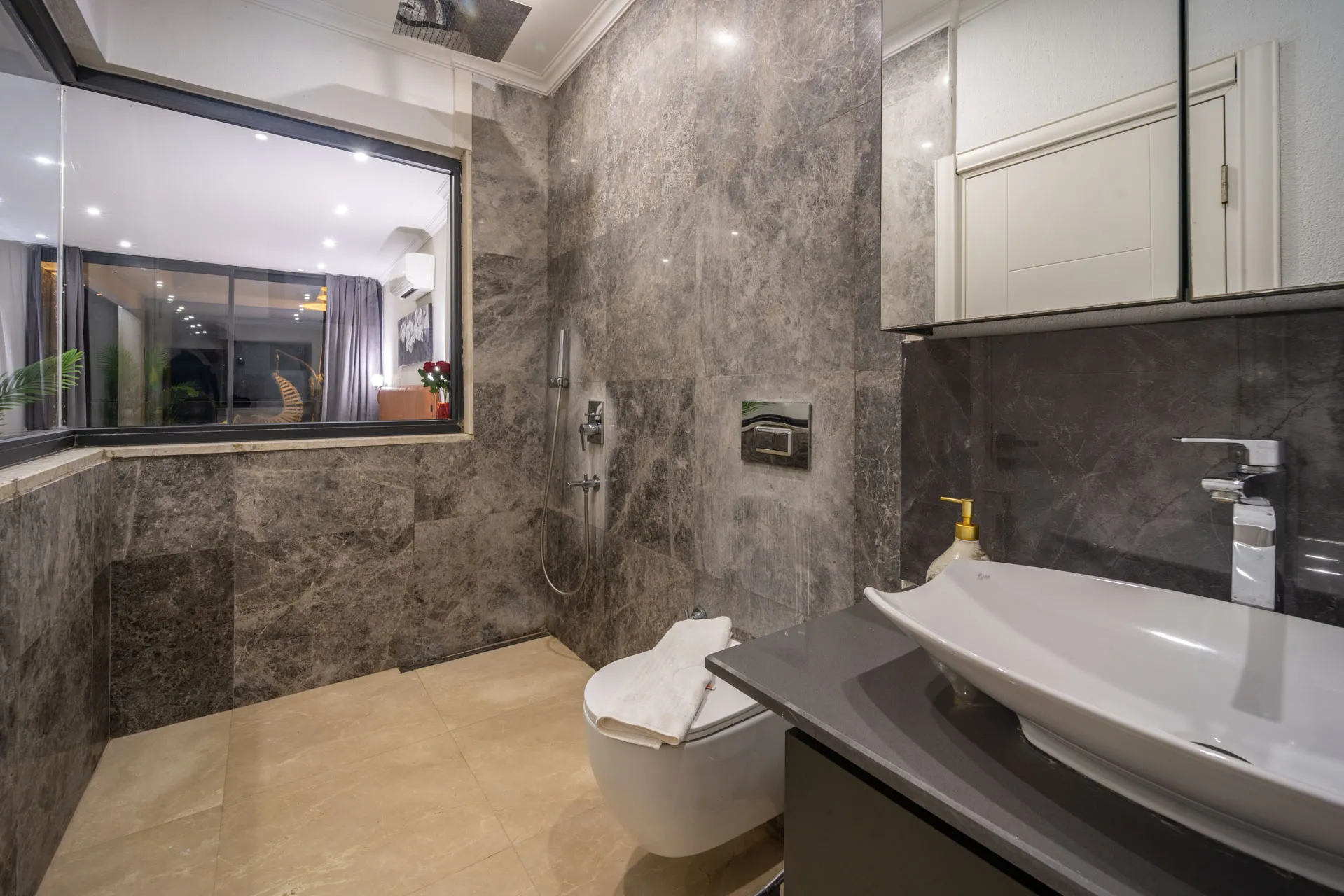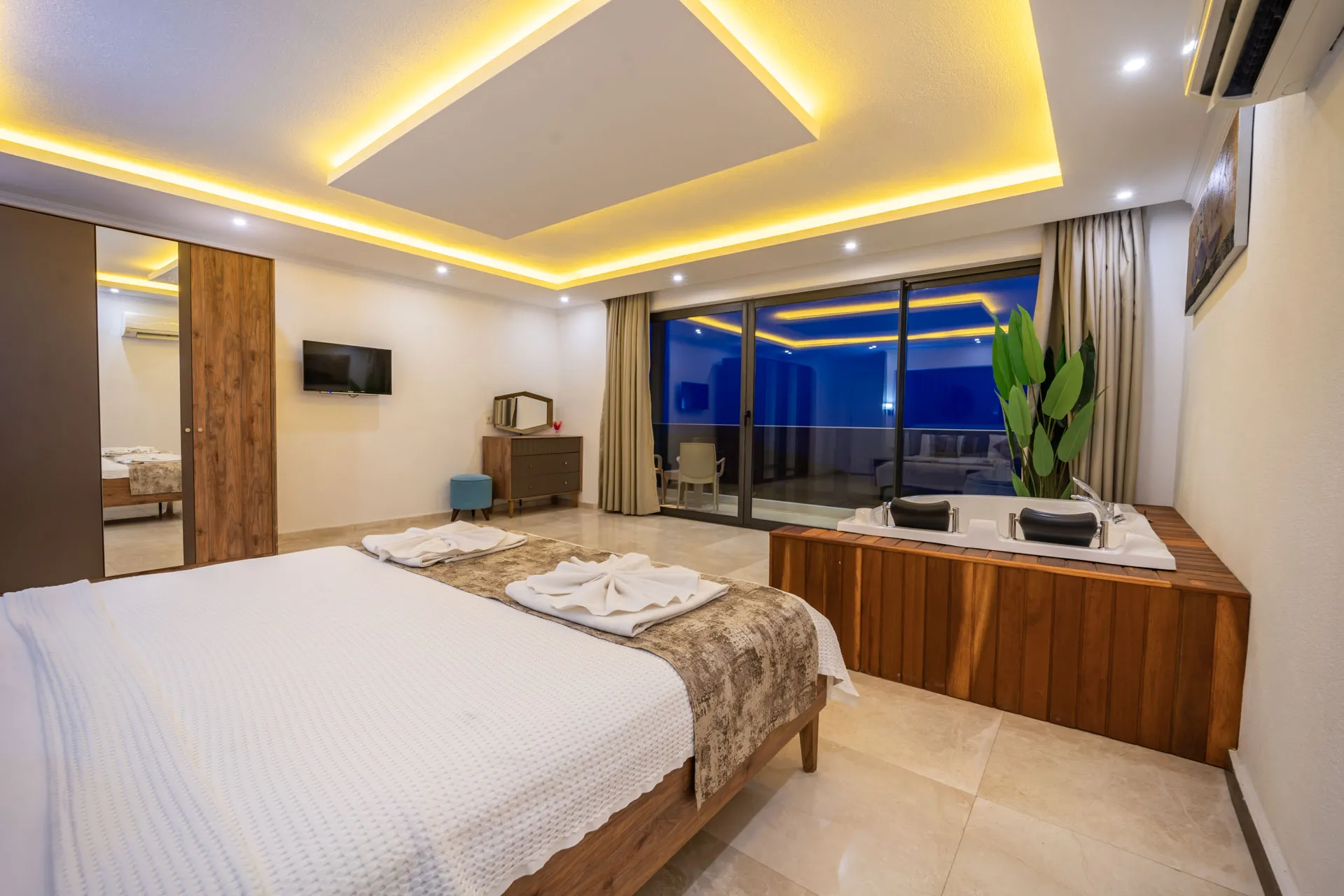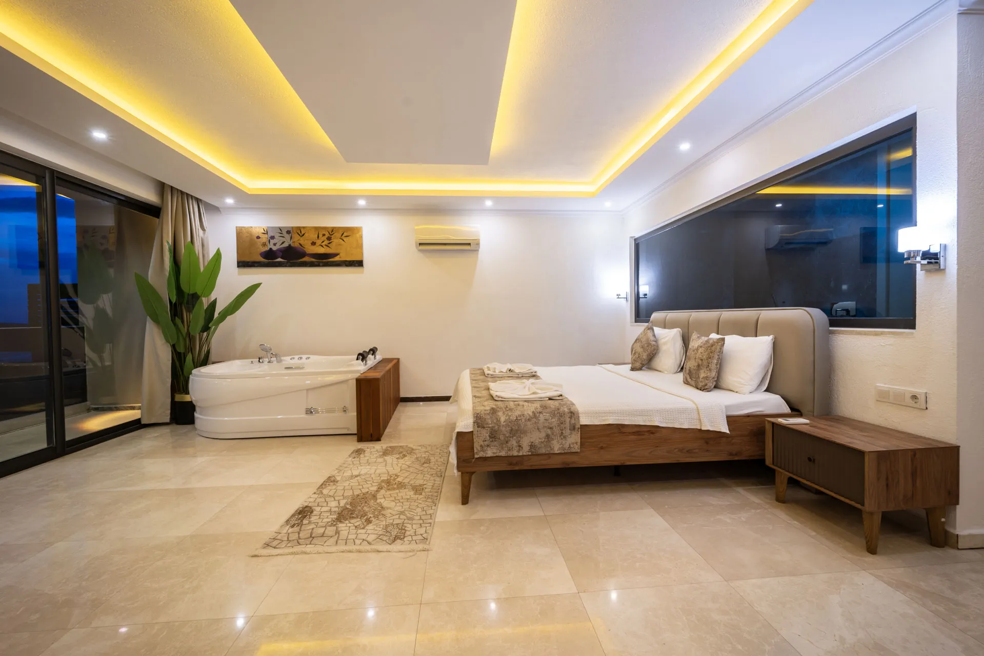 Yatak Odası: 1 adet çift kişilik yatak, komodin, makyaj masası, jakuzi, klima, banyo ve tuvalet.
