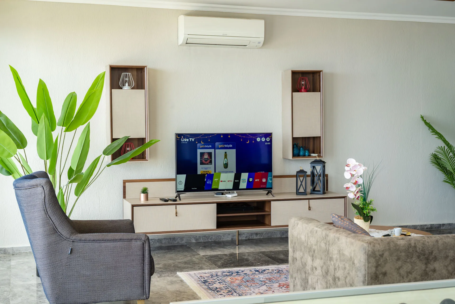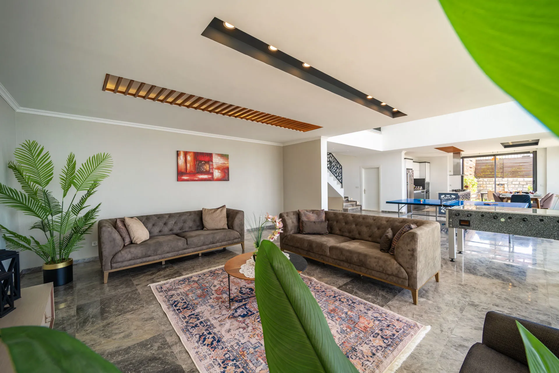 Kaliteli oturma grubu, uydu TV (LCD), klima, 6 kişilik yemek masası ve havuz terasına çıkış