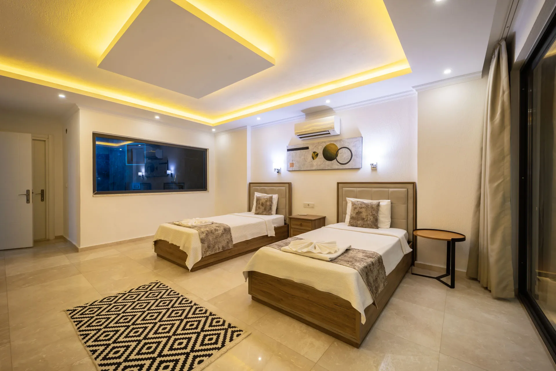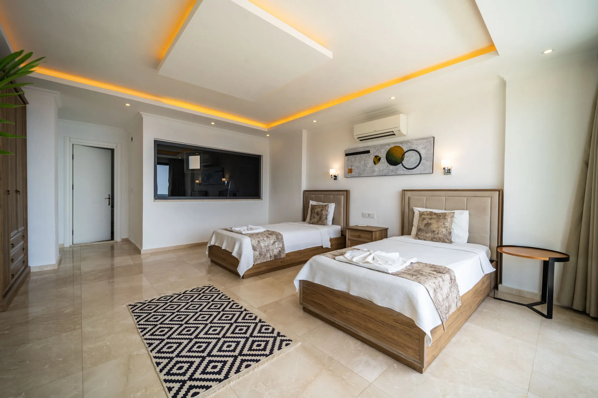 Yatak Odası: 2 adet tek kişilik yatak, komodin, makyaj masası, klima, banyo ve tuvalet.