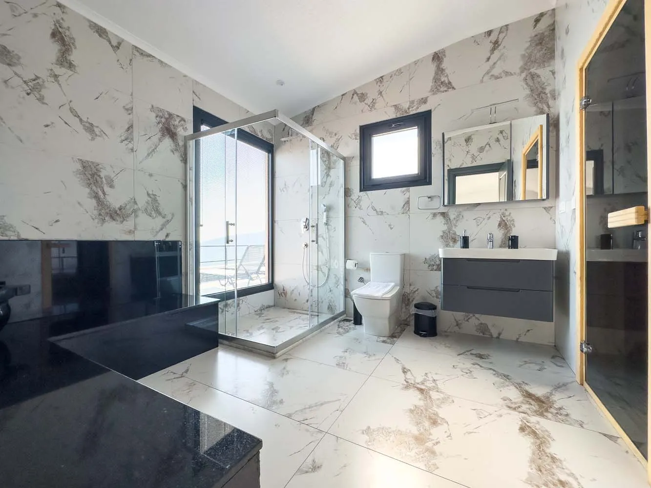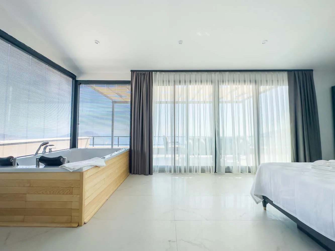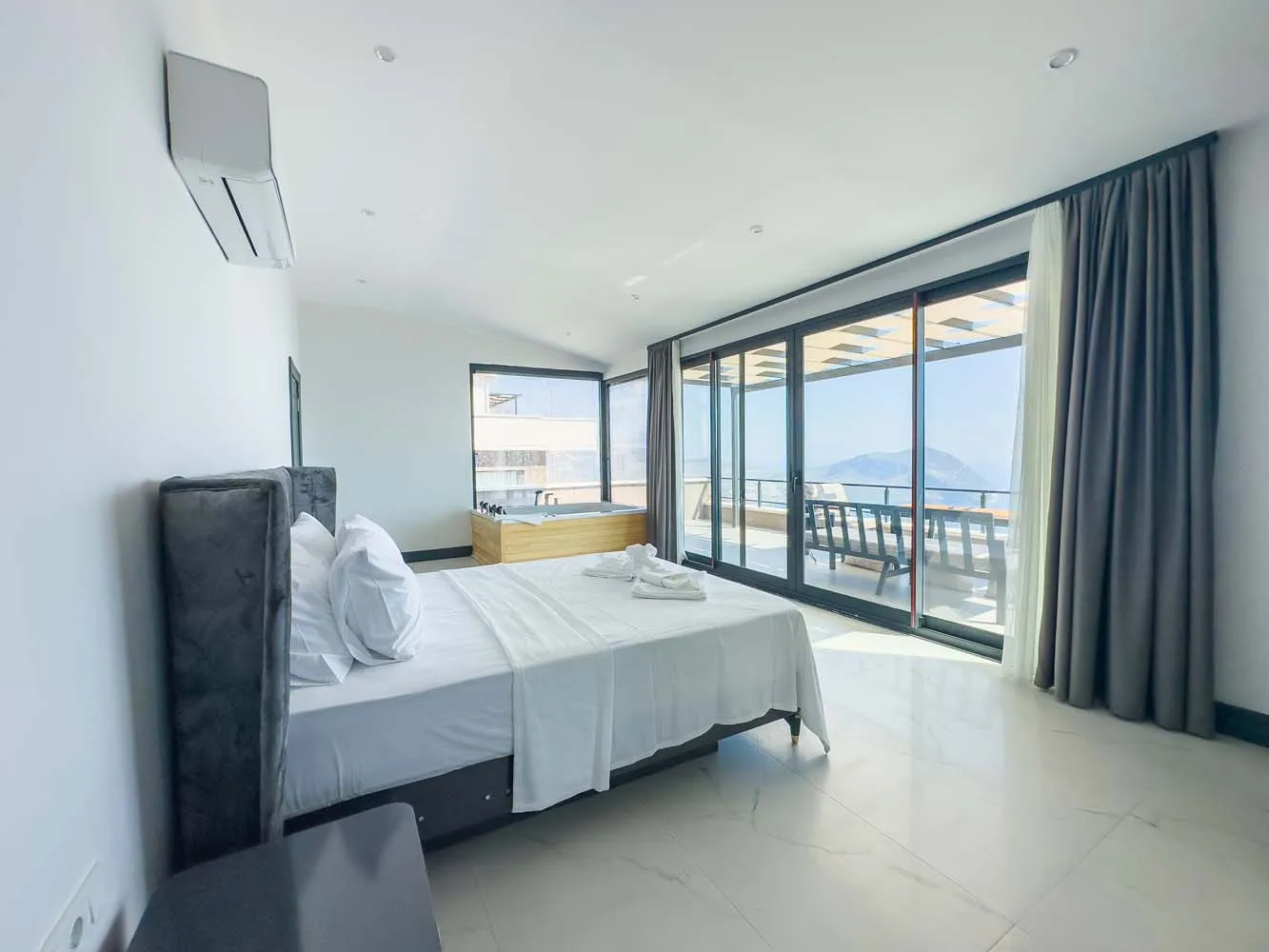 Çift kişilik yatak, elbise dolabı, komodin, klima, giyinme odası, deniz manzaralı balkon, jakuzi, sauna, Türk hamamı, balkonda oturma grubu