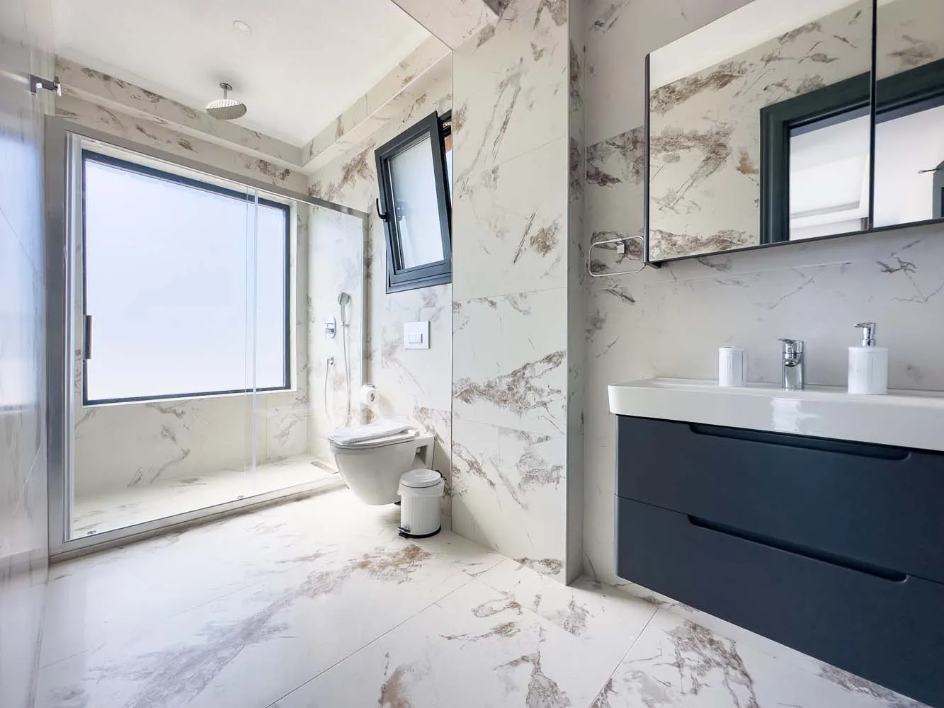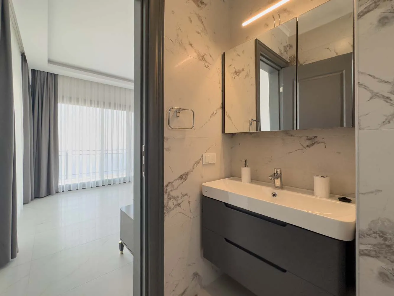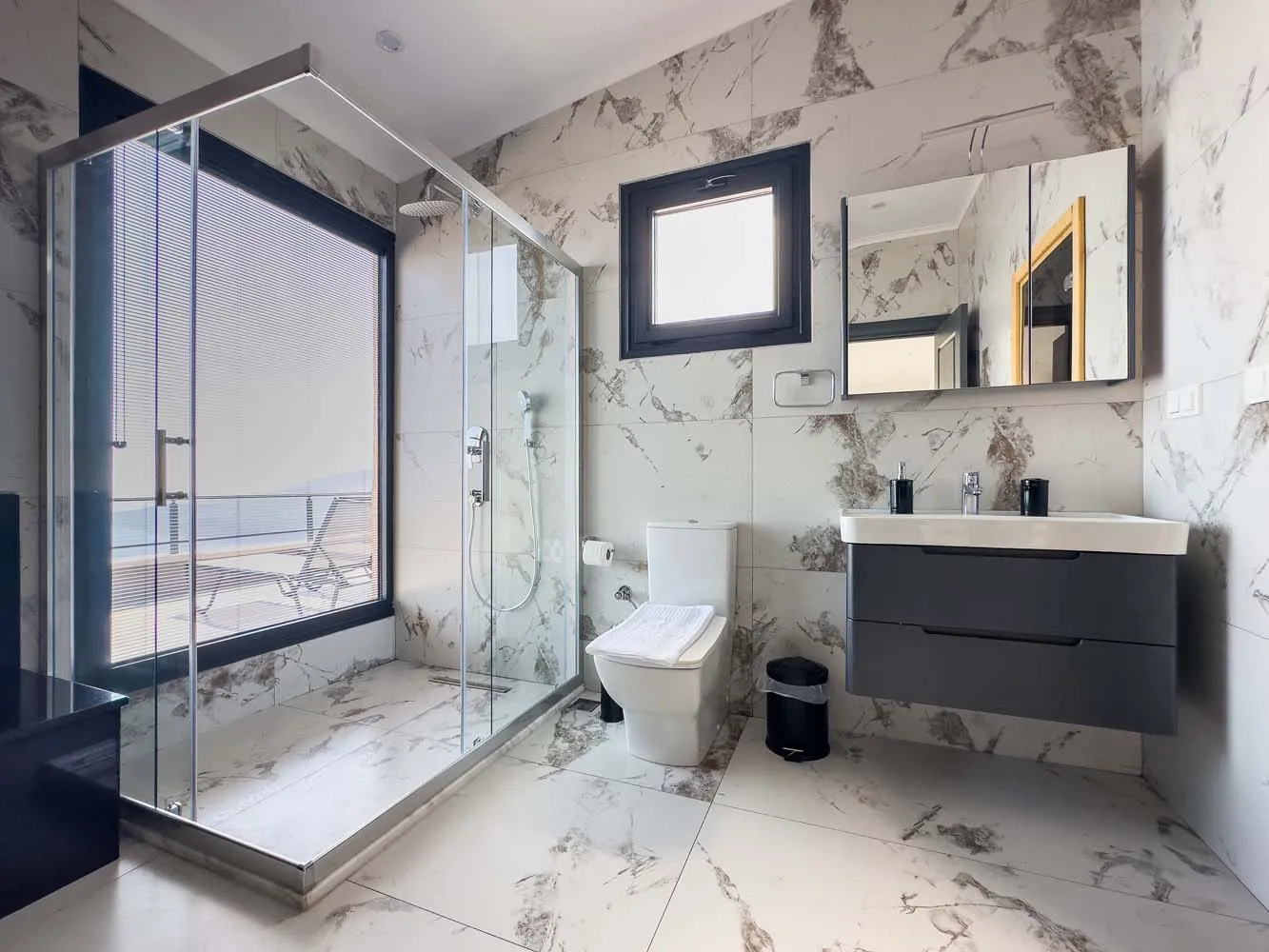 Çift kişilik yatak, elbise dolabı, komodin, klima, giyinme odası, deniz manzaralı balkon, jakuzi, sauna, Türk hamamı, balkonda oturma grubu