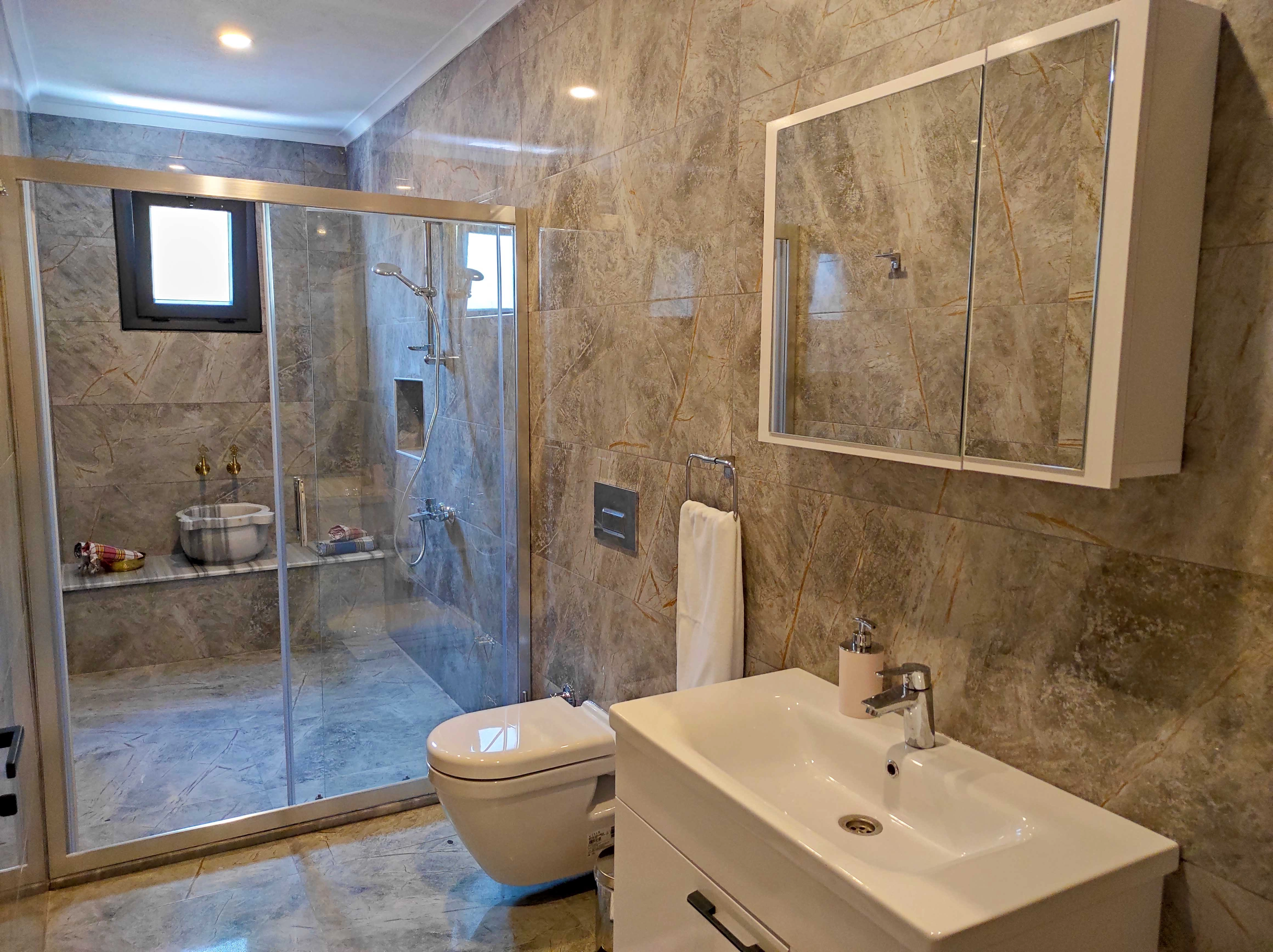 Wi‑Fi, uydu TV ve özel otopark gibi günlük ihtiyaçlarınızı karşılayan olanaklar; merkeze ve denize yakın konumuyla da dikkat çeker. Market, restoran ve toplu taşıma noktalarına yaklaşık 1 km uzaklıkta olan villa, sessizlik ve mahremiyeti sevenler için özenle tasarlanmıştır.