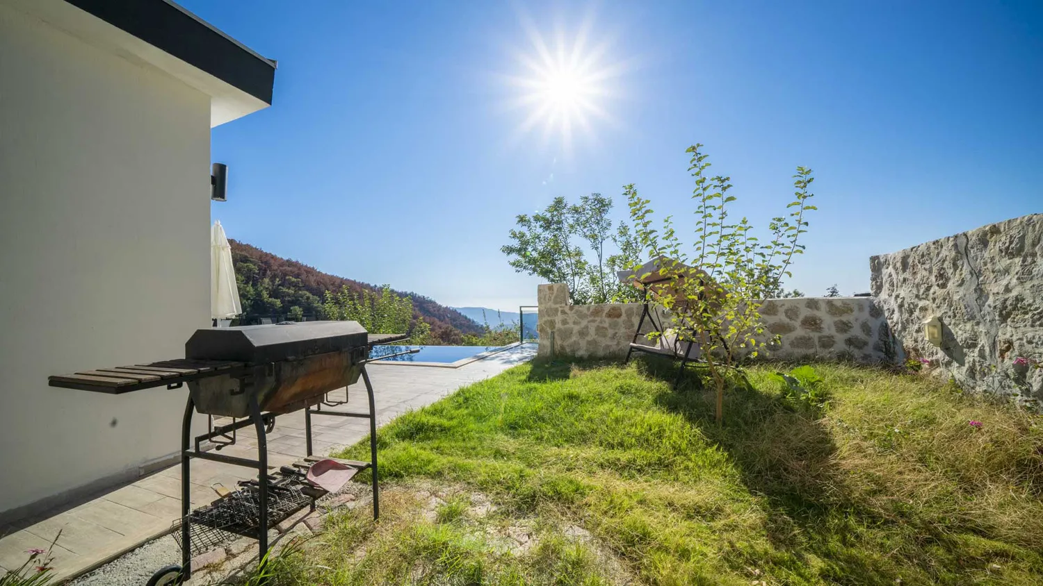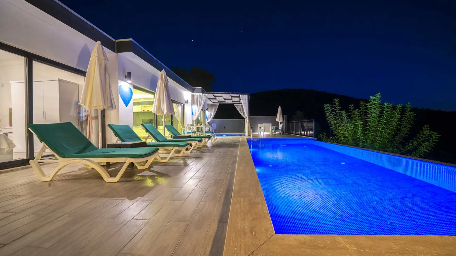 Villamızın özel yüzme havuzu (10 m x 4 m, derinlik: 1.55 m) ve jakuzili havuzu (4 m x 2.5 m) misafirlerin keyifli saatler geçirmesi için ideal bir alan oluşturuyor. Ayrıca havuz terasında şezlonglar, güneş şemsiyeleri ve bahçe mobilyaları, güneşin tadını çıkarırken dinlenebileceğiniz alanlar sağlıyor.