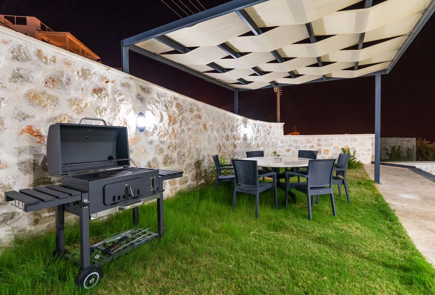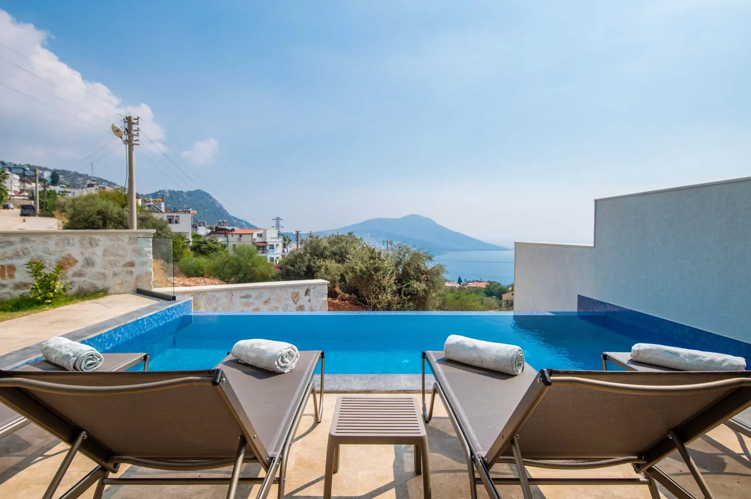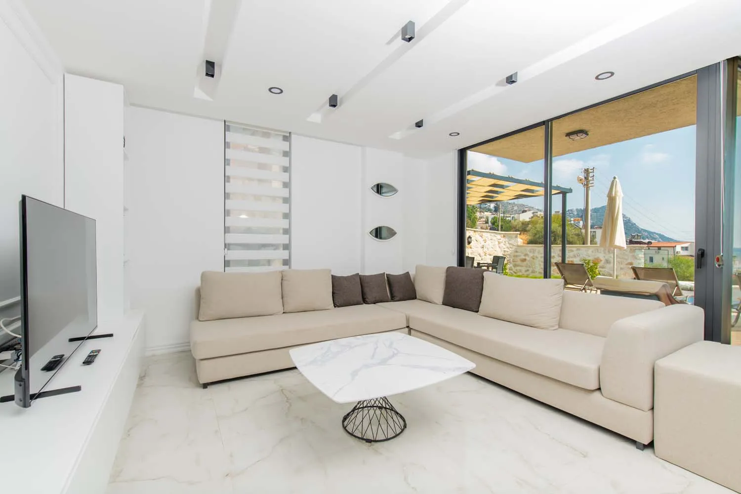 Villanın dış alanı, tatilin en keyifli anlarının yaşandığı bölümlerden biridir. Geniş yüzme havuzu, güneşlenme alanları ve şezlonglar, gün boyu Akdeniz güneşinin tadını çıkarmanız için idealdir. Barbekü alanı ise akşam saatlerinde sevdiklerinizle keyifli sofralar kurmanıza olanak tanır. Deniz manzarası eşliğinde vakit geçirebileceğiniz teras alanı, ayrıcalıklı kılan detaylar arasında yer alır.