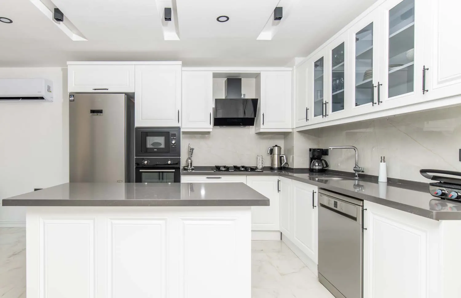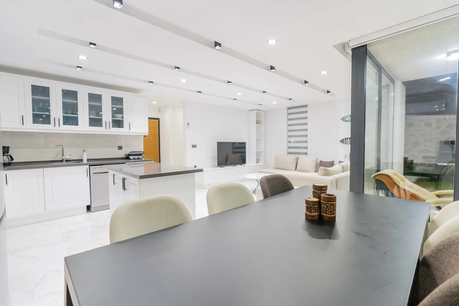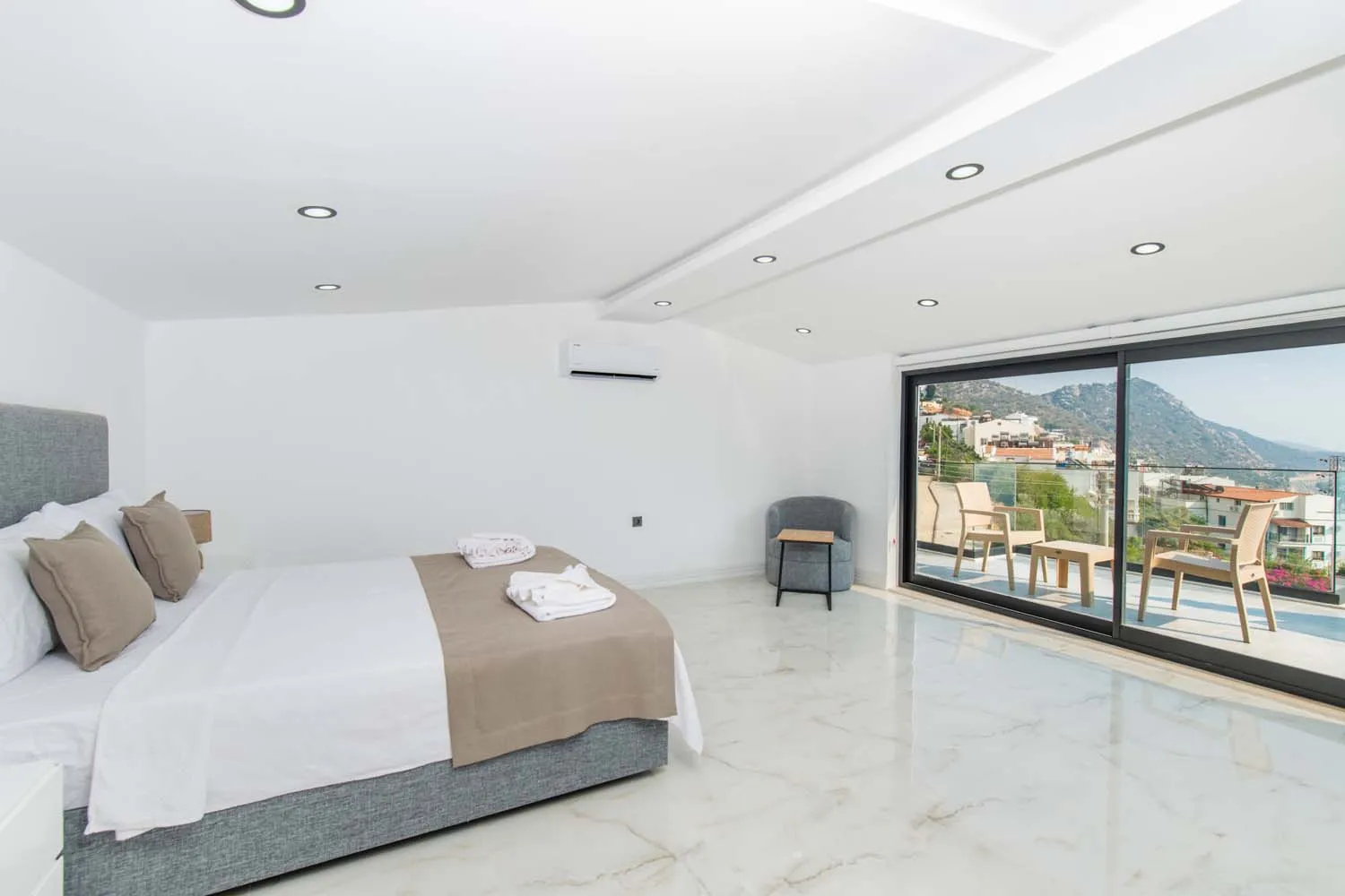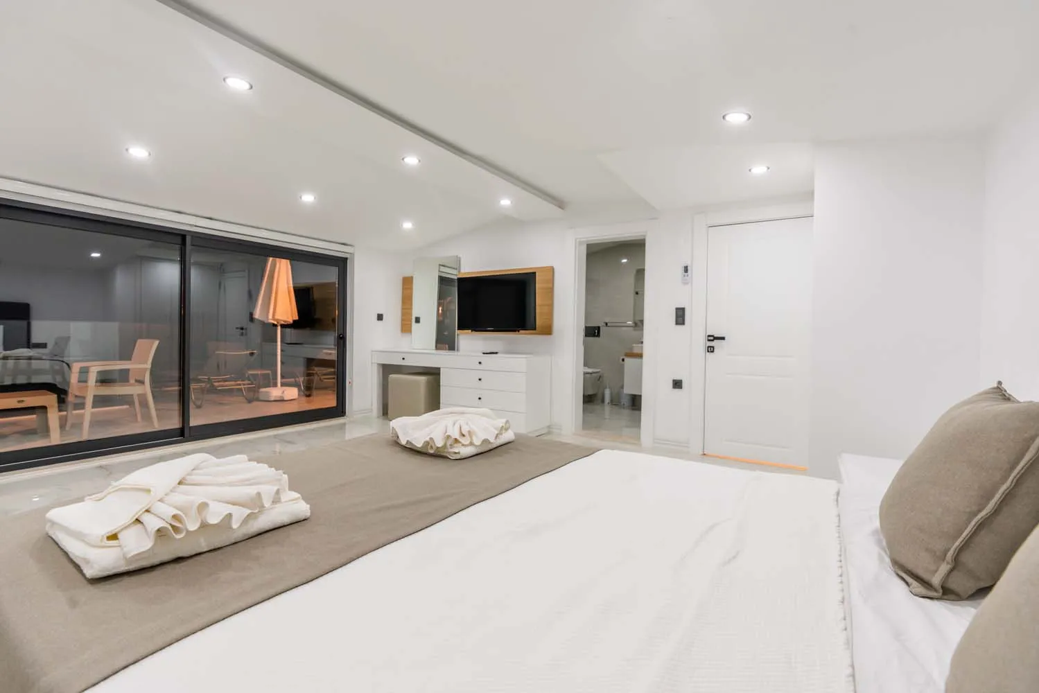 Villanın dış alanı, tatilin en keyifli anlarının yaşandığı bölümlerden biridir. Geniş yüzme havuzu, güneşlenme alanları ve şezlonglar, gün boyu Akdeniz güneşinin tadını çıkarmanız için idealdir. Barbekü alanı ise akşam saatlerinde sevdiklerinizle keyifli sofralar kurmanıza olanak tanır. Deniz manzarası eşliğinde vakit geçirebileceğiniz teras alanı, ayrıcalıklı kılan detaylar arasında yer alır.
