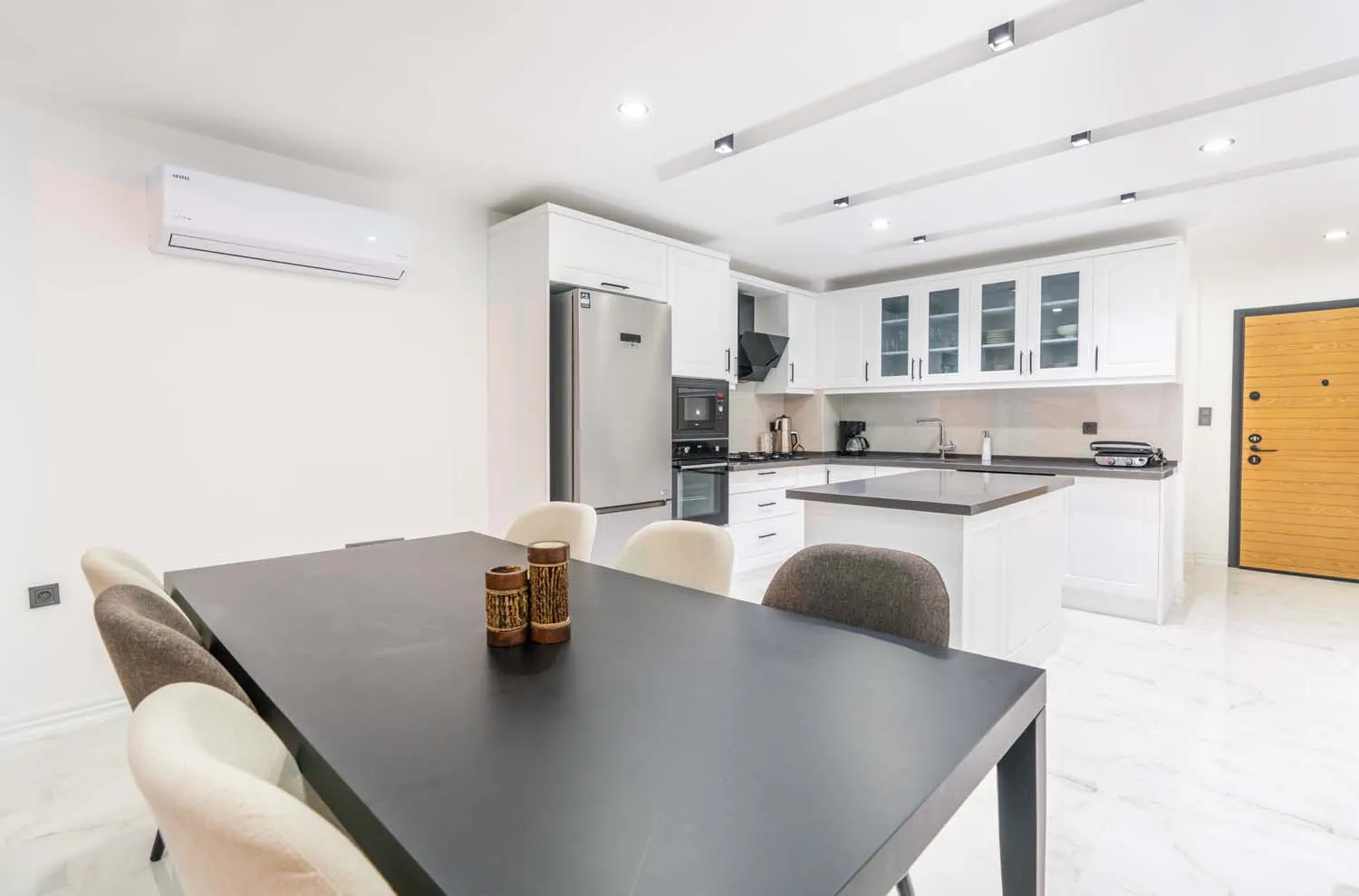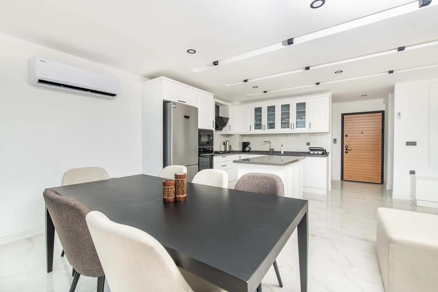 Toplam 3 yatak odasına sahip olan, geniş aileler ve arkadaş grupları için ideal bir konaklama kapasitesi sunmaktadır. Villanın iç mekânları çağdaş bir anlayışla dekore edilmiş olup, ferah salon alanı, konforlu oturma grubu ve modern detaylarıyla dikkat çeker. Salon bölümünde televizyon, klima ve dinlenme alanı bulunurken, açık plan mutfak kısmı günlük kullanım için gerekli tüm temel mutfak ekipmanlarıyla donatılmıştır. Yemek alanı, hem iç mekânda hem de dış alanda keyifli sofralar kurmanıza olanak tanır.