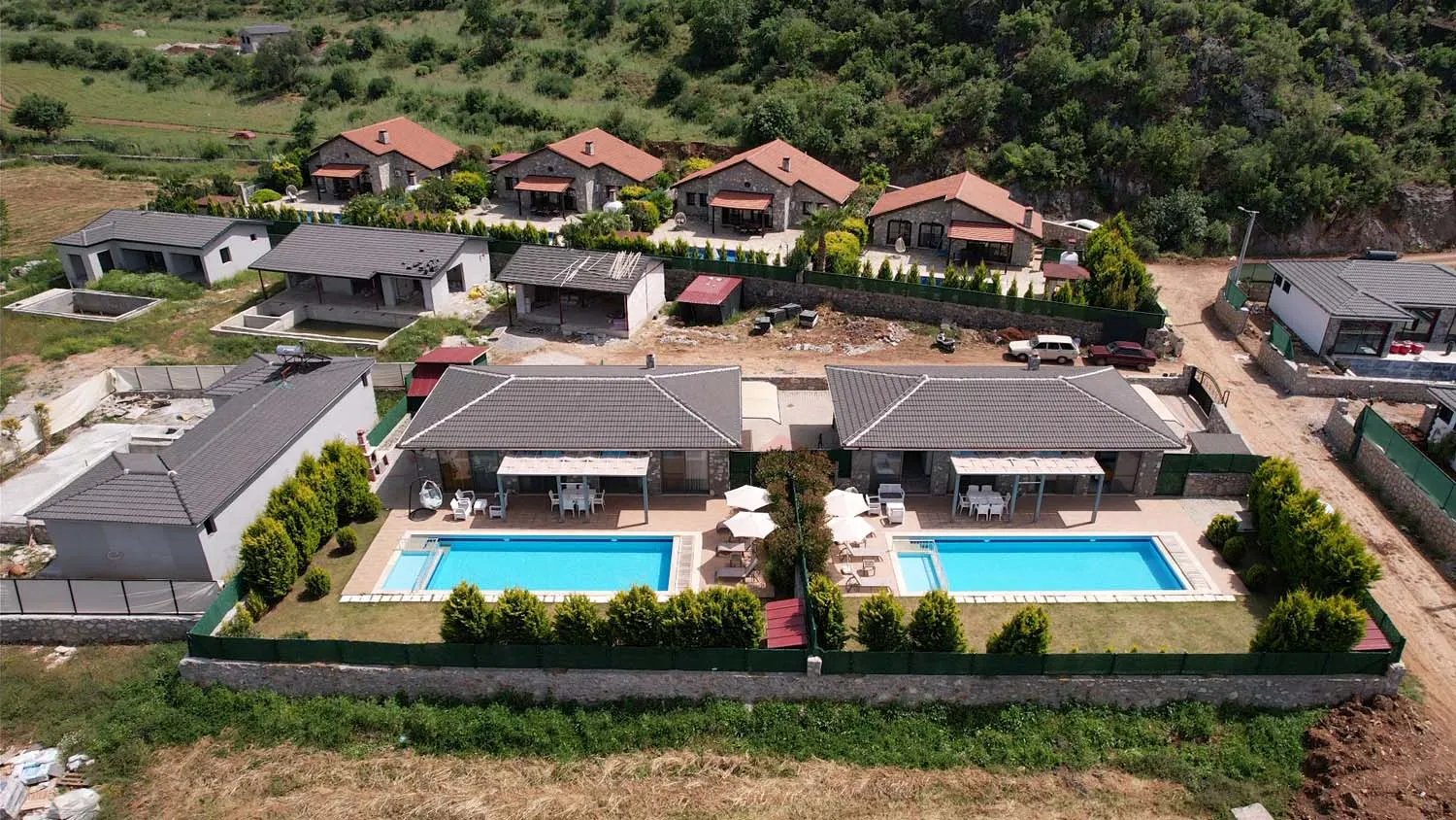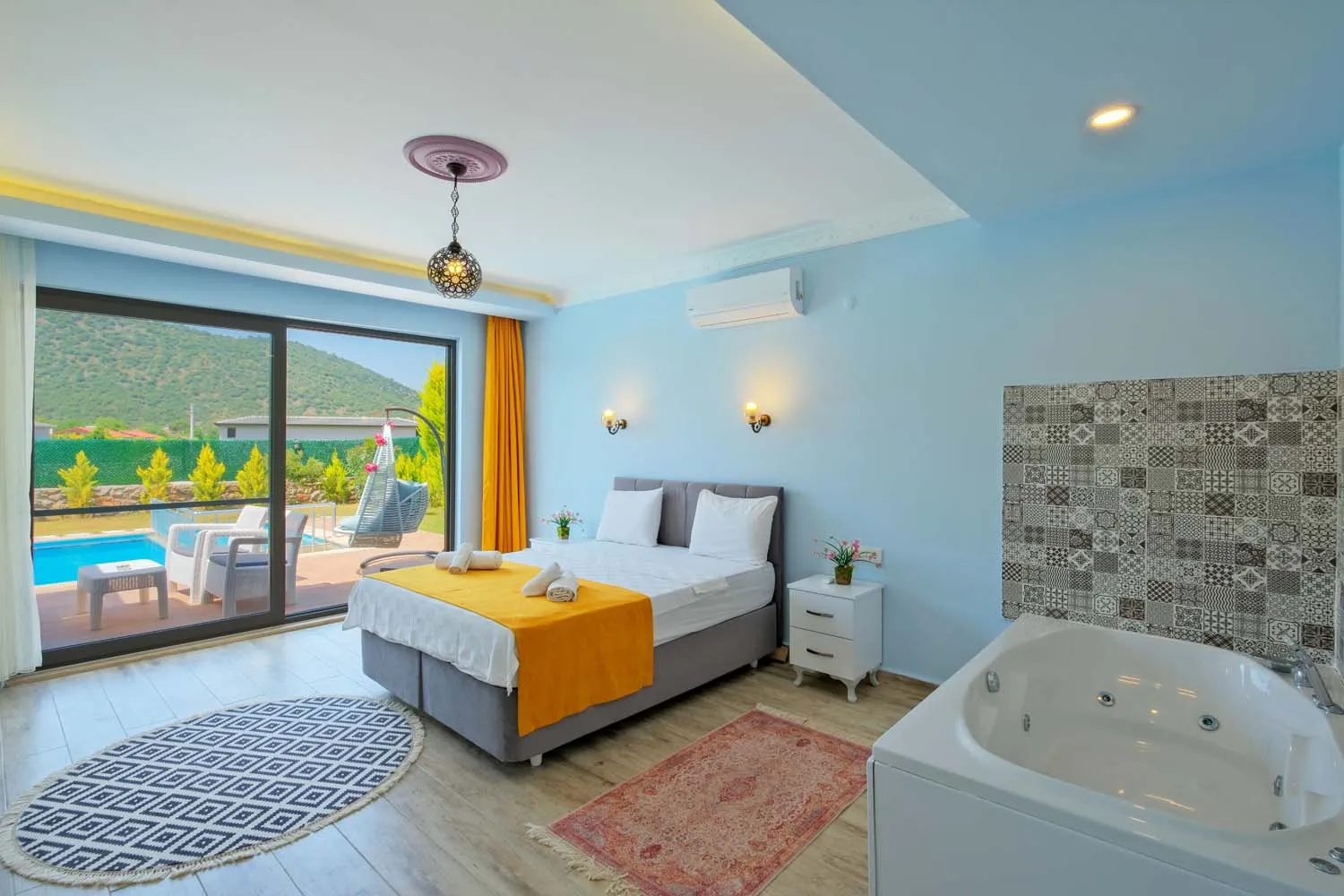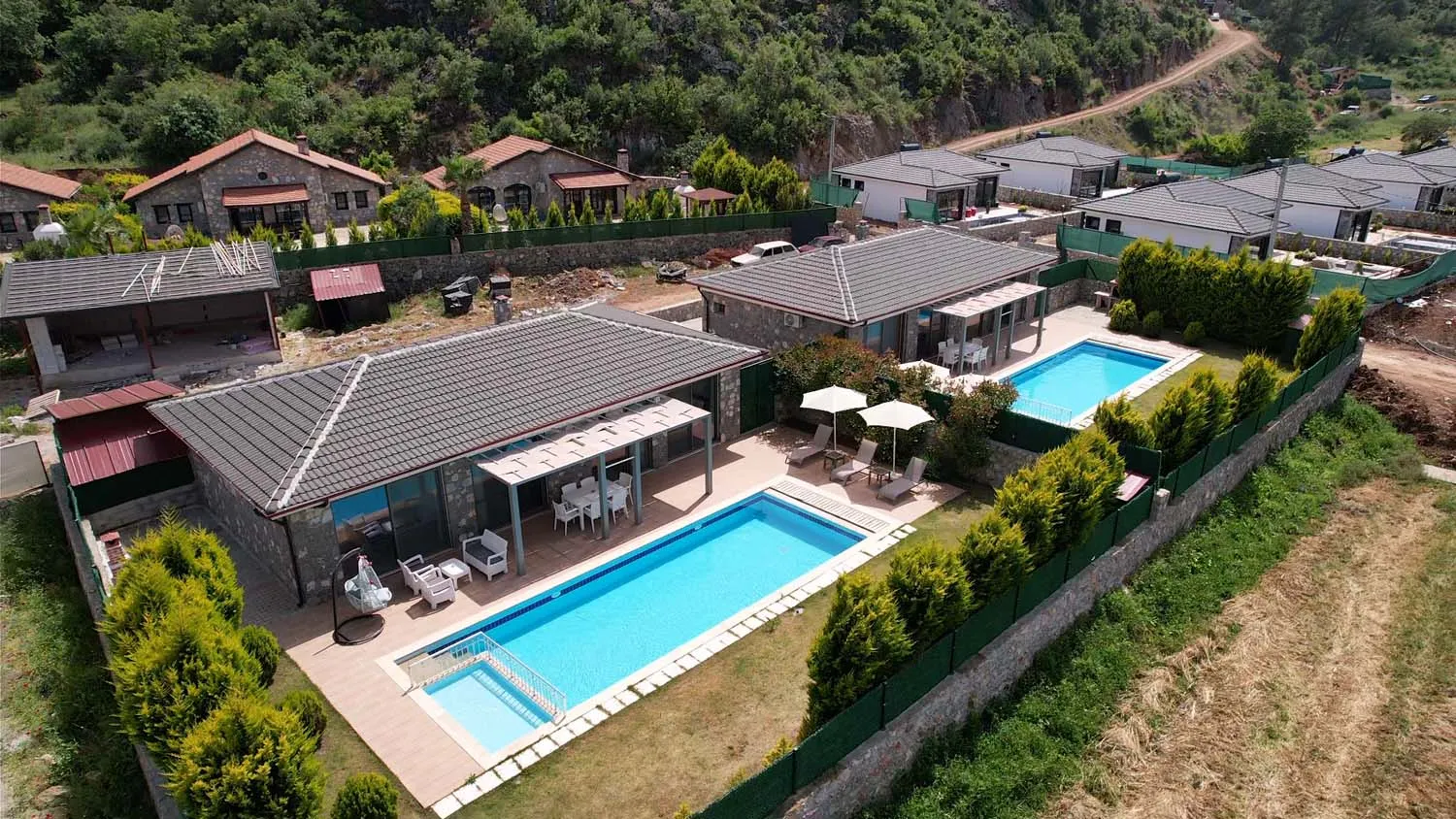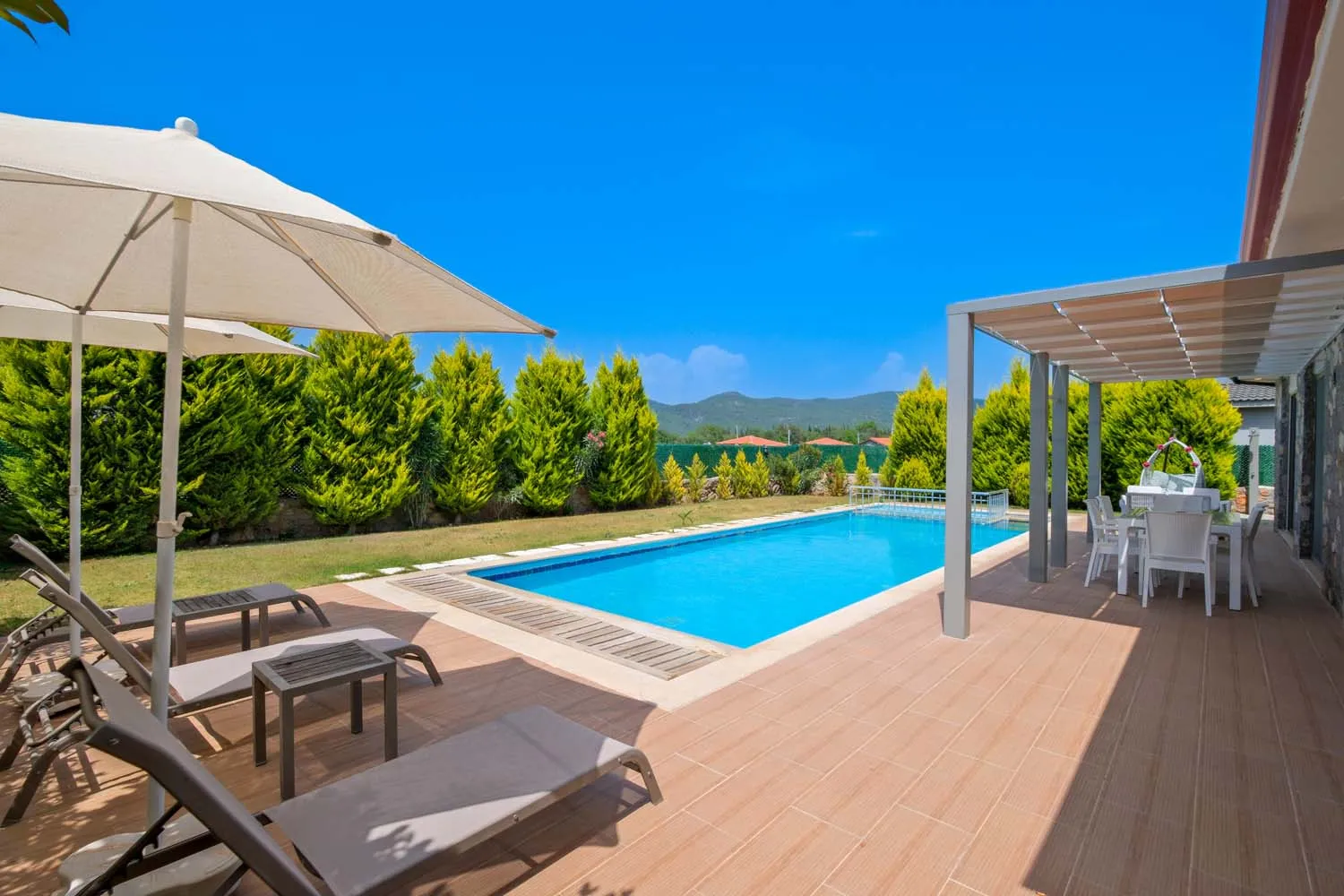 Ebeveyn yatak odasında jakuzi de bulunan villamızın havuz alanı korunaklıdır ve dışarıdan görünmemektedir.