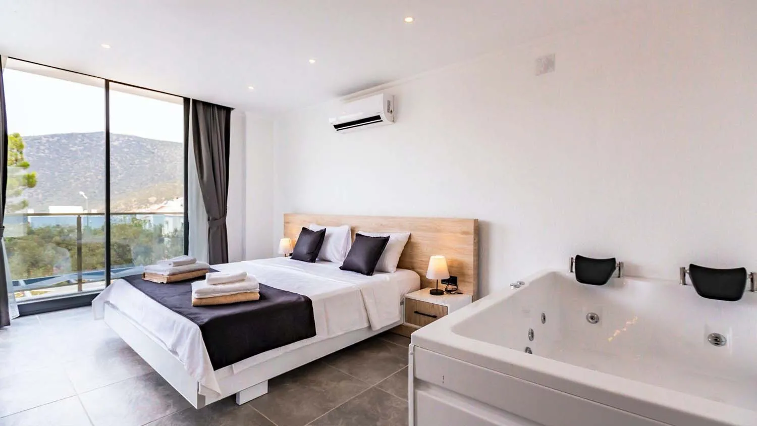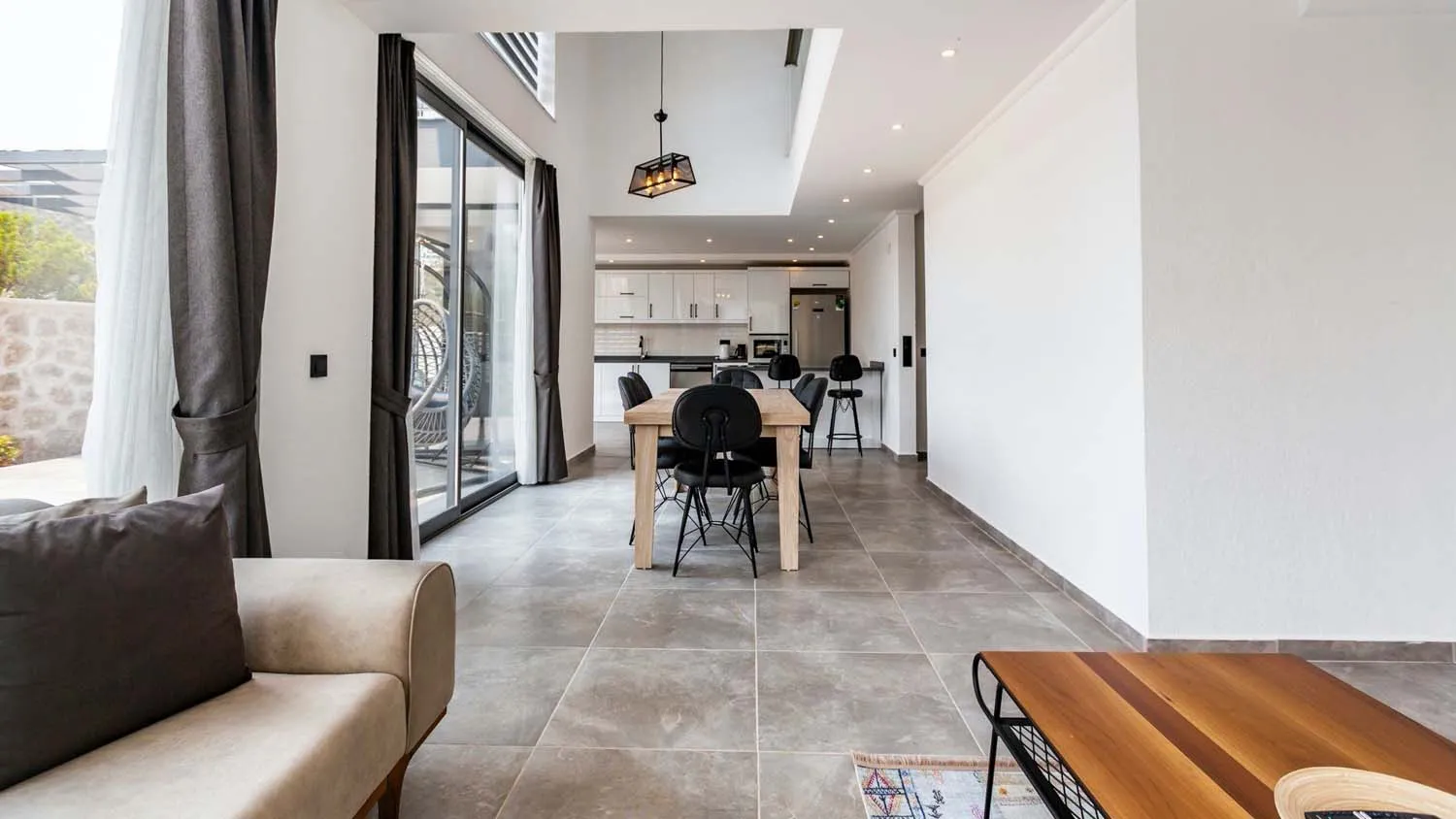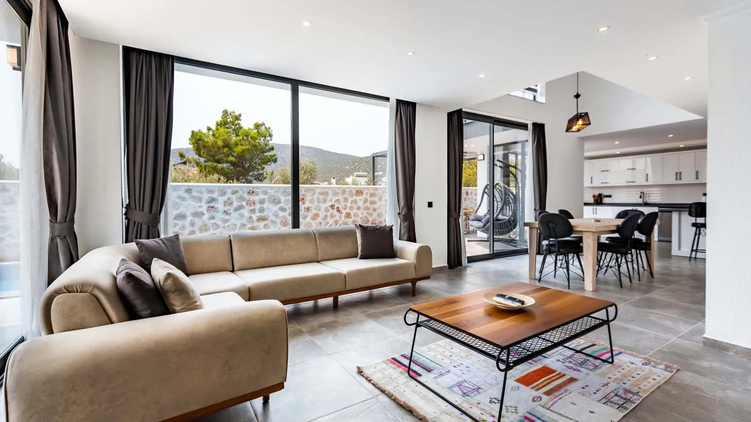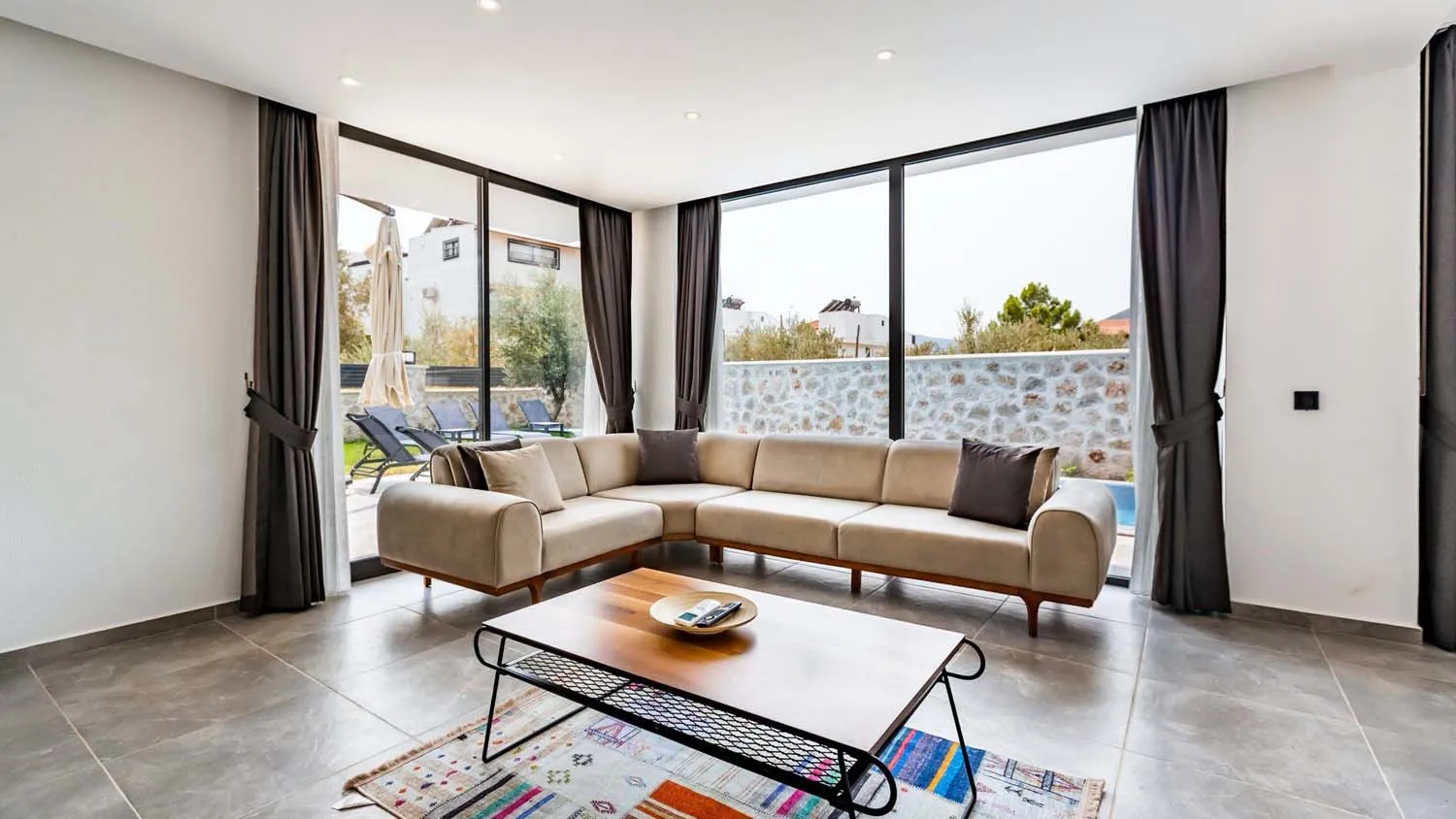 3 yatak odasına sahip olan villa, toplamda 6 kişilik kapasitesiyle aileler ve arkadaş grupları için uygundur. İç mekânda tercih edilen modern tasarım anlayışı, sade ve ferah bir yaşam alanı sunmaktadır. Salon ve mutfak bölümü günlük kullanıma uygun şekilde planlanmış olup, konforlu bir konaklama deneyimi sağlar. Yatak odalarından 2 tanesinde bulunan jakuzi, tatil süresince dinlenmek isteyen misafirler için keyifli bir detaydır.