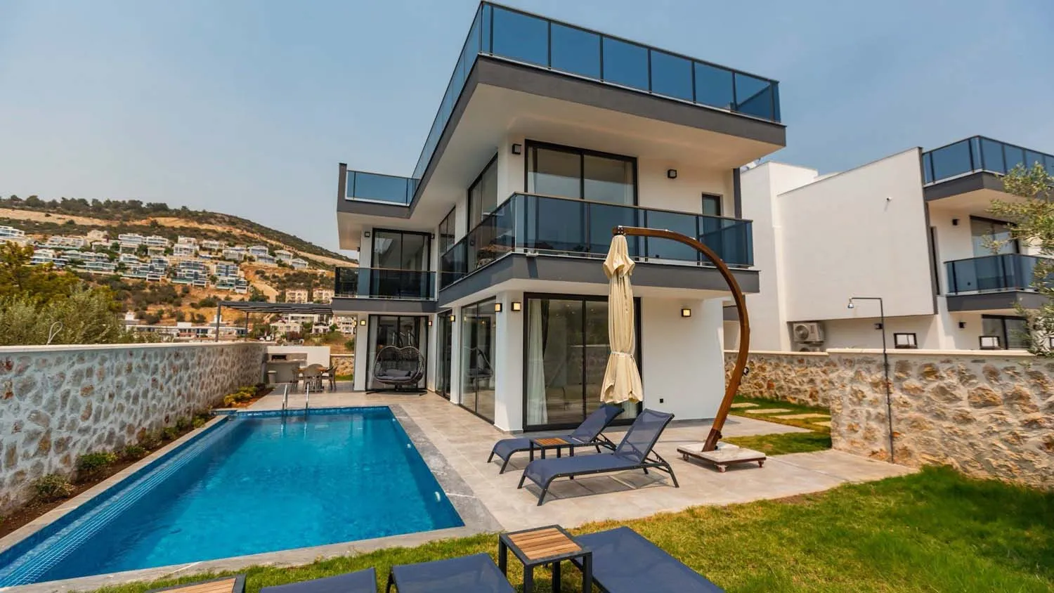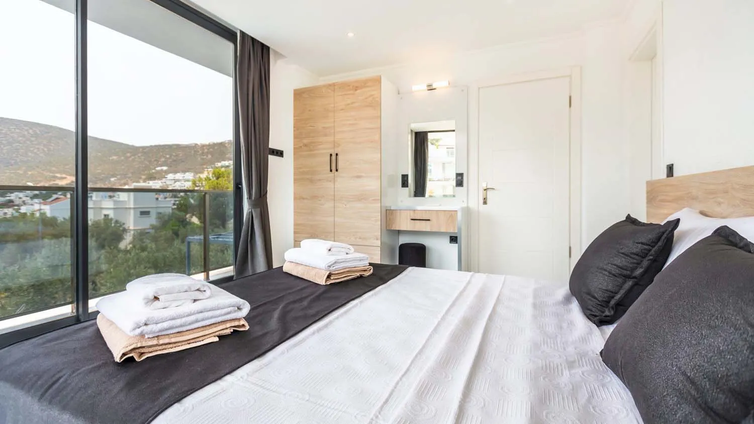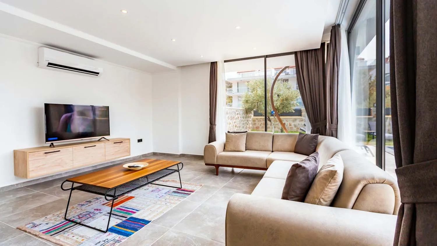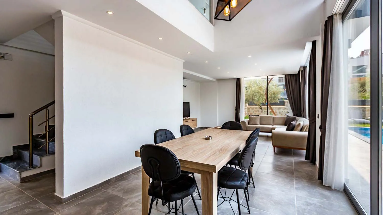 3 yatak odasına sahip olan villa, toplamda 6 kişilik kapasitesiyle aileler ve arkadaş grupları için uygundur. İç mekânda tercih edilen modern tasarım anlayışı, sade ve ferah bir yaşam alanı sunmaktadır. Salon ve mutfak bölümü günlük kullanıma uygun şekilde planlanmış olup, konforlu bir konaklama deneyimi sağlar. Yatak odalarından 2 tanesinde bulunan jakuzi, tatil süresince dinlenmek isteyen misafirler için keyifli bir detaydır.