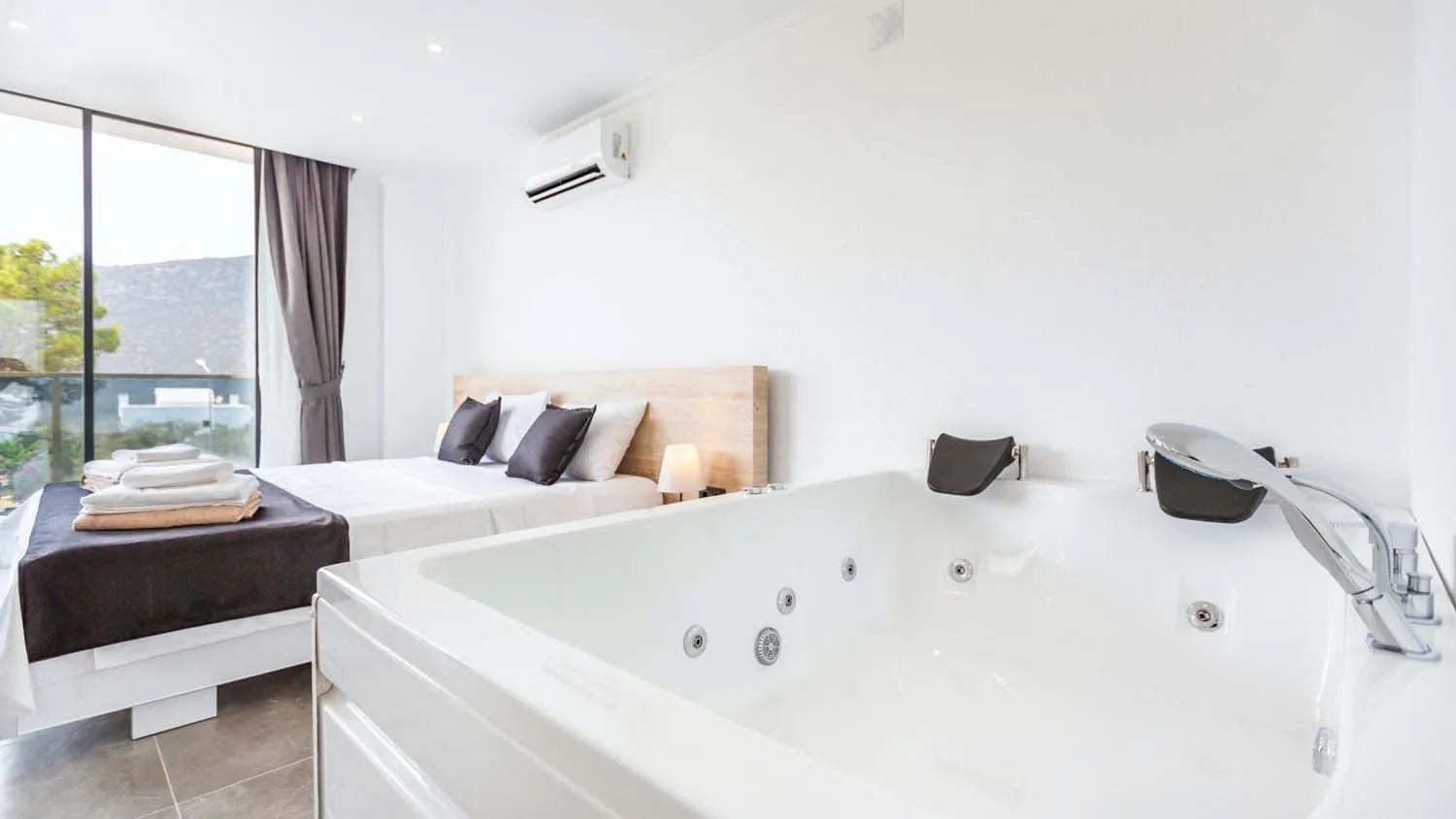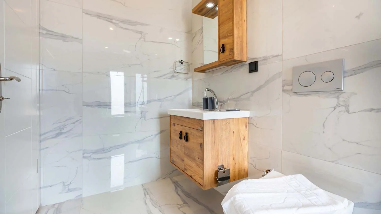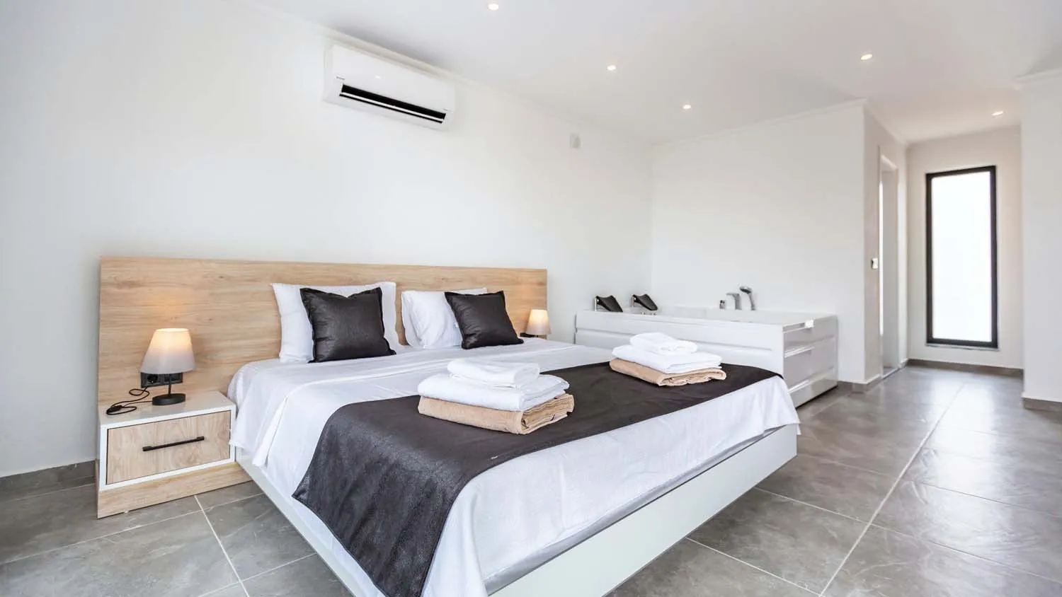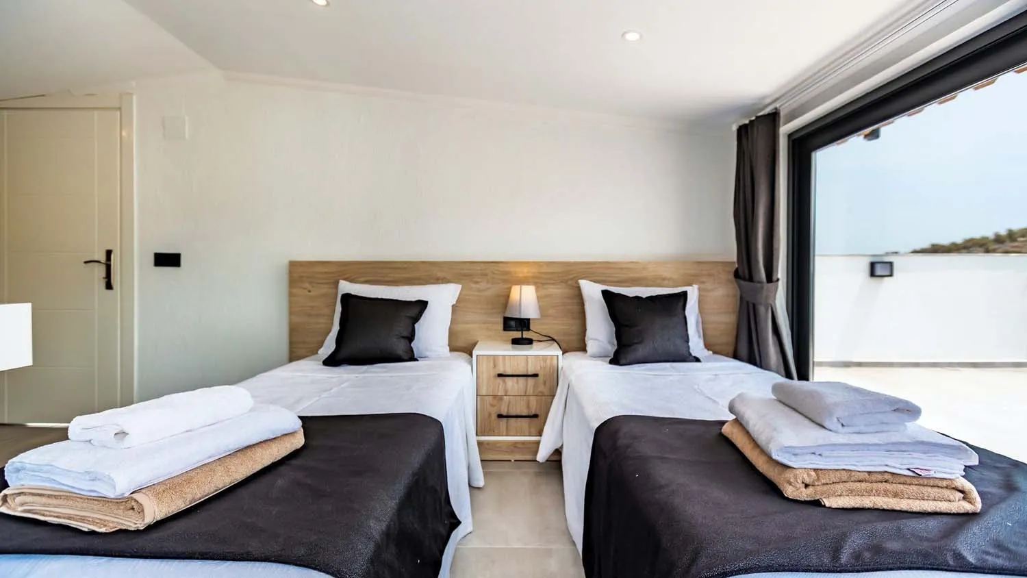 3 yatak odasına sahip olan villa, toplamda 6 kişilik kapasitesiyle aileler ve arkadaş grupları için uygundur. İç mekânda tercih edilen modern tasarım anlayışı, sade ve ferah bir yaşam alanı sunmaktadır. Salon ve mutfak bölümü günlük kullanıma uygun şekilde planlanmış olup, konforlu bir konaklama deneyimi sağlar. Yatak odalarından 2 tanesinde bulunan jakuzi, tatil süresince dinlenmek isteyen misafirler için keyifli bir detaydır.