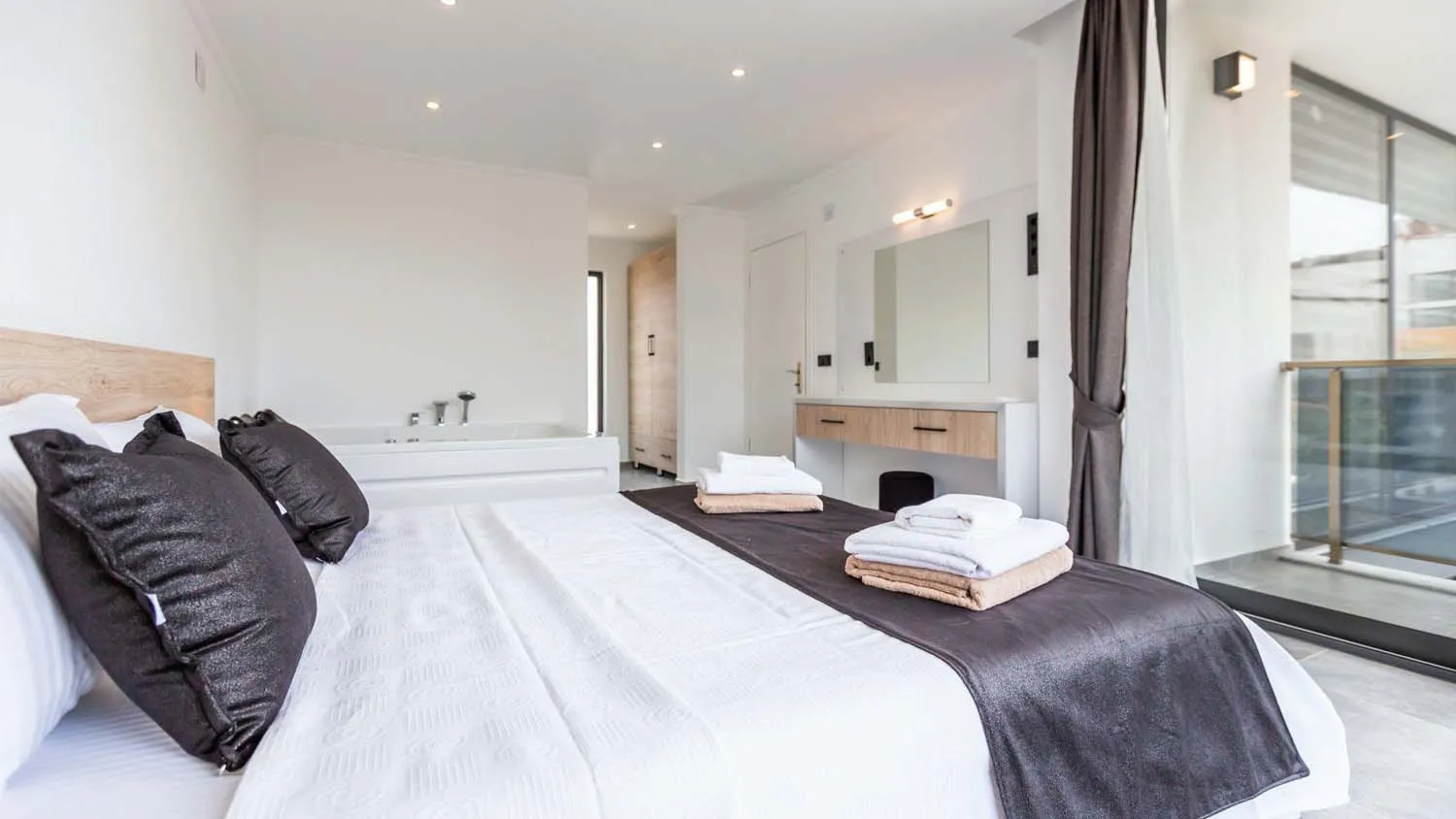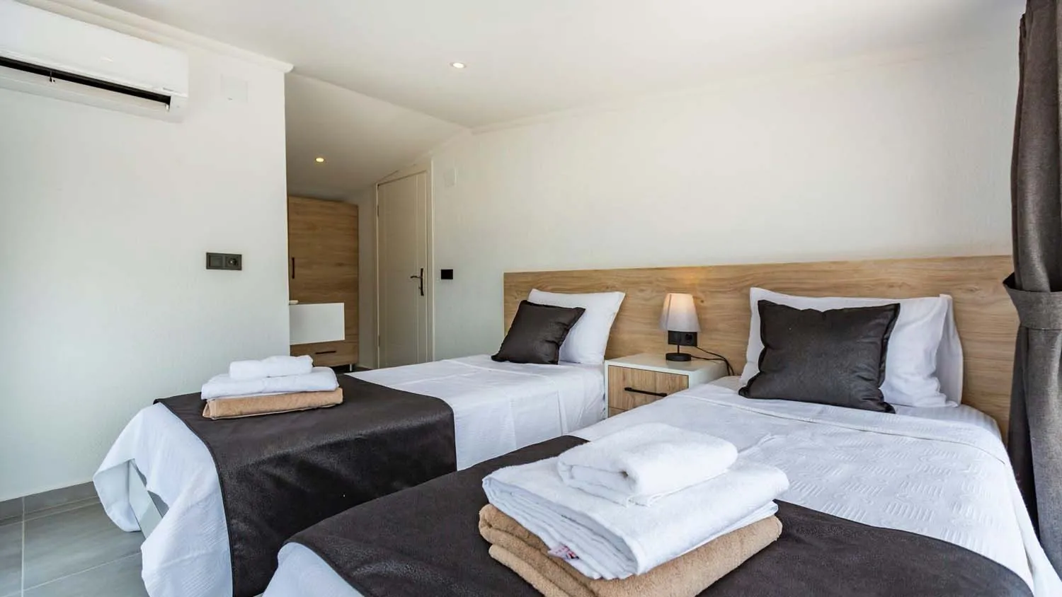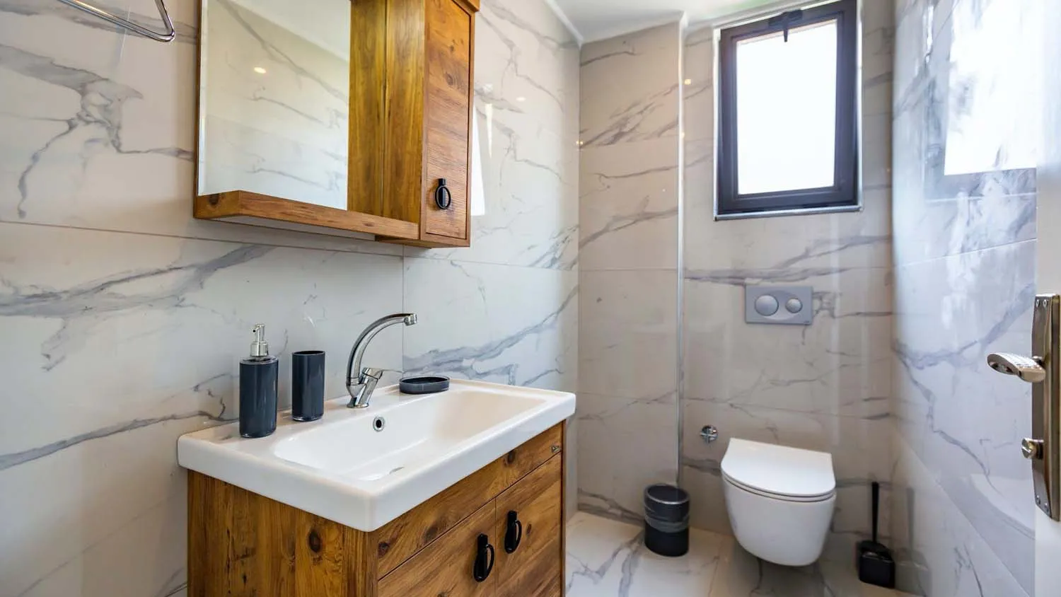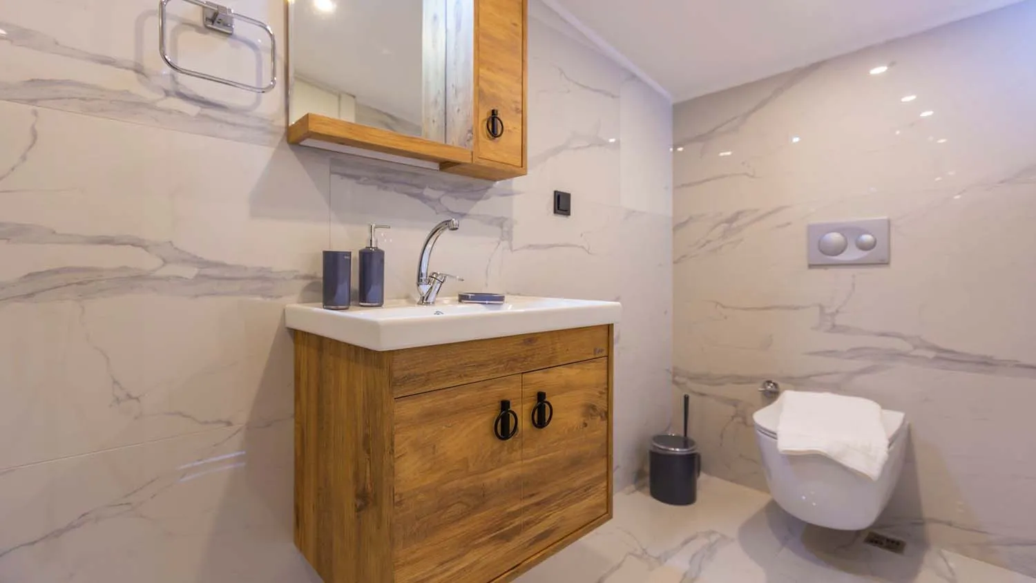 3 yatak odasına sahip olan villa, toplamda 6 kişilik kapasitesiyle aileler ve arkadaş grupları için uygundur. İç mekânda tercih edilen modern tasarım anlayışı, sade ve ferah bir yaşam alanı sunmaktadır. Salon ve mutfak bölümü günlük kullanıma uygun şekilde planlanmış olup, konforlu bir konaklama deneyimi sağlar. Yatak odalarından 2 tanesinde bulunan jakuzi, tatil süresince dinlenmek isteyen misafirler için keyifli bir detaydır.