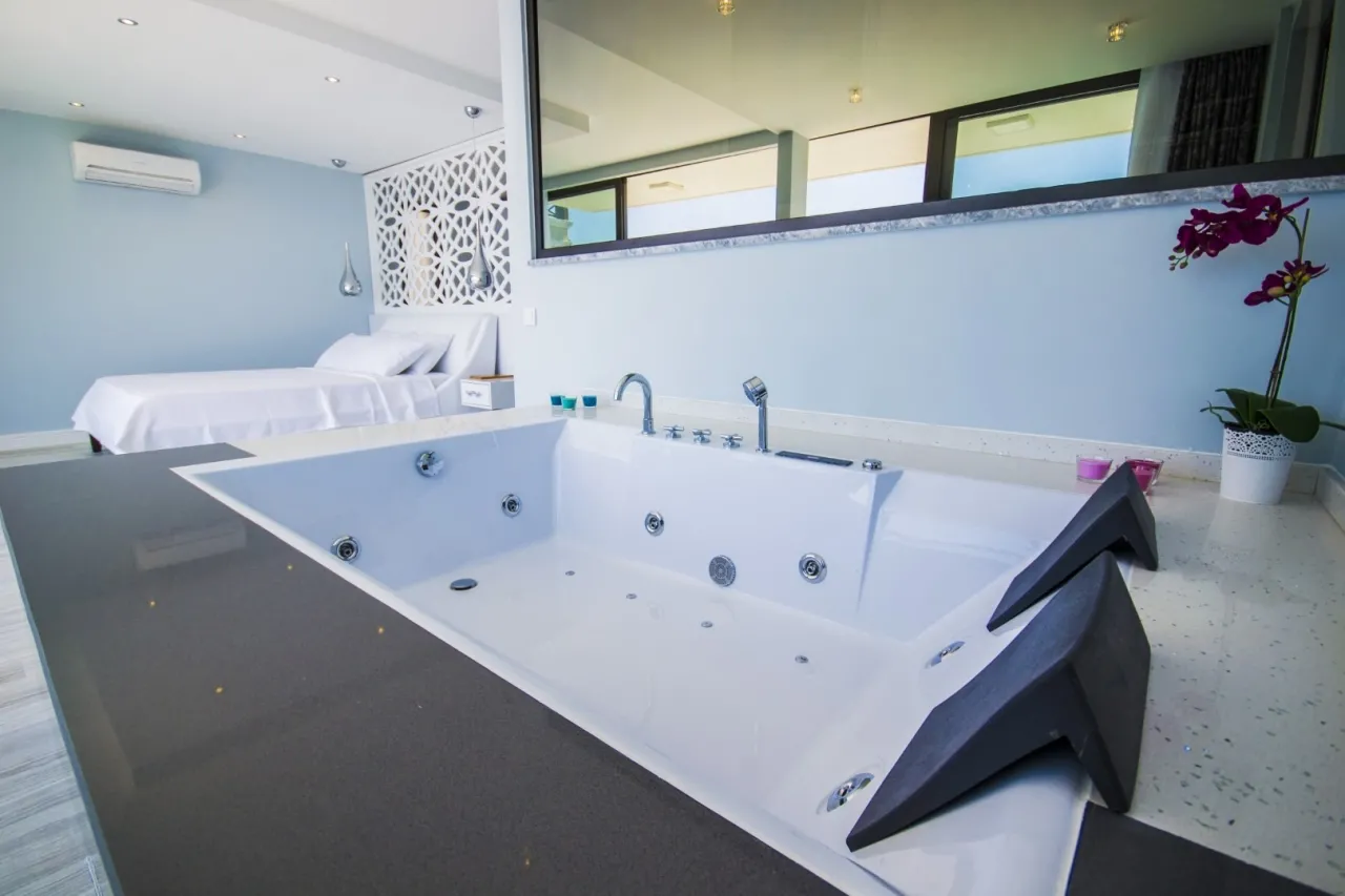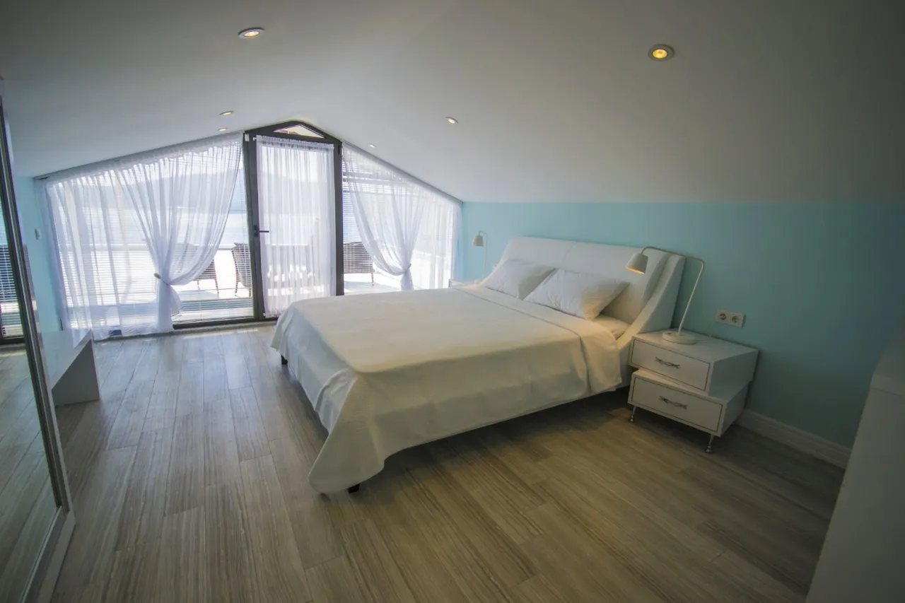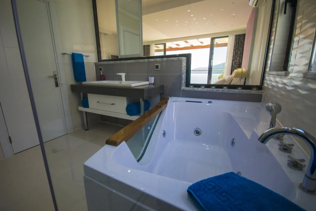 Tüm odalar ebeveyn banyolu: iki ana yatak odasında jakuzili küvet, geniş dolaplar ve makyaj masaları yer alıyor. Çatı katındaki süit oda ise rattan oturma grubuna sahip terasıyla Kalkan’ın en etkileyici gün batımlarını izlemek için ideal bir konumda.