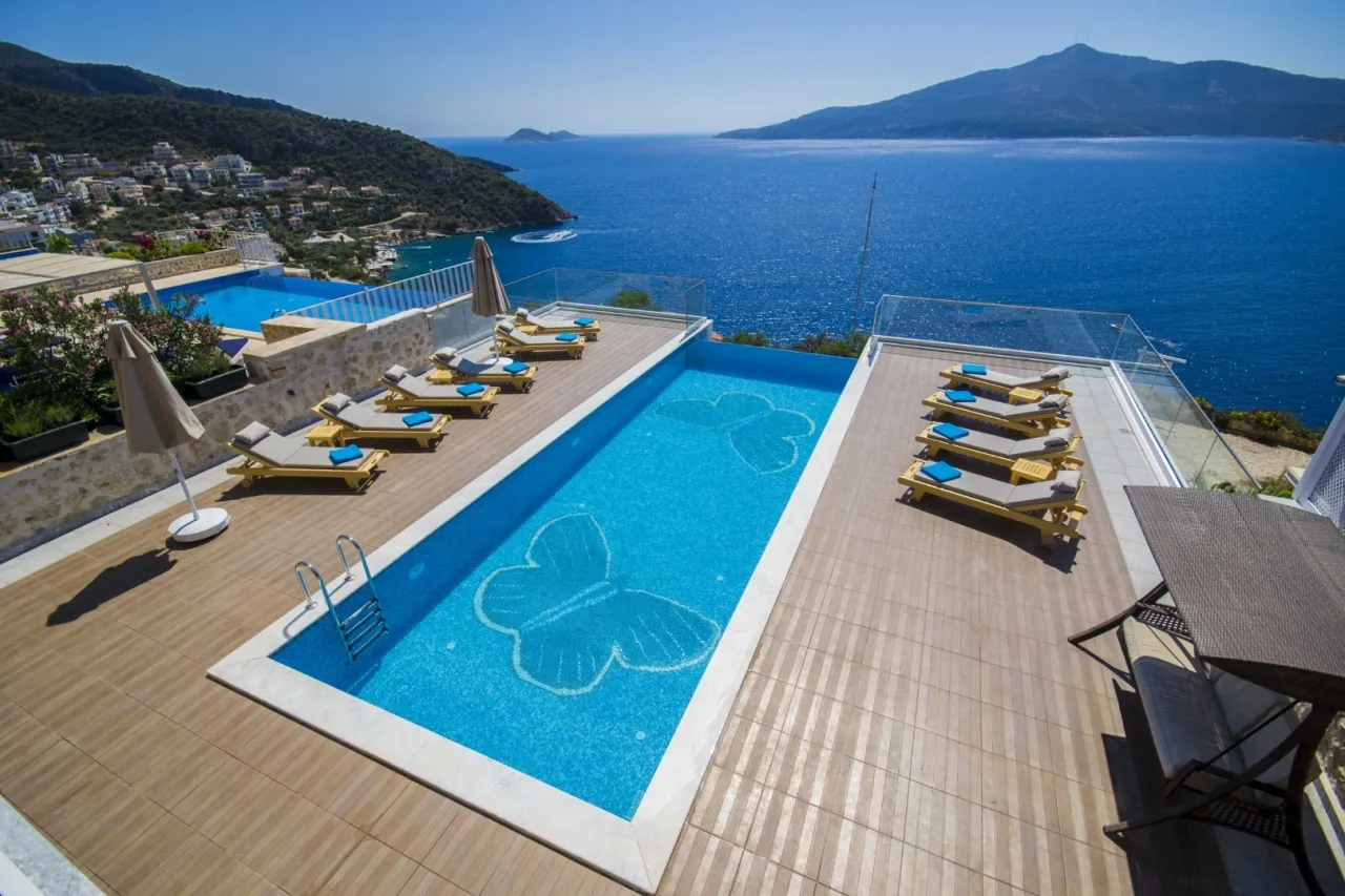 Kalkan’ın gözde Kışla bölgesinde yer alan Villa Mavi Kelebek, muhteşem Kalkan Körfezi, adalar ve gün batımı manzarasıyla ultra lüks bir tatil deneyimi sunan özel bir konaklama seçeneği. 6 süit yatak odalı geniş villada, 12 kişiye kadar kalabalık aileler ve arkadaş grupları konforla konaklayabilir.