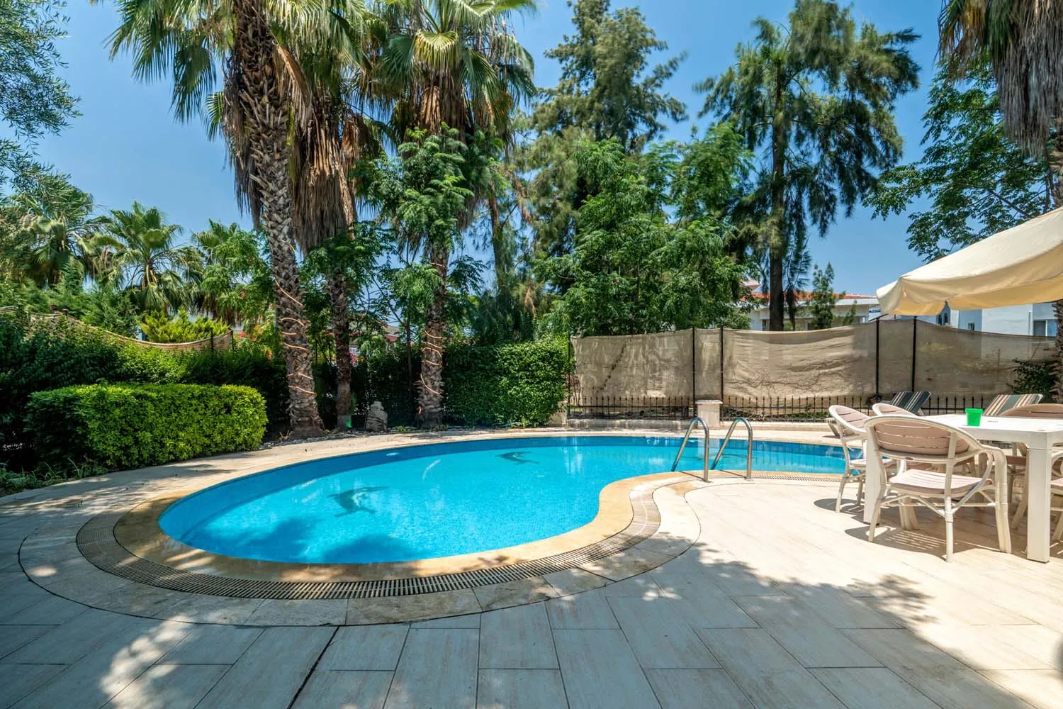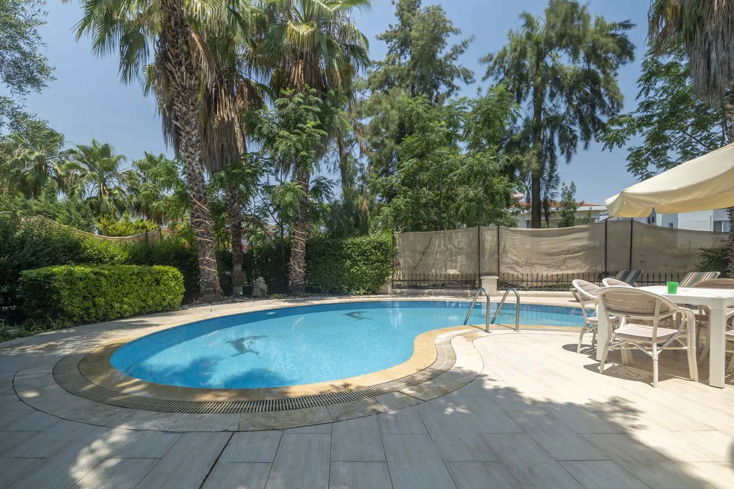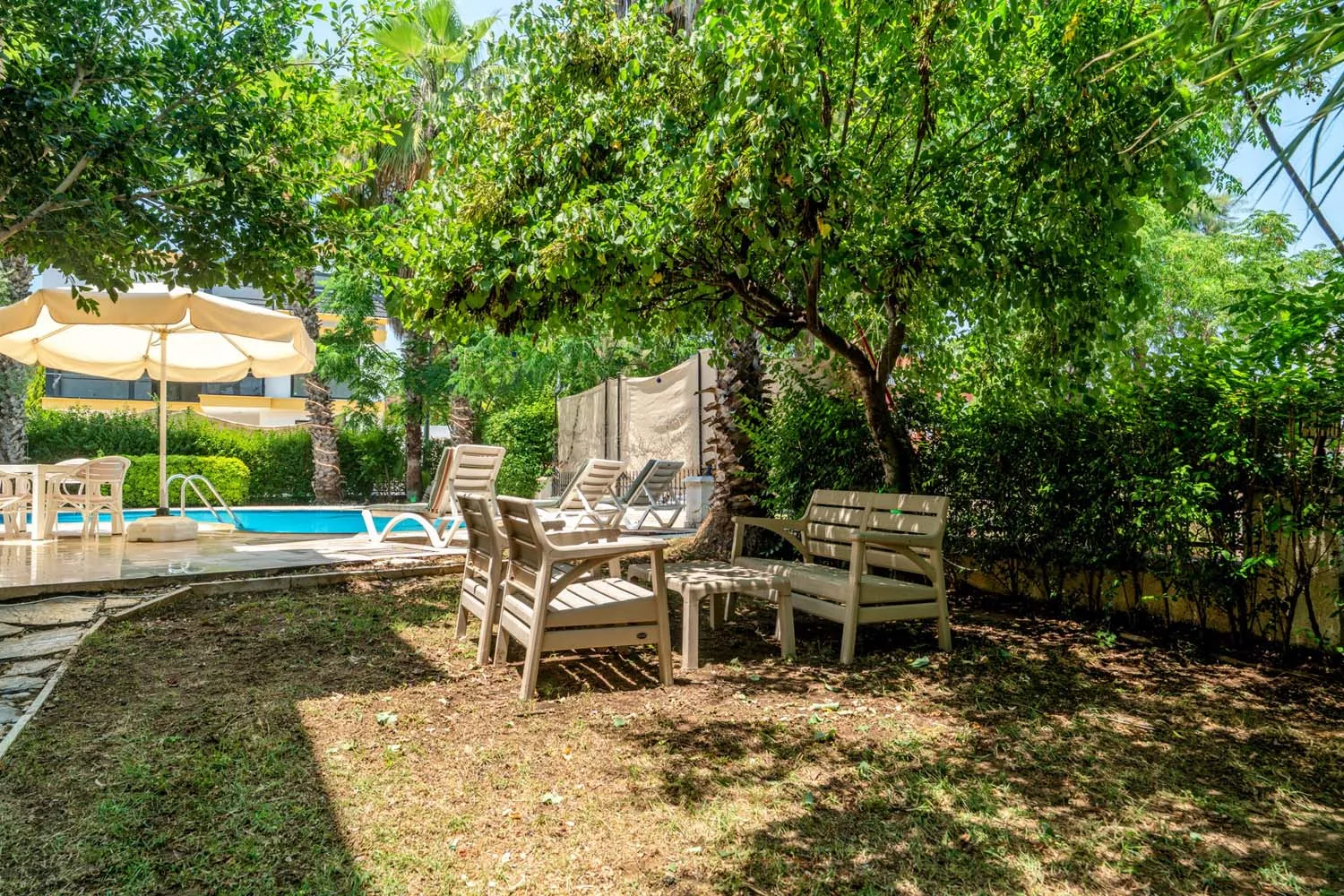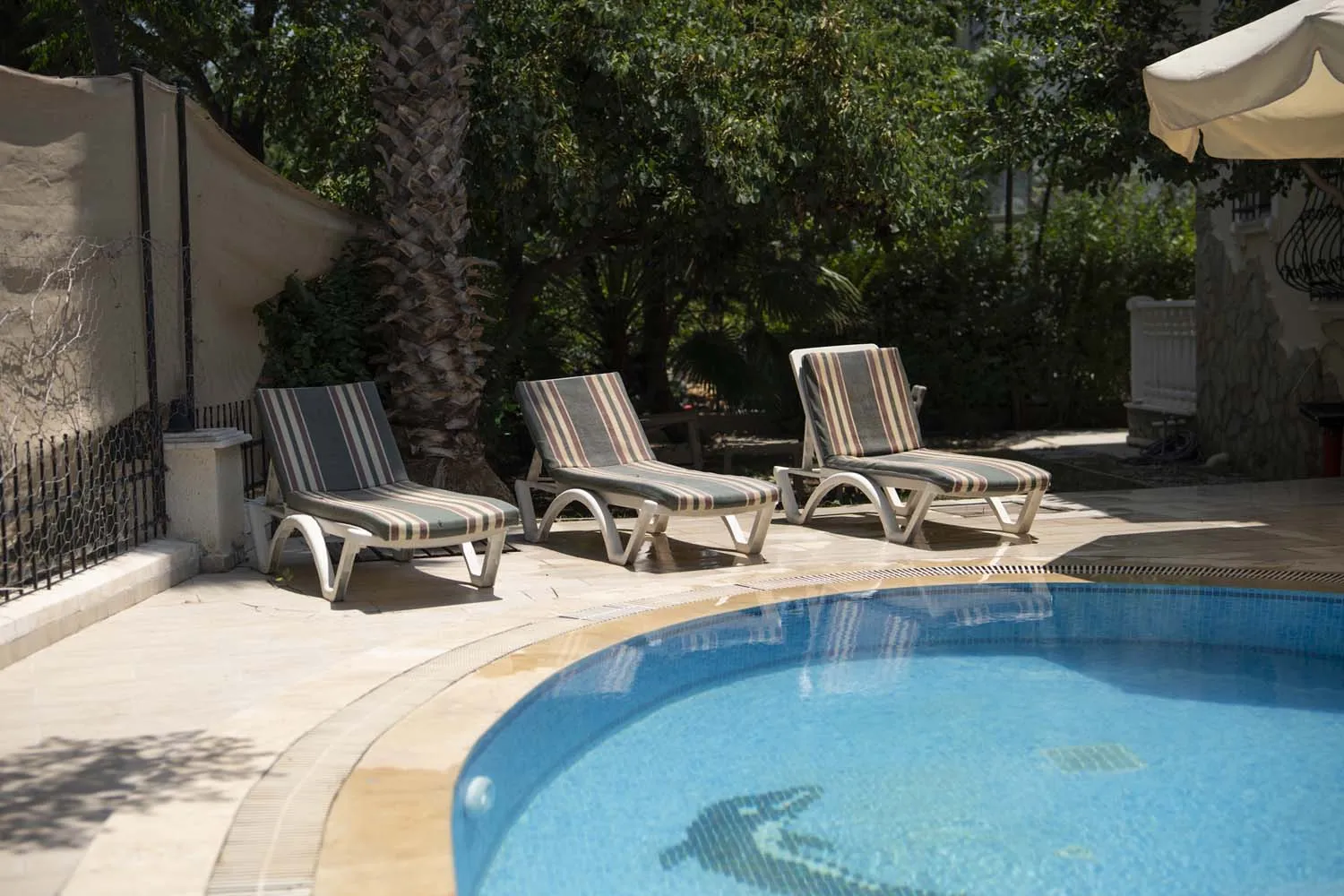 Düzenli peyzaja yeşil bir bahçe alanı, geniş güneşlenme alanı, 6 kişilik masa ve sandalye misafirlerimizin tatil boyunca faydalanabileceği alanlardır. Havuzun bulunduğu konum itibari ile villa yakınında bir bina bulunmadığı için bölgedeki en korunaklı villa özelliği göstermektedir ayrıca yaz sezonu için iç mimarisi yenilenmiş yenilenen yüzü ile hizmete sunulmaktadır. Villaya ulaşan misafirlerimiz kendilerine ait otoparka araçlarını park ederek tatillerine başlarlar.  Özel tasarım olarak en korunaklı ve  konforlu villa  grubunda yer almaktadır.