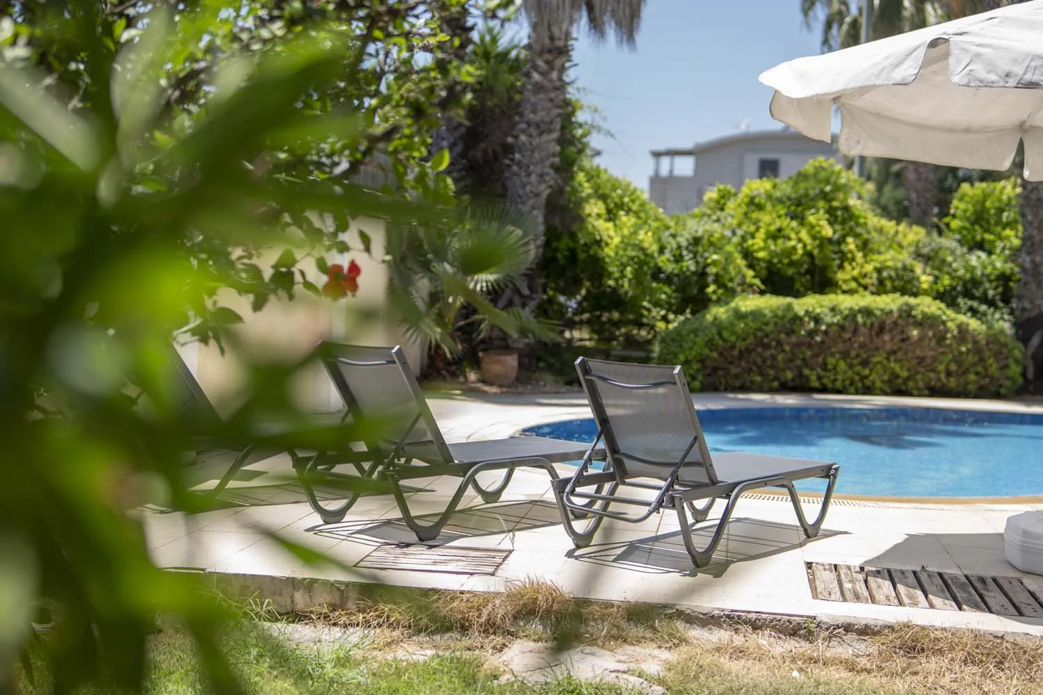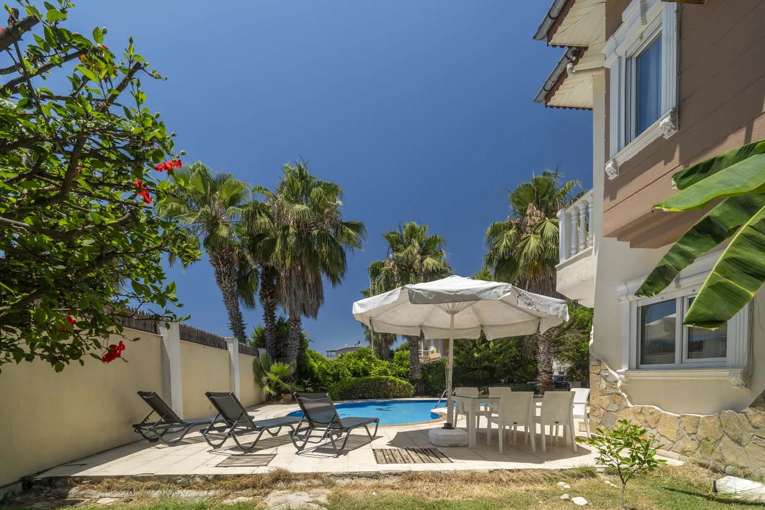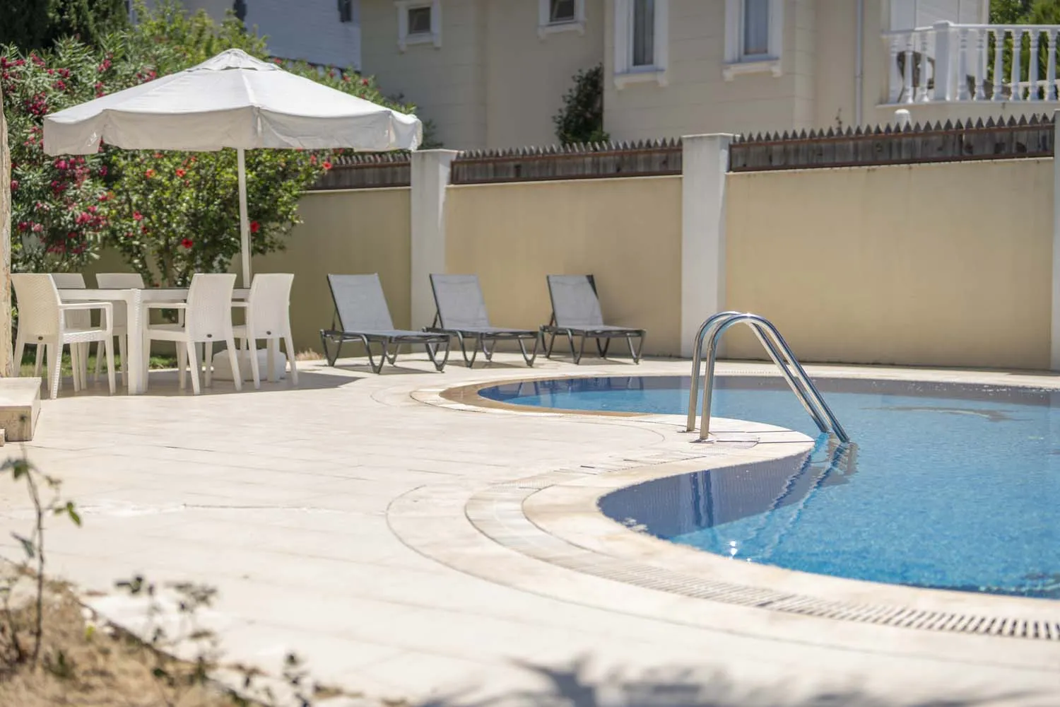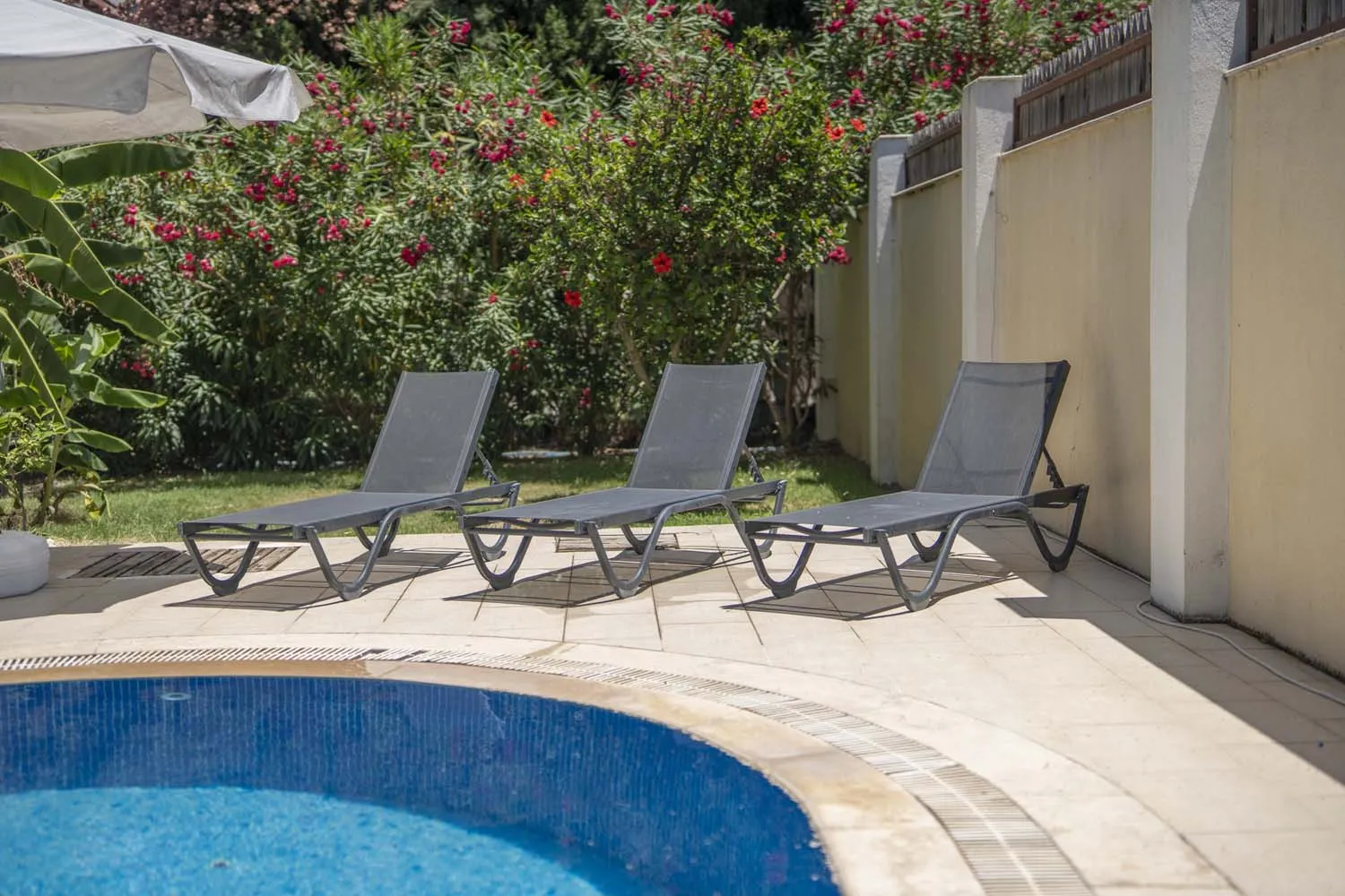Özel peyzaja sahip yeşil bir bahçe alanı ve havuz kenarında bir mangal düzeneği, geniş güneşlenme alanı, 6 kişilik masa ve sandalye misafirlerimizin tatil boyunca faydalanabileceği alanlardır. Villaya ulaşan misafirlerimiz kendilerine ait otoparka araçlarını park ederek tatillerine başlarlar.
