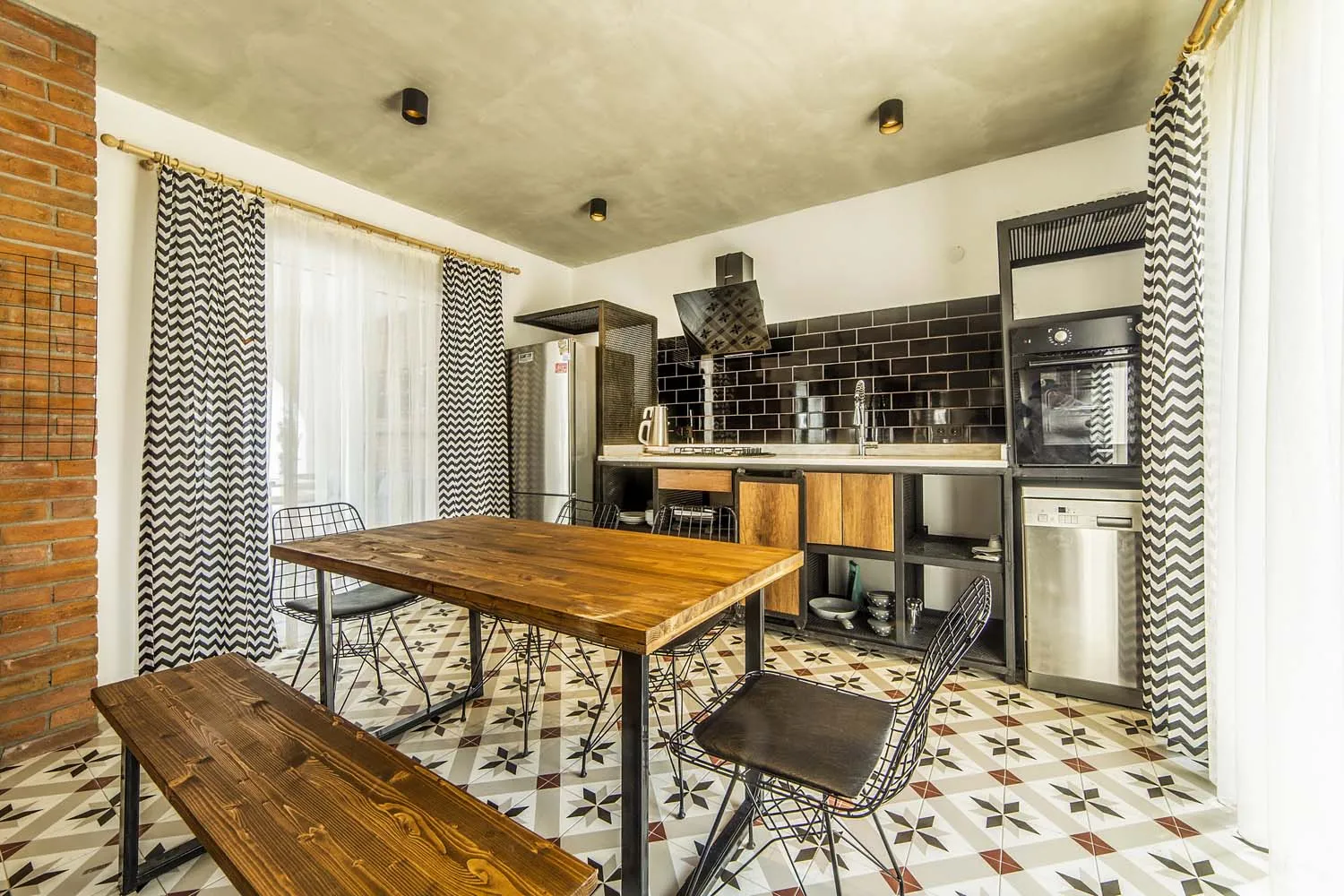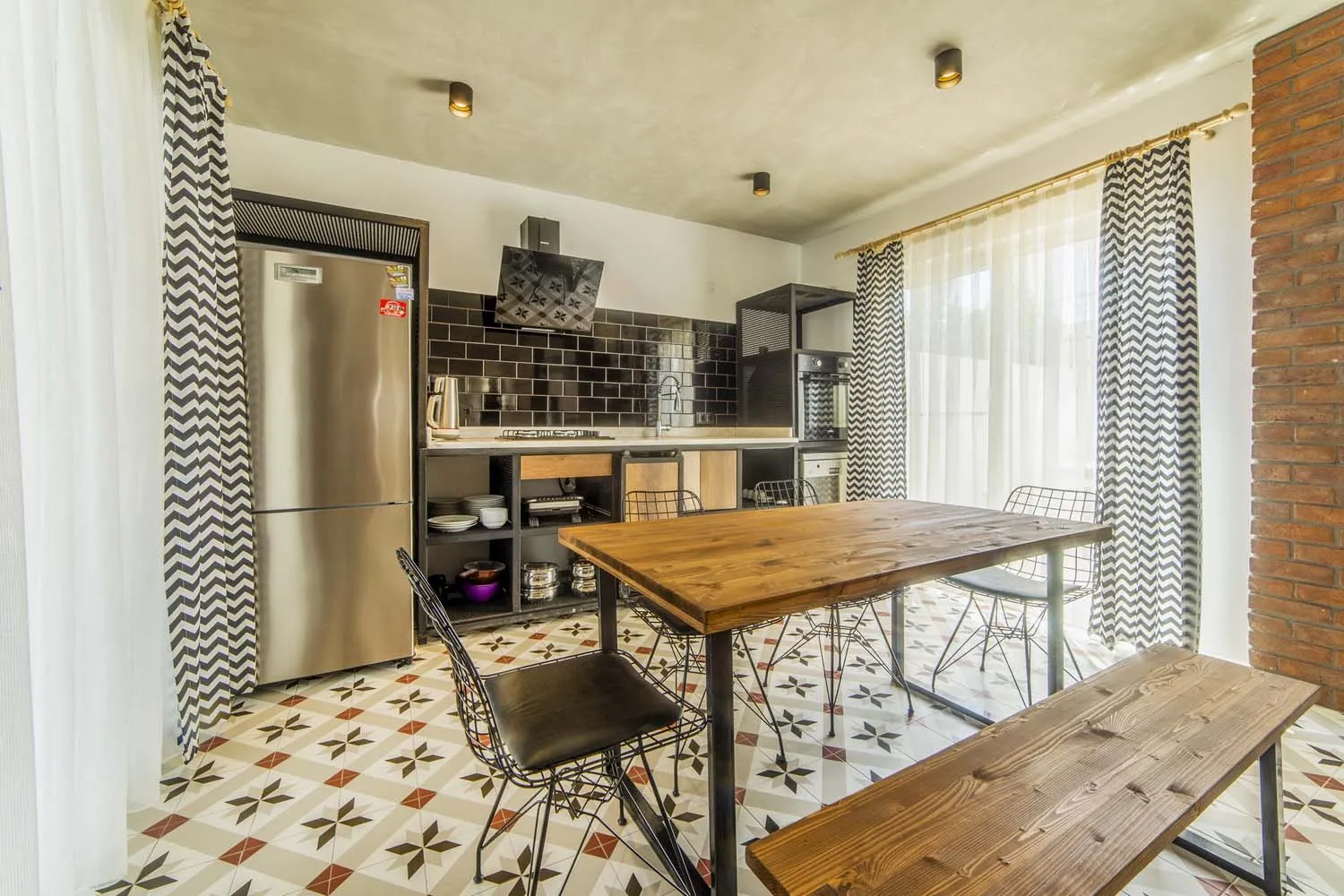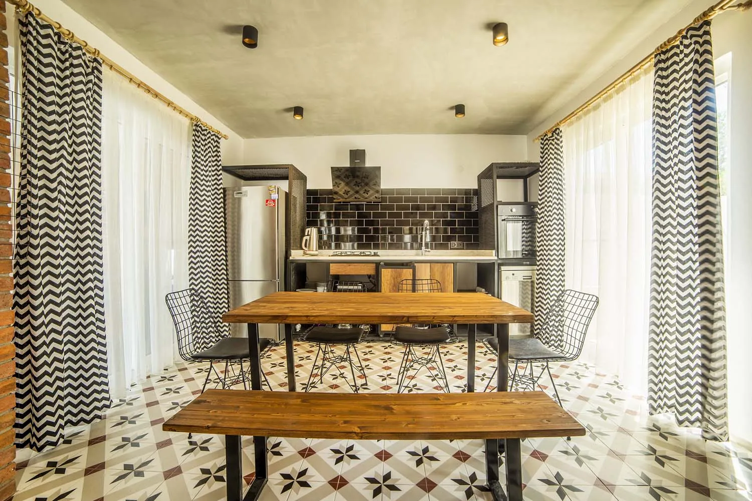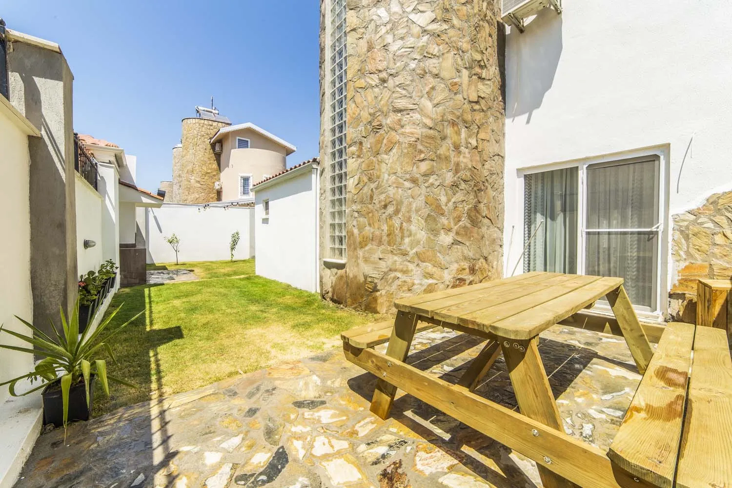 Yeşil bir arka ve ön bahçe alanı, bahçe alanında kurulu bir mangal düzeneği ayrıca giriş katında bulunan mutfağın hem havuz kısmına hem de arka bahçe kısmına açılan kapısı sayesinde ister yeşil arka bahçe alanında ister havuz kenarında bulunan geniş gölgelik alanında yer alan 6 kişilik masa ve sandalye kısmında kahvaltı, öğle ya da akşam öğünleri için kullanılabilir alanlar bulunmaktadır.