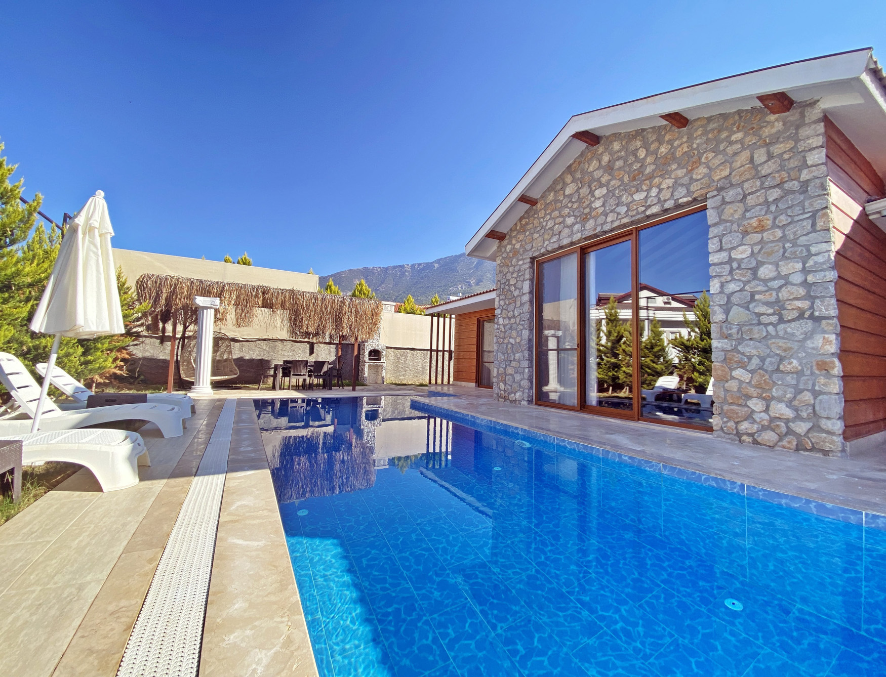 Havuz Katı Terası : Özel yüzme havuzu, Çocuk havuzu, Özel bahçe, Şezlonglar, Güneş şemsiyeleri, Güneşlenme alanı,Salıncak, BBQ (Mangal)